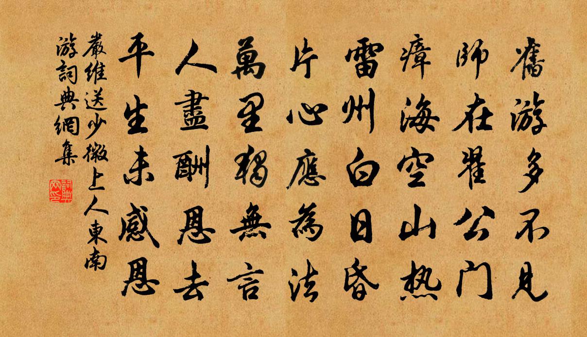詩詞名句歷史字典書法欣賞書法字典國語詞典說文解字康熙字典古漢語字典標 題 作 者 詩 句 送少微上人東南遊作者:嚴維 朝代:唐代送少微上人東南遊原文舊遊多不見,師在翟公門。瘴海空山熱,雷州白日昏。片心應為法,萬里獨無言。人盡酬恩去,平生未感恩。詩詞問答問:送少微上人東南遊的作者是誰?答:嚴維問:送少微上人東南遊寫於哪個朝代?答:唐代問:送少微上人東南遊是什麼體裁?答:五律嚴維送少微上人東南遊書法欣賞送少微上人東南遊書法作品注釋全唐詩:卷263_49詩詞推薦江城梅花引 九日杏梅同開,汪國才折以請賦張翥〔元代〕玉兒睡起帕蒙頭。更嬌柔。見郎羞。縞袂仙人,一笑艷明眸。粉瘦紅憨春夢斷,畫闌畔,對西風,憶舊遊。憶君恨辛亥二月望祭齋公因游甘園朱繼芳〔宋代〕老眼盾花興未厭,不知頭上雨廉纖。流鶯浪語春風恨,誰拗花枝插帽檐。竹李建勛〔唐代〕瓊節高吹宿鳳枝,風流交我立忘歸。最憐瑟瑟斜陽下,花影相和滿客衣。園蔬十詠芥劉子翬〔宋代〕葉實抱芳辛,氣烈消煩滯。登俎效微勞,乍食驚頻嚏。望江南/憶江南歐陽修〔宋代〕江南柳,花柳兩相柔。花片落時粘酒盞,柳條低處拂人頭。各自是風流。江南月,如鏡復如鉤。似鏡不侵紅粉面,清曉湖上三首楊萬里〔宋代〕山腰輕束一綃雲,湖面初顰半蹙痕。未說湖山佳處在,清晨小出涌金門。水調歌(人日)范成大〔宋代〕元日至人日,未有不陰時。新年葉氣,無處人物不熙熙。萬歲聲從天下,一札恩隨春到,光采動天雞。壽域遍寰海和閭丘莘叟中秋玩月吳芾〔宋代〕平生愛明月,夜坐長忘眠。每見冰輪上,兩足先跰躚。清賞意未足,常恐雲油然。老來有餘興,猶不減少年。今歲洞仙歌(填盧仝詩)晁補之〔宋代〕當時我醉,美人顏色,如花堪悅。今日美人去,恨天涯離別。青樓朱箔,嬋娟蟾桂,三五初圓,傷二八、還又缺。仲冬南樓野望陳允平〔宋代〕繡幕香溫生暮寒,淡煙漠漠水漫漫。吟殘庚嶺梅千樹,夢繞湘江竹萬竿。風卷亂鴉棲古塔,雪迷孤雁落前灘。一聲秋旅蘇轍〔宋代〕雨晴秋稼如雲屯,豆沒雞兔禾沒人。老農歡笑語行路,十年儉薄無今晨。無風無雨更一月,藜羹黍飯供四鄰。天公謝陳正字送荔支三首黃庭堅〔宋代〕橄欖灣南遠歸客,煩將嘉果送蓬門。紅衣襞積蠻煙潤,白曬丁香之子孫。邊思李益〔唐代〕腰垂錦帶佩吳鉤,走馬曾防玉塞秋。莫笑關西將家子,只將詩思入涼州。次友石台詩韻劉子翬〔宋代〕清湖嵇玉山,縹緲飛雙屐。泠風隨處流,三伏無赫赫。未成玄圃游,聊醉端州宅。憶昨陪初筵,杯搖劍峰脊。杉篁偈頌六首釋深〔宋代〕維摩默然,普賢廣說。歷代聖賢,互呈醜拙。君不見落花三月子規啼,一聲聲是一滴血。答許覺之惠桂花椰子茶盂二首黃庭堅〔宋代〕萬事相尋榮與衰,故人別來鬢成絲。欲知歲晚在何許,唯說山中有桂枝。詠牡丹王溥〔宋代〕棗花至小能成實,桑葉雖柔解吐絲。堪笑牡丹如斗大,不成一事又空枝。次督洗泯韻洪皓〔宋代〕陰山趺坐匪逃秦,杖錫聊充觀國賓。君已無家攜愛子,我雖有室別慈親。頃年共詩同文館,今日俱為異域人。千里次韻韶守狄大夫見贈二首蘇軾〔宋代〕華發蕭蕭老遂良,(褚河南帖雲,即日遂良鬚髮盡白,蓋謫長沙時也。)一身萍掛海中央。無錢種菜為家業,有病九江逢盧員外韋莊〔唐代〕前年風月宿琴堂,大媚仙山近帝鄉。別後幾沾新雨露,亂來猶記舊篇章。陶潛豈是銅符吏,田鳳終為錦帳郎。莫怪名句推薦已是懸崖百丈冰,猶有花枝俏。 * 《卜運算元·詠梅》 輕輕飛動,把賣花人搧過橋東王和卿《醉中天·詠大蝴蝶》 投策命晨裝,暫與園田疏。陶淵明《始作鎮軍參軍經曲阿作》 檳榔無柯,椰葉無陰。左思《三都賦》 柳葉隨歌皺,梨花與淚傾。黃庭堅《南歌子·槐綠低窗暗》 朝辭白帝彩雲間,千里江陵一日還。李白《早發白帝城 / 白帝下江陵》 涉江玩秋水,愛此紅蕖鮮。李白《折荷有贈》 君不見,高堂明鏡悲白髮,朝如青絲暮成雪。李白《將進酒》 驚風飄白日,忽然歸西山曹植《贈徐幹詩》 正是天山雪下時,送君走馬歸京師。岑參《天山雪歌送蕭治歸京》
