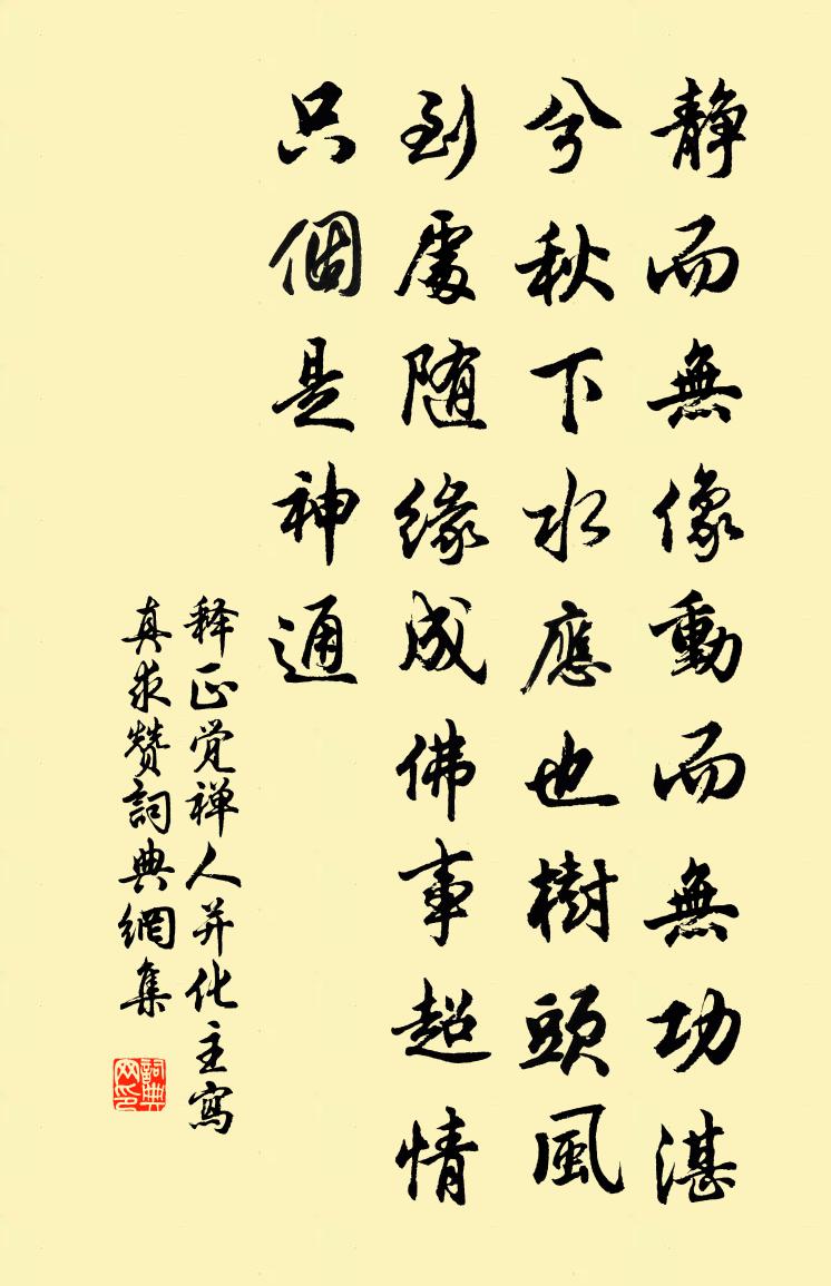 詩詞名句歷史字典書法欣賞書法字典國語詞典說文解字康熙字典古漢語字典標 題 作 者 詩 句 禪人並化主寫真求贊作者:釋正覺 朝代:宋代禪人並化主寫真求贊原文靜而無像,動而無功。湛兮秋下水,應也樹頭風。到處隨緣成佛事,超情只個是神通。詩詞問答問:禪人並化主寫真求贊的作者是誰?答:釋正覺問:禪人並化主寫真求贊寫於哪個朝代?答:宋代釋正覺禪人並化主寫真求贊書法欣賞禪人並化主寫真求贊書法作品詩詞推薦利州江潭作(感孕金輪所)李商隱〔唐代〕神劍飛來不易銷,碧潭珍重駐蘭橈。自攜明月移燈疾,欲就行雲散錦遙。河伯軒窗通貝闕,水宮帷箔卷冰綃。他時懷吳中馮秀才 [一作張祜詩,題作《楓橋》杜牧〔唐代〕長洲苑外草蕭蕭,卻算遊程歲月遙。唯有別時今不忘,暮煙秋雨過楓橋。盧直院輓詞戴栩〔宋代〕五十一回春夢中,兄悲子哭愬東風。別司制敕歸天上,不共塵凡住哉中。幌拂幽弦琴自語,奩遺殘粒藥無功。松颸眉州鹿鳴宴李石〔宋代〕大比周三歲,登名蜀一涯。聖賢元佑學,父子老蘇家。類省登槐市,清秋艷桂華。生平晁董業,親策對褒嘉。和楊遂賀雨王禹偁〔宋代〕我罷內庭職,出臨永陽民。永陽民雖庶,未免多飢貧。富之既無術,齪齪為謹身。可堪今夏旱,如燎復如焚。厥田醉書其壁辛棄疾〔宋代〕去年冠蓋長安道,客里因循過了梅。今歲花開轉多事,簿書叢里兩三杯。祭九鼎十二首真宗〔宋代〕明備崇享,聲筦鏘鏘。鏗兮佩舉,峨冠齊莊。肆陳有序,承箱是將。其牲伊何,籩豆大房。送房陵倅韋同年二首王炎〔宋代〕德齒皆兄我,曾聯淡墨名。揮犀方晤晤,浮鷁又催行。今日惟櫜矢,何人更請纓。戰塵猶未息,北望若為情。碁釋行海〔宋代〕一著臨期下手難,但尋活路向前行。從教對面成千里,黑白分明不用爭。沁園春(留春)陳人傑〔宋代〕春為誰來,誰遣之歸,挽之不還。縱小桃穠李,大都寂寞,紫薇紅藥,未到闌珊。畢竟須歸,何妨小駐,容我一尊桃源憶故人王道亨〔宋代〕劉郎自是桃花主。不許春風閒度。春色易隨風去。片片傷春暮。返魂不用清香炷。卻有梅花淡佇。從此鎮長相顧。雪葉茵〔宋代〕春意滿庭除,紅塵半點無。山川同變化,天地一模糊。石友聳冰骨,松公掀壽須。相望王子宅,不見夜篷孤。和樂天早寒劉禹錫〔唐代〕雨引苔侵壁,風驅葉擁階。久留閒客話,宿請老僧齋。酒瓮新陳接,書籤次第排。翛然自有處,搖落不傷懷。次韻劉貢父題文潞公草書蘇轍〔宋代〕鷹揚不滅少年時,墨作龍蛇紙上飛。應笑學書心力盡,臨池寫遍未裁衣。和卷中韓子蒼梅花三首蘇籀〔宋代〕先開媚晴昊,孤艷斷魂時。繞樹沈煙主,凌寒檀暉披。參橫明月觀,雪細影娥池。結實冥冥雨,君看雀啅枝。柬呂太學禎邵知柔〔宋代〕當時欲殺尚憐才,奏稿流傳讀轉哀。一寸丹心朝士愕,十分頭白道州回。汴京今日猶豺虎,陵寢多年沒草萊。聖主野亭晁公溯〔宋代〕興發尋春去,寧知生路賒。檐牙啄清漢,屐齒散平沙。風偃陵陂麥,雲垂問道花。芳菲看即過,留滯改年華。登殊亭作元結〔唐代〕時節方大暑,試來登殊亭。憑軒未及息,忽若秋氣生。主人既多閒,有酒共我傾。坐中不相異,豈恨醉與醒。漫歌孫巨源蘇軾〔宋代〕三年客京輦,憔悴難具論。揮汗紅塵中,但隨馬蹄翻。人情貴往返,不報生禍根。坐令平生友,終歲不及門。南來秋懷雍陶〔唐代〕古槐煙薄晚鴉愁,獨向黃昏立御溝。南國望中生遠思,一行新雁去汀洲。名句推薦感之欲嘆息,對酒還自傾。李白《春日醉起言志》 同是天涯淪落人,相逢何必曾相識!白居易《琵琶行 / 琵琶引》 審知四度,可以定天下,可安一國。佚名《黃帝四經·經法·四度》 無言獨上西樓,月如鉤。李煜《相見歡·無言獨上西樓》 大江東去,浪淘盡,千古風流人物。蘇軾《念奴嬌·赤壁懷古》 夫治身與治國,一理之術也。呂不韋《呂氏春秋·覽·審分覽》 傷情處,高城望斷,燈火已黃昏。秦觀《滿庭芳·山抹微雲》 能脫身牢籠外,便是大英雄。王永彬《圍爐夜話·第二八則》 實無有法佛得阿耨多羅三藐三菩提。鳩摩羅什譯《金剛經·究竟無我》 起望衣冠神州路,白日銷殘戰骨。辛棄疾《賀新郎·用前韻送杜叔高》