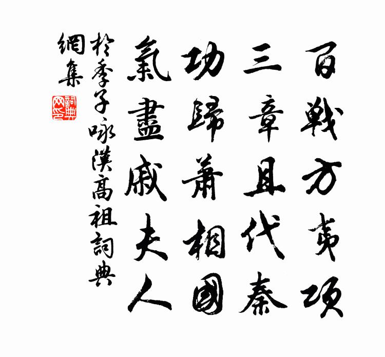詩詞名句歷史字典書法欣賞書法字典國語詞典說文解字康熙字典古漢語字典標 題 作 者 詩 句 詠漢高祖作者:於季子 朝代:唐代詠漢高祖原文百戰方夷項,三章且代秦。功歸蕭相國,氣盡戚夫人。詩詞問答問:詠漢高祖的作者是誰?答:於季子問:詠漢高祖寫於哪個朝代?答:唐代問:詠漢高祖是什麼體裁?答:五絕於季子詠漢高祖書法欣賞詠漢高祖書法作品注釋全唐詩:卷80_25詩詞推薦絕句二首杜甫〔唐代〕遲日江山麗,春風花草香。泥融飛燕子,沙暖睡鴛鴦。江碧鳥逾白,山青花欲燃。今春看又過,何日是歸年。頌古十一首釋普濟〔宋代〕肩擔口叫,曉夜撐船。道路各別,養家一般。游開元精舍韋應物〔唐代〕夏衣始輕體,游步愛僧居。果園新雨後,香台照日初。綠陰生晝靜,孤花表春餘。符竹方為累,形跡一來疏。東海有大鬆土人相傳三代時物其狀偉異詩不能張耒〔宋代〕詩翁愛花復愛柳,長歌高吟半酣酒。自言二物天下奇,愛之不厭形於詩。嗟予所愛翁未見,我昔東遊窮海甸。波濤秋枝如殘人王安石〔宋代〕秋枝如殘人,顏色先憔悴。微寒吹已空,性命一何脆。寧當記疇昔,葩葉相嫵媚。歲行誰使然,好殺豈天意。退語姜特立〔宋代〕灩澦堆邊百丈絕,宋都六鷁風逆折。曹公燒船煙焰徹,苻秦百萬走流血,未若姜子之退最通決。有所思二首曹勛〔宋代〕有所思,藐何許,乃在洞庭之陽,瀟湘之浦。我欲訪之限重陰。水有吞舟之巨魚兮,山有食人之猛虎。有所思,藐踵息齋張耒〔宋代〕物之有知者恃息,物之有息知為賊。天長地久載元氣,天地無心故無極。君知一身誰主持,六塵緣影工伎兒。發生鳴雁松林接待釋了惠〔宋代〕望見松林笑滿腮,香廚豈為者僧開。三千里外有知已,鳴雁帶書招不來。黃魯直催繡詞帖贊岳珂〔宋代〕詞以寓意,何適非理。遊戲翰墨,亦或張弛。此篇所傳,觀蠟之比。樂而不淫,庶幾在此。賢者之孝二百四十首齊孝公林同〔宋代〕豈其伐與國,獨不念先君。想得還師去,難堪此語開。縣廨海棠盛開二絕句項安世〔宋代〕梅蕊才開杏又紅,今年春事太匆匆。堂前燕子歸來到,雙海棠花已滿叢。冬日北庭懷餘杭舊僚屬蘇頌〔宋代〕曾約尋山春水間,越江吳岫遍留連。沙頭寺院看花日,湖上樓台試茗天。酒後歌呼常薄暮,風流雲散忽經年。異方關山月沈佺期〔唐代〕漢月生遼海,朣朧出半暉。合昏玄菟郡,中夜白登圍。暈落關山迥,光含霜霰微。將軍聽曉角,戰馬欲南歸。雨行梅關二首李昴英〔宋代〕濃嵐西合凍雲痴,水墨連屏斗崛奇。沖雨此行風景別,滿山翠滴水簾垂。句張載〔宋代〕無限寒鴉冒雨飛。題黃山送別圖焦煥炎〔宋代〕我家面黃山隅,面不識黃面山面。不自到黃山,見圖如不見。如何黃山客,又別黃山去。落日晚煙昏,黃山在何處詩一首王軫〔宋代〕南篇司馬青衫濕,北句郎官白髮生。堪與江黃永傳唱,離騷經外此歌聲。待旦吟二首曹勛〔宋代〕 * 水雪陰風寒,松竹半死相摧殘。嚴居谷飲蔽荊棘,藤蘿委地難躋攀。猛虎志大自羈束,易飽不及狐兔安。雞鳴送僧歸錢塘王冕〔元代〕故國荒涼草樹迷,春風猶記舊沙堤。山連天目孤雲下,潮上江頭海日低。送客過溪驚虎嘯,驅龍出洞聽猿啼。何時名句推薦歲暮陰陽催短景,天涯霜雪霽寒宵。杜甫《閣夜》 葉開隨足影,花多助重條。陰鏗《雪裡梅花詩》 投宿駸駸征騎,飛雪滿孤村。孔夷《南浦·旅懷》 至今窺牧馬,不敢過臨洮。西鄙人《哥舒歌》 群芳爛不收,東風落如糝歐陽修《春日西湖寄謝法曹歌》 芳草斷煙南浦路,和別淚,看青山朱淑真《江城子·賞春》 莫辭酒味薄,黍地無人耕。杜甫《羌村三首·其三》 天山三丈雪,豈是遠行時。李白《獨不見》 機不密,禍先行。馮夢龍《醒世恆言·卷二十》 死別已吞聲,生別常惻惻。杜甫《夢李白二首·其一》