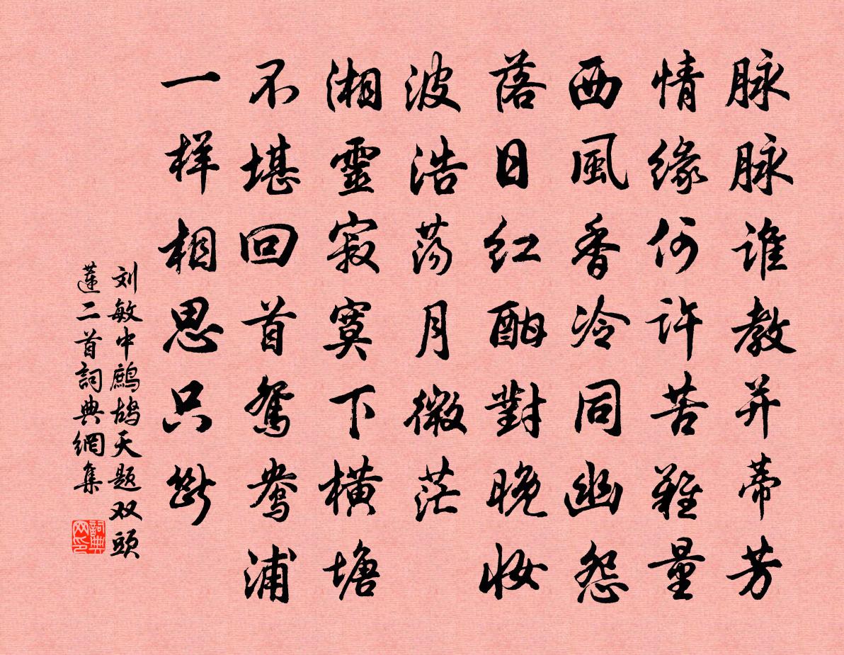 詩詞名句歷史字典書法欣賞書法字典國語詞典說文解字康熙字典古漢語字典標 題 作 者 詩 句 鷓鴣天 題雙頭蓮二首作者:劉敏中 朝代:元代鷓鴣天 題雙頭蓮二首原文脈脈誰教並蒂芳。情緣何許苦難量。西風香冷同幽怨,落日紅酣對晚妝。波浩蕩,月微茫。湘靈寂寞下橫塘。不堪回首鴛鴦浦,一樣相思只斷詩詞問答問:鷓鴣天 題雙頭蓮二首的作者是誰?答:劉敏中問:鷓鴣天 題雙頭蓮二首寫於哪個朝代?答:元代問:鷓鴣天 題雙頭蓮二首是什麼體裁?答:詞劉敏中鷓鴣天 題雙頭蓮二首書法欣賞鷓鴣天 題雙頭蓮二首書法作品詩詞推薦含笑花佚名〔宋代〕薄薄沈熏骨,英英玉煉顏。惱人風味別,斗帳夢中間。書卻暑圖後吳可〔宋代〕冰柱雪車誰復作,礬頭凌面未能摹。北窗揮汗渾無奈,漫借君家卻暑圖。似范景山陳著〔宋代〕我輩豈池蛟,飛騰此一交。天門驚路梗,冰港笑舟膠。甘甚新薇蕨,依然故草茅。從今門外事,洗耳學由巢。越中狂生題旗亭佚名〔唐代〕日日草重生,悠悠傍素城。諸侯逐兔白,夏滿鏡湖平。憶越州張士遜〔宋代〕平湖八百里多奇,君曾縱賞無餘遺。不知風月誰為主,夷猶未必如當時。一甲子前與濟源李綦儀之游從贛上今其婿謝幼周必大〔宋代〕早向短李客南康,晚識渠家玉潤郎。自笑頭顱並目睫,依然如鼠復如麞。和吳沖卿雪霽紫宸朝王安石〔宋代〕虎士開閶闔,雞人唱九霄。雲移銀闕角,日轉玉廊腰。箒動川收潦,靴鳴海上潮。舞袍沾宿潤,拜笏擁殘飄。賜飲宣和癸卯登浮光山郝某〔宋代〕呼舟入境陟崔嵬,今日登臨慰昔懷。覽勝凌虛緣絕磴,憑高索句付磨崖。松聲夜落千年洞,山勢晴連萬里淮。仙跡冰井任詔〔宋代〕驅車出東門,弭節訪冰井。寺古棟宇傾,碑折苔蘚屏。源泉池中生,瑩淨可監影。命僧旋汲之,入口勝霜冷。試烹二月一日夜夢陸游〔宋代〕夢裡遇奇士,高樓酣且歌。霸圖輕管樂,王道探丘軻。大指如符券,微瑕互琢磨。相知殊恨晚,所得不勝多。勝算九日亦好園小集喻良能〔宋代〕疏雨蕭蕭岩桂香,西風驅冷作重陽。池塘秋草還爭綠,籬落寒花未肯黃。又是一年新度節,何妨九客共飛觴。園亭將往江淮,寄李十九儋韋應物〔唐代〕燕燕東向來,文鵷亦西飛。如何不相見,羽翼有高卑。徘徊到河洛,華屋未及窺。秋風飄我行,遠與淮海期。回首京都旅臥曾豐〔宋代〕喜得家書睡不成,擁衾欹枕數寒更,衝風勿板俄驚曉,映日紗窗又報晴。蹀躞過橋朝馬響,咄嗟爭道擔夫聲。利名至揚州文天祥〔宋代〕悵悵乾坤靡所之,平山風露夜何其。翁翁豈有甘心事,何故高樓鼓角悲。送任梅叔赴州教授項安世〔宋代〕楚船西上蜀東圻,茆滑芹香水半圍。養就鯤鱠觀海運,哺成鸞鵠教天飛。行化石照銅梁外,人指蓬山藏室歸。喚起中秋感懷二首宋白〔宋代〕雲彩冰光似去年,雲年人月兩嬋娟。今宵不辨連明坐,拚醉抽身黑處眠。送陳粹洪咨夔〔宋代〕泊然無營如子云,撓之不濁如黃憲。清靜勿擾如曹參,躬行不言如石建。古人與稽今人居,外若不足中有餘。治中榜書軒曰景白以爐香事樂天像因題詩六韻其上張鎡〔宋代〕賢如文正及文忠,迂叟東坡盡學公。自願人才雖太遠,仰希閒樂或相同。墅邱寺觀游須遍,台榭舟橋樂未窮。酩酊贈張仲謀黃庭堅〔宋代〕車如雞棲馬如狗,閉門常多出門少。去天尺五張公子,官居城南池館好。健兒快馬紫游韁,迎我不知沙路長。高榆次韻答張沙河黃庭堅〔宋代〕張侯堂堂身八尺,老大無機如漢陰。猛摩虎牙取吞噬,自嘆日月不照臨。策名日已污軒冕,逃去未必焚山林。我評名句推薦長安大雪天,鳥雀難相覓。張孜《雪詩》 一山飛峙大江邊, 躍上蔥蘢四百旋 * 《七律·登廬山》 若農服田力穡,乃亦有秋。佚名《尚書·商書·盤庚上》 亂雲低薄暮,急雪舞迴風。杜甫《對雪》 不信樓頭楊柳月,玉人歌舞未曾歸。謝枋得《蠶婦吟》 翠輦不來金殿閉,宮鶯銜出上陽花雍陶《天津橋望春》 家必自毀,而後人毀之。孟子《孟子·離婁章句上·第八節》 光陰似箭,日月如梭吳承恩《西遊記·第八回》 去年夜半橫江夢,倚危檣,參差曾賦劉辰翁《桂枝香· * 人去》 危樓高百尺,手可摘星辰。李白《夜宿山寺》
