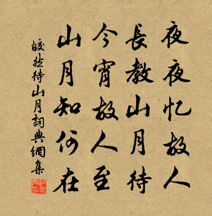 詩詞名句歷史字典書法欣賞書法字典國語詞典說文解字康熙字典古漢語字典標 題 作 者 詩 句 待山月作者:皎然 朝代:唐代待山月原文夜夜憶故人,長教山月待。今宵故人至,山月知何在。詩詞問答問:待山月的作者是誰?答:皎然問:待山月寫於哪個朝代?答:唐代問:待山月是什麼體裁?答:五古皎然待山月書法欣賞待山月書法作品注釋全唐詩:卷818-74詩詞推薦逍遙詠宋太宗〔宋代〕詩中包異境,解者不為非。深信含玄理,幽通是可依。達人皆論道,狂酒敗稜威。浩渺寰瀛內,寒暄隱聖機。琴操十首。履霜操韓愈〔唐代〕(尹吉甫子伯奇無罪,為後母譖而見逐,自傷作。本詞云:朝履霜兮采晨寒,考不明其心兮信讒言。孤恩別離兮摧高相宅白居易〔唐代〕青苔故里懷恩地,白髮新生抱病身。涕淚雖多無哭處,永寧門館屬他人。靈門寺贈靈一上人朱放〔唐代〕所思勞旦夕,惆悵去湘東。禪客知何在,春山幾處同。獨行殘雪裡,相見暮雲中。請住東林寺,彌年事遠公。七愛詩贈程鄉令趙君魏鄴令西門豹蒲壽宬〔宋代〕吾愛西門豹,其事深可傚。波神豈荒淫,巫言亦機巧。大嫗去不來,小嫗足踸踔。豪長涕叩頭,從此識政教。雜興利登〔宋代〕我昔此園游,寒梅吐孤艷。重來幾何間,叢青倏以遍。誰雲花與葉,同樹不相見。衢州雜興二首葉適〔宋代〕玉研朱弓不可尋,暖風催綠麥成陰。越山行盡見平野,江上水流無逝音。地跨京師都邑壯,俗兼吳楚智謀深。詔書頌古一百二十一首釋宗杲〔宋代〕雲門舉起竹篦,開口知君話墮。上方香積不餐, * 食人涕唾。詠菊魏野〔宋代〕榮雖花同雨露,花晚不怨乾花坤。五色花中偏貴,千花後獨尊。馨非慚黍稷,采合勝蘋蘩。蛺蝶寒猶至,鷦鷯靜亦金玉吟邵雍〔宋代〕良金美玉信難偕,好物其來最受埋。盜跖免兵非積善,仲尼無土反成猜。中孚既若須為信,無妄因何卻有災。莫若寄竹隱先生孫應時劉過〔宋代〕竹湖人之英,劇縣勇自試。三年川桃李,遣愛及僮稚。鹹欲父母之,謂吾公之子。獨有督郵嫌,見謂不事事。瑕疵柳朱端常〔宋代〕絲絲煙雨弄輕柔,偏稱黃鳥與白鷗。才著一蟬嘶晚日,西風容易便成秋。愚實報詩繆瑜〔宋代〕郁攸屬者潛煽災。蜚廉縱風相與偕。林林生齒七萬戶,連甍接棟燒成灰。如何老翁一區宅,間不以寸獨不{左火右行役有嘆二首楊萬里〔宋代〕百年幾暄涼,再歲三征行。卻羨路旁叟,白首不到城。人生如風花,去來能與爭。且隨風吹起,會當風自停。檄中原陳宓〔宋代〕大哉我宋得天下,仁比三代澤過之。太祖太宗貽典則,真宗仁考父母慈。熙豐足國振百度,要使宇內無蠻夷。哲宗思大禪師贊釋慧開〔宋代〕一生討頭不見,二生骨露皮穿。三生造成地獄,全身活陷黃泉,七十二峰俱坐斷,口吞佛祖在機先。宿西林寺白居易〔唐代〕木落天晴山翠開,愛山騎馬入山來。心知不及柴桑令,一宿西林便卻回。[柴桑令,劉遺民是也。]無題效商隱體四首楊維楨〔元代〕當軒隊子立紅靴,龜甲屏鳳擁絳紗。公子銀瓶分汗酒,佳人金勝剪春花。曲調青鳳歌聲轉,觥進黃鵝舞勢斜。五十偶侍郡侯游群玉浪吟二絕聊記歲月時淳佑乙巳趙與泳〔宋代〕玲瓏奇石繞林間,屈曲高低未易攀。非斧非斤誰運巧,偏來琢就此蓬山。水龍吟(寄袁竹初)張炎〔宋代〕幾番問竹平安,雁書不盡相思字。籬根半樹,村深孤艇,闌乾屢倚。遠草兼雲,凍河膠雪,此時行李。望去程無數名句推薦江上月明胡雁過,淮南木落楚山多。劉長卿《江州重別薛六柳八二員外》 惜恐鏡中春。不如花草新。張先《菩薩蠻·憶郎還上層樓曲》 白鳥朱荷引畫橈,垂楊影里見紅橋,欲尋往事已魂消。王士禎《浣溪沙·紅橋》 太平本是將軍定,不許將軍見太平。施耐庵《水滸傳·第一百一十四回》 離堂思琴瑟,別路繞山川。陳子昂《春夜別友人二首·其一》 兒童強不睡,相守夜歡嘩。蘇軾《守歲》 兩岸桃花烘日出,四圍高柳到天垂。姜彧《浣溪沙·山滴嵐光水拍堤》 玉樓深鎖薄情種。清夜悠悠誰共。秦觀《桃源憶故人·玉樓深鎖薄情種》 我來一長嘆,知是東溪蓮。白居易《京兆府栽蓮》 萬里無人收白骨,家家城下招魂葬。張籍《征婦怨》