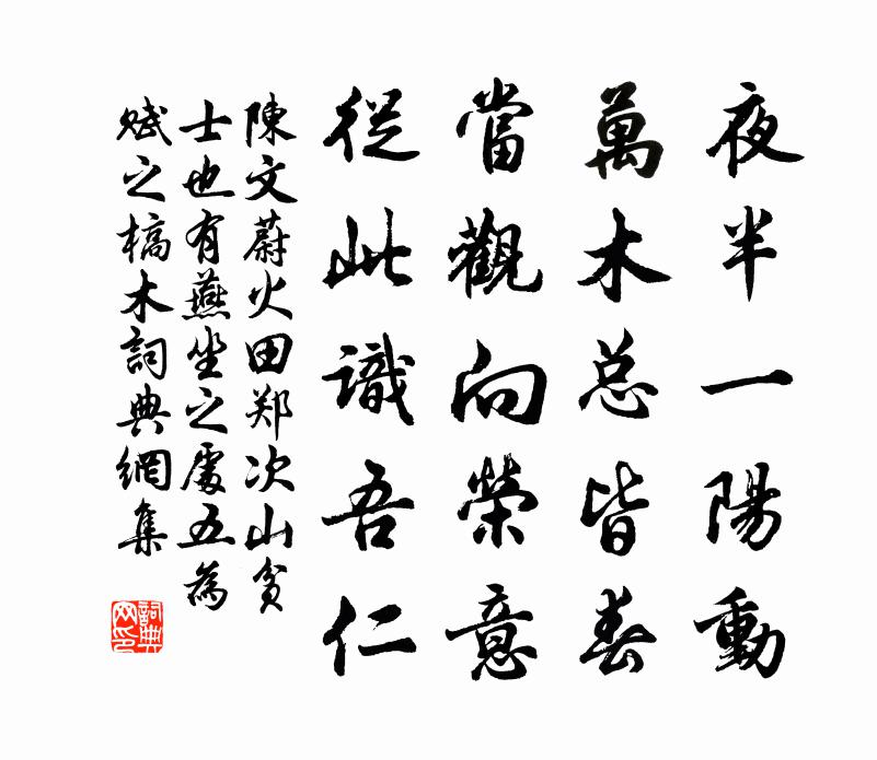 詩詞名句歷史字典書法欣賞書法字典國語詞典說文解字康熙字典古漢語字典標 題 作 者 詩 句 火田鄭次山貧士也有燕坐之處五為賦之槁木作者:陳文蔚 朝代:宋代原文夜半一陽動,萬木總皆春。當觀向榮意,從此識吾仁。詩詞問答問:《火田鄭次山貧士也有燕坐之處五為賦之槁木》的作者是誰?答:陳文蔚問:該詩寫於哪個朝代?答:宋代書法欣賞火田鄭次山貧士也有燕坐之處五為賦之槁木書法作品詩文賞析【原題】:火田鄭次山貧士也有燕坐之處五為賦之·槁木寮詩詞推薦挽秦國夫人李流謙〔宋代〕齎說端由帝,生申未許崧。神功資鍊石,吉夢托占熊。赫赫扶天業,堂堂浴日忠。芝麟昭聖瑞,何力贊元工。題李上謨壁李商隱〔唐代〕舊著思玄賦,新編雜擬詩。江庭猶近別,山捨得幽期。嫩割周顒韭,肥烹鮑照葵。飽聞南燭酒,仍及撥醅時。頌古三十三首釋師觀〔宋代〕墮落眉須不得塔,三文使盡風分疏。無端大嶺重饒舌,數丈龜毛舉世無。魯連子引諺佚名〔先秦〕百足之蟲。三斷不蹶。心誠憐。白髮玄。情不怡。艷色媸。晚晴書事呈同舍陸游〔宋代〕魚復城邊夕照紅,物華偏解惱衰翁。巴鶯有恨啼芳樹,野水無情人故宮。許國漸疏悲壯志,讀書多忘媿新功。因君憶長安。六月佚名〔唐代〕憶長安,六月時,風台水榭逶迤。朱果雕籠香透,分明紫禁寒隨。塵驚九衢客散,赭珂滴瀝青驪。送廣東潘帥移鎮湖南十口號曾豐〔宋代〕珠商貝客市門聽,牙儈閒邊自品評。郡將不收蕃船物,今年價比向年平。瑞香花蘇大璋〔宋代〕芳蕤何蒨絢,尤物真旖旎。五葉映雕闌,三椏駢粉蕊。妍分春月魂,香徹肌骨髓。長相思韓疁〔宋代〕杜娘家。謝娘家。樓壓官橋柳半遮。簾波漾彩霞。拾飛花。怨飛花。望斷郎來日又斜。東風吹鬢鴉。又和洪咨夔〔宋代〕天時人事共流通,何用將冰語夏蟲。判為梅花多釀酒,春風裹著蜜翁翁。觀德堂李垂〔宋代〕園池氣象明,池沼春波平。東匯有朝勢,北源無滯聲。臨流好鼓瑟,待月堪浮觥。濯足思餘綠,洗心思雲清。篆溝句施德操〔宋代〕春風兩岸客來往,紅日一川鶯去留。池蛙宋祁〔宋代〕越國車前矜勇甚,子陽井底太驕生。乘時不羨雲溟樂,口作儀同鼓吹聲。贈張慈寶五行精到奇中陳杰〔宋代〕大慈寺里談天寶,蜀產凋零此亦奇。借 * 支作正鵠,驗渠禍福似蓍龜。李虛中術曾無失,絳老人年漫不知。大運陳覺放還至泰州惟詩風寄作此答之徐鉉〔唐代〕朱雲曾為漢家憂,不怕交親作世仇。壯氣未平空咄咄,狂言無驗信悠悠。今朝我作傷弓鳥,卻羨君為不繫舟。勞寄清平樂王安石〔宋代〕留春不住,費盡鶯兒語。滿地殘紅宮錦污,昨夜南園風雨。小憐初上琵琶,曉來思繞天涯。不肯畫堂朱戶,春風自點絳唇(別帥憲)洪适〔宋代〕天末相逢,醉中不訝車茵污。一聲鳴櫓。驚散眠沙鷺。我是行人,卻送行人去。聽金縷。莫辭甘醑。別淚飛寒雨。正仲思歸作篆畦今夜月十詩非篆畦月乃雁蒼月舒岳祥〔宋代〕篆畦今夜月,故意照人衰。一夢十年過,千愁萬里來。只今安粵徼,何日悔輪台。吟罷四百字,更傾三五杯。偈頌三十首釋慧暉〔宋代〕不夜真燈,破夜心月。穿日玄談,不日妙訣。一句瞭然,不涉途轍。南歌子·槐綠低窗暗黃庭堅〔宋代〕槐綠低窗暗,榴紅照眼明。玉人邀我少留行。無奈一帆煙雨、畫船輕。柳葉隨歌皺,梨花與淚傾。別時不似見時情名句推薦宴爾新婚,以我御窮。佚名《谷風》 招魂楚些何嗟及,山鬼暗啼風雨。元好問《摸魚兒·雁丘詞 / 邁陂塘》 夫孝,天之經也,地之義也,民之行也。孔子及其弟子《孝經·三才》 雁聲不到東籬畔,滿城但、風雨淒涼吳文英《惜黃花慢·菊》 野客預知農事好,三冬瑞雪未全消。戴復古《除夜》 語來江色暮,獨自下寒煙。李白《尋雍尊師隱居》 春夢隨雲散,飛花逐水流,寄言眾兒女,何必覓閒愁。曹雪芹《紅樓夢·第五回》 謹身節用,以養父母孔子及其弟子《孝經·庶人》 獨倚危欄,神遊無際,天地猶嫌隘。朱栴《念奴嬌·雪霽夜月中登樓望賀蘭山作》 有不虞之譽,有求全之毀。孟子《孟子·離婁章句上·第二十一節》