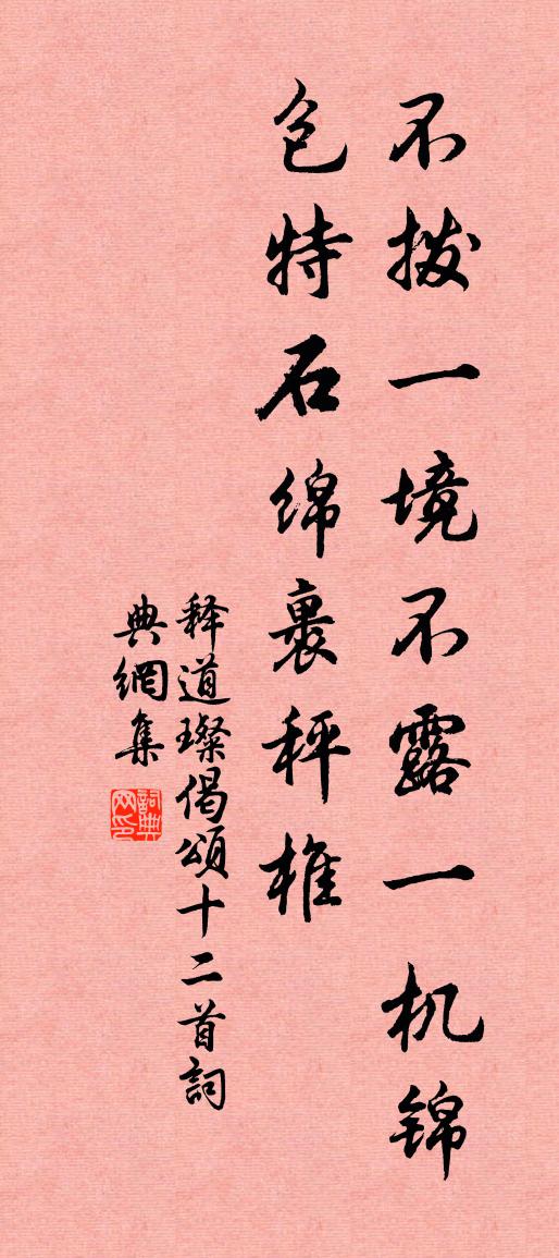 詩詞名句歷史字典書法欣賞書法字典國語詞典說文解字康熙字典古漢語字典標 題 作 者 詩 句 偈頌十二首作者:釋道璨 朝代:宋代偈頌十二首原文不撥一境,不露一機。錦包特石,綿裹秤椎。詩詞問答問:偈頌十二首的作者是誰?答:釋道璨問:偈頌十二首寫於哪個朝代?答:宋代釋道璨偈頌十二首書法欣賞偈頌十二首書法作品詩詞推薦贈逸民詩 十蕭衍〔南北朝〕風光綠野。日照青丘。孺鳥初飛。新泉始流。乘輿攜手。連步同游。采芳中阿。折華道周。任情止息。隨意去留。寄征人廉氏〔唐代〕淒淒北風吹鴛被,娟娟西月生蛾眉。誰知獨夜相思處,淚滴寒塘蕙草時。淮南送友人歸滄州李頻〔唐代〕風色忽西轉,坐為千里分。高帆背楚落,寒日逆淮曛。斷燒緣喬木,盤雕隱片雲。鄉關百戰地,歸去始休軍。憶昨陸游〔宋代〕入蜀還吳跡已陳,蘭亭道上又逢春。諸君試取吾詩看,何異前身與後身?次韻穎仲蘭室這什李彌遜〔宋代〕黃卷青燈寄佛場,孤高如在遠林芳。下帷誰識傳經董,載酒時過尚白揚。華發同心猶有臭,青衿入室自知香。公卿西風張耒〔宋代〕西風吹屋絡緯鳴,星河錯落已三更。軍城傳警萬家靜,山堂含風遙夜清。雲收纖月映山盡,天轉北斗向江傾。舍南詠雨·其二李世民〔唐代〕和氣吹綠野,梅雨灑芳田。新流添舊澗,宿霧足朝煙。雁濕行無次,花沾色更鮮。對此欣登歲,披襟弄五弦。次韻秦少游王仲至元日立春三首蘇軾〔宋代〕詞鋒雖作楚騷寒,德意還同漢詔寬。好遣秦郎供帖子,盡驅春色入毫端。富貴邵雍〔宋代〕富貴如將智力求,仲尼年少合封侯。世人不解青天意,空使身心半夜愁。郴江百詠並序東樓阮閱〔宋代〕危城雉堞對東山,誰創高樓十二欄。獨鶴不來松已老,春風動處日三竿。岳州九日宴道觀西閣張說〔唐代〕搖落長年嘆,蹉跎遠宦心。北風嘶代馬,南浦宿陽禽。佳此黃花酌,酣餘白首吟。涼雲霾楚望,濛雨蔽荊岑。登眺大有·九日潘希白〔宋代〕戲馬台前,採花籬下,問歲華、還是重九。恰歸來、南山翠色依舊。簾櫳昨夜聽風雨,都不似、登臨時候。一片宋南溪有會景亭,處眾亭之間,無所見,甚不稱蘇軾〔宋代〕飛檐臨古道,高榜勸遊人。未即令公隱,聊須濯路塵。茅茨分聚落,煙火傍城闉。林缺湖光漏,窗明野意新。居民又用韻楊冠卿〔宋代〕弱水蓬山到者稀,凌空須仗羽輪飛。群仙拍手山頭笑,笑我漂零胡不歸。送族兄太初再游廬山黎廷瑞〔宋代〕家山豈不好,更欲訪廬君。應意麋鹿友,其如鴻雁群。江湖秋渺渺,道路雨紛紛。歲晚成歸否,高山有白雲。次韻仁近九日予病不出方回〔宋代〕炎涼飄忽嘆如流,久客仍逢歲不秋。高處未應堪著眼,悶中惟可獨搔頭。市酤太惡難沾醉,晴色良佳竟倦遊。戲馬游法華寺宋之問〔唐代〕高岫擬耆闍,真乘引妙車。空中結樓殿,意表出雲霞。後果纏三足,前因感六牙。宴林薰寶樹,水溜滴金沙。寒谷蓮浦謠溫庭筠〔唐代〕鳴橈軋軋溪溶溶,廢綠平煙吳苑東。水清蓮媚兩相向,鏡里見愁愁更紅。白馬金鞭大堤上,西江日夕多風浪。荷心用汪彥章內翰諸公韻二首呈信字仲並〔宋代〕王門一歲幾經過,客裹承顏未厭多。詩卷心胸傾錦繡,珍庖盤釜薦麟駝。自慚淮海可憐客,每費江湖無盡波。玉樹句祝慶夫〔宋代〕冰雪凝難解,風雲慶有時。名句推薦竹憐新雨後,山愛夕陽時。錢起《谷口書齋寄楊補闕》 不食人間煙火。袁枚《隨園詩話·補遺 卷九》 誰人背後無人說,哪個人前不說人?佚名《增廣賢文·上集》 風吹仙袂飄颻舉,猶似霓裳羽衣舞白居易《長恨歌》 誰家玉笛暗飛聲,散入春風滿洛城。李白《春夜洛城聞笛 / 春夜洛陽城聞笛》 鑒懸日月,辭富山海。百齡影徂,千載心在。劉勰《文心雕龍·徵聖》 鴛鴦俱是白頭時,江南渭北三千里。賀鑄《惜余春·急雨收春》 遠水不救近火。韓非及後人《韓非子·說林上》 長江巨浪征人淚,一夜西風共白頭。宋琬《江上阻風》 夜深知雪重,時聞折竹聲。白居易《夜雪》