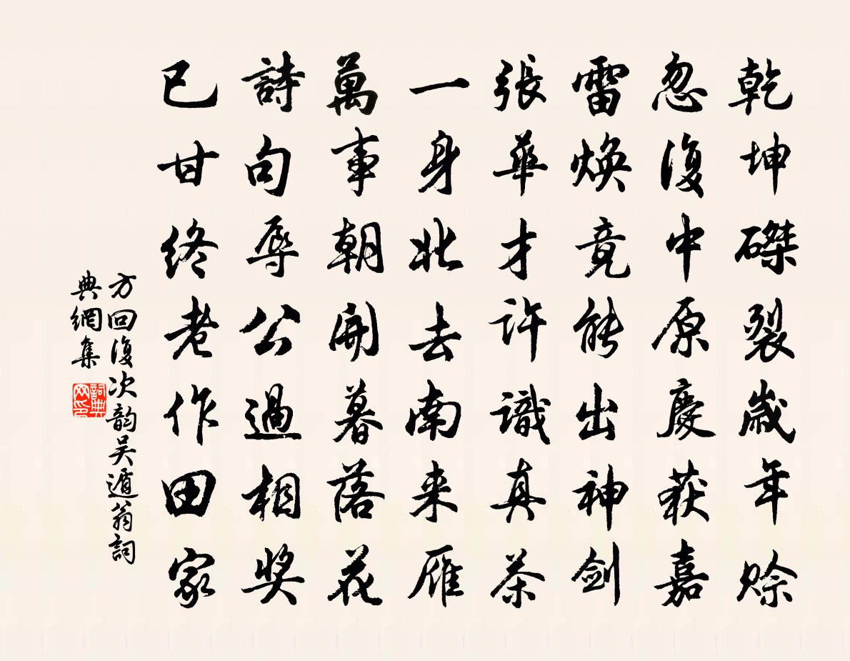 詩詞名句歷史字典書法欣賞書法字典國語詞典說文解字康熙字典古漢語字典標 題 作 者 詩 句 複次韻吳遁翁作者:方回 朝代:宋代複次韻吳遁翁原文乾坤磔裂歲年賒,忽復中原慶獲嘉。雷煥竟能出神劍,張華才許識真茶。一身北去南來雁,萬事朝開暮落花。詩句辱公過相獎,已甘終老作田家。詩詞問答問:複次韻吳遁翁的作者是誰?答:方回問:複次韻吳遁翁寫於哪個朝代?答:宋代方回複次韻吳遁翁書法欣賞複次韻吳遁翁書法作品詩詞推薦頌古四十五首釋如珙〔宋代〕一般顏色兩般名,紙蓋難瞞眾眼睛。雪峰當時便封轉,閩王猶未息疑情。入都李鴻章〔清代〕其一丈夫只手把吳鉤,意氣高於百尺樓。一萬年來誰著史,三千里外欲封侯。定將捷足隨途驥,那有閒情逐水鷗。再用前韻四首郭印〔宋代〕殘日銜西嶺,輕煙幕晚村。朝宗奔眾水,設險壯重門。恍惚襄王夢,淒涼蜀相魂。山川長不改,人意自朝昏。琴曲歌辭升仙操李群玉〔唐代〕嬴女去秦宮,瓊簫生碧空。鳳台閉煙霧,鸞吹飄天風。復聞周太子,亦遇浮丘公。叢簧發仙弄,輕舉紫霞中。濁世傷情怨/清商怨陳允平〔宋代〕南枝春意正小。籬菊都荒了。帳底孤燈,夜來還獨照。沙洲煙翠渺渺。謝塞鴻、頻帶書到。笑拈梅花,今年開較早題崇因院信上人宿雲軒王之道〔宋代〕秋聲入高梧,暝色上疏竹。南山攏青螺,過已淨如沐。悠然孤飛雲,窈窕轉休麓。自疑歸去晚,意欲窗下宿。道人珍珠簾/真珠簾葛長庚〔宋代〕陰陽內感相交結。有鉛汞、分八卦羅列。金鼎煉黃芽,正一陽時節。子後午前方進火,向玉爐、烹成白雪。通徹。清平樂晁端禮〔宋代〕朦朧月午。點滴梨花雨。青翼欺人多謾語。訊息知他真否。獸爐鴛被重熏。故將燈火挑昏。最恨西風搖幕,誤人幾寄終南種徵君釋行肇〔宋代〕紫閣浮清漢,高眠稱此心。住溪人未識,歸路鶴知深。峰晚回寒翠,猿孤發夜吟。霜天獨西向,無復夢山陰。高開國輓詩魏了翁〔宋代〕並游英俊半歸泉,何事夫君又弱焉。廉退風標留萬口,勤勞心事入塵編。團團故步八千石,落落浮名四十年。除地金鳳花楊萬里〔宋代〕細看金鳳小花叢,費盡司花染作工。雪色白邊袍色紫,更饒深淺四般紅。桃源憶故人佚名〔宋代〕庭槐沐雨翻新翠。疊雪香羅初試。鈴響彩旗天墜。忽報徐卿二。簾幃坐客歡聲沸。脫紫須煩半臂。借問月娥知未。月岩陸游〔宋代〕幾年不作月岩游,萬里重來已白頭。雲外連娟何所似?平羌江上半輪秋。正月十九日四更起讀朱文公年譜至天大明賦十方回〔宋代〕孟子告子辨內外,漢王項王爭雌雄。誰歟著定會陔錄,梭象終輸與遁翁。懷智棲上人尚顏〔唐代〕臨水登山自有期,不同遊子暮何之。閒眠默坐身堪賞,已去還來事可知。林鳥隔雲飛一餉,草蟲和雨叫多時。思君送友人棄官歸山居雍陶〔唐代〕不愛人間紫與緋,卻思松下著山衣。春郊雨盡多新草,一路青青蹋雨歸。明日復得五字陸游〔宋代〕腰痛今朝愈,褰裳野興長。黃鴉號亂筱,碧蝶繞枯桑。陂壞良疇廢,村空舊路荒。十年逢九潦,誰與問蒼蒼!春日即事舒岳祥〔宋代〕燈夕花朝都已過,石泉槐火又將新。故鄉失業荊榛滿,客子長飢雨雪頻。底處桃源堪避世,何人橘里得藏身。朝家涼州詞耿湋〔唐代〕國使翻翻隨旆旌,隴西岐路足荒城。氈裘牧馬胡雛小,日暮蕃歌三兩聲。金蓮出玉華王丹桂〔元代〕無為清靜。虎繞龍蟠歸大定。清靜無為。子母和同出入隨。逍遙自在。去去來來絕掛礙。自在逍遙。一任出林與市名句推薦回眸一笑百媚生,六宮粉黛無顏色。白居易《長恨歌》 去時梅萼初凝粉。不覺小桃風力損。歐陽修《玉樓春·去時梅萼初凝粉》 民惟邦本,本固邦寧。佚名《尚書·夏書·五子之歌》 二月春花厭落梅。仙源歸路碧桃催。晏幾道《浣溪沙·二月春花厭落梅》 星河秋一雁,砧杵夜千家。韓翃《酬程延秋夜即事見贈》 見素抱樸,少私寡慾,絕學無憂。老子《老子·道經·第十九章》 霜降碧天靜,秋事促西風。葉夢得《水調歌頭·九月望日與客習射西園余偶病不能射》 料峭春風吹酒醒,微冷,山頭斜照卻相迎。蘇軾《定風波·三月七日》 最關情,折盡梅花,難寄相思。周密《高陽台·送陳君衡被召》 賞罰如加於身,賦斂如取己物。此愛民之道也。姜子牙《六韜·文韜·國務》