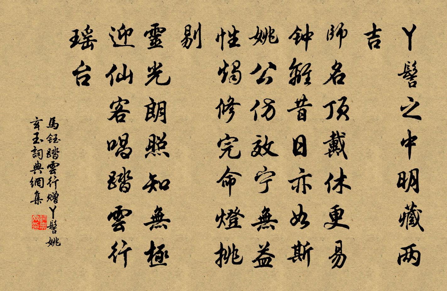 詩詞名句歷史字典書法欣賞書法字典國語詞典說文解字康熙字典古漢語字典標 題 作 者 詩 句 踏雲行 贈丫髻姚玄玉作者:馬鈺 朝代:元代踏雲行 贈丫髻姚玄玉原文丫髻之中,明藏兩吉。師名頂戴休更易。鍾離昔日亦如斯,姚公仿效寧無益。性燭修完,命燈挑剔。靈光朗照知無極。迎仙客唱踏雲行,瑤台詩詞問答問:踏雲行 贈丫髻姚玄玉的作者是誰?答:馬鈺問:踏雲行 贈丫髻姚玄玉寫於哪個朝代?答:元代問:踏雲行 贈丫髻姚玄玉是什麼體裁?答:詞馬鈺踏雲行 贈丫髻姚玄玉書法欣賞踏雲行 贈丫髻姚玄玉書法作品詩詞推薦酬王生鄭獬〔宋代〕兩日立我門,再拜求我詩。我詩非美粟,安得充君飢。十年誦周易,滿腹文王辭。文王不可見,使我空涕洟。卜運算元 黃州定慧院寓居作蘇軾〔宋代〕缺月掛疏桐,漏斷人初靜。誰見幽人獨往來?縹緲孤鴻影。驚起卻回頭,有恨無人省。揀盡寒枝不肯棲,寂寞沙洲淵禪人之乳峰釋智愚〔宋代〕淵默雷聲善發機,鈍根難下頂門椎。青霜黃葉壓窮野,急急歸來見隱之。即事李流謙〔宋代〕雪巘雲林共莽然,世間那有此江天。曉檣攙日何時到,夜柁鳴風幾夕眠。閒卜家書燈似粟,略開旅抱酒如泉。輕鷗送楊議卿赴舉文同〔宋代〕寒日照殘樹,新霜結衰草。有客奉高薦,策馬奔遠道。聲名近轉大,文字素已好。壯歲雖可恃,榮科亦宜早。勉自題楊次公春蘭蘇軾〔宋代〕春蘭如美人,不採羞自獻。時聞風露香,蓬艾深不見。丹青寫真色,欲補離騷傳。對之如靈均,冠佩不敢燕。送僧之嚴釋智愚〔宋代〕對薄方話蘿窗底,又握山藤破曉煙。領取桐江到家句,子規啼在月明前。寄竹隱先生孫應時劉過〔宋代〕竹湖人之英,劇縣勇自試。三年川桃李,遣愛及僮稚。鹹欲父母之,謂吾公之子。獨有督郵嫌,見謂不事事。瑕疵秋夜憶親庭有感釋紹嵩〔宋代〕碧澗寒侵屋,高林露氣清。空窗閒月色,密竹動秋聲。宴坐游三昧,鄰談喧五更。兩親今正老,此別不勝情。依韻和蔡參政導洛王珪〔唐代〕浩浩洪河一派收,亘山回洛駭陰虬。錦張客幔從隋去,龜負神書入宋流。波急滿川跳萬鯉,氣溫銷凍運千舟。誰言白衣寺鄭會〔宋代〕白衣古寺瞰江流,隔斷紅塵不記秋。深羨老僧心入定,禪房花木四時幽。與兒孫小飲陸游〔宋代〕歲暮寒多雨,村深早閉門。荒園摘葵芥,近市買雞豚。短褐聯三世,幽窗共一樽。五曹常得此,餘事不須論。贈李陽孫晏殊〔宋代〕不忍與君別,憐君仁義人。三年官滿後,依舊一家貧。惜花張佖〔宋代〕蝶散鸞啼尚數枝,日斜風定更離披。看多記得傷心事,金谷樓前委地時。祝英台近張輯〔宋代〕竹間棋,池上字。風日共清美。誰道春深,湘綠漲沙觜。更添楊柳無情,恨煙顰雨,卻不把、扁舟偷系。去千里。和陳天予經過南巢邑人迎舊尹王之道〔宋代〕君來井邑笑烘烘,君去蕭條迥不同。似說攀轅如昨日,可憐身老長兒童。南園荔子熟名曰魏紫蓋是陳家紫種以先公賜封陳宓〔宋代〕先世栽來四十年,南園魏紫始名傳。丁香乍翠蘭芬烈,龍腦初開玉色鮮。可踵蔡家名翰苑,誰夸烏石擅山前。追思寶鼎現陳著〔宋代〕問今何日,舊也曾尾,東風鵷鷺。回首念,家山桃李,歸去來兮聞早賦。夢境裡、盡何妨疏散,時趁鶯晴信步。是再鑄粥鍋釋師範〔宋代〕不解多方錮鏴成,一錘打破與重烹。等閒脫體離窠臼,煮粥依前不是羹。楚漢兩城王冕〔元代〕楚漢英雄今寂寞,兩城相倚舊封疆。荒台落日酣紅葉,古墓秋風老白楊。豈是有為增感慨?便令無事亦淒涼。徘徊名句推薦忍淚佯低面,含羞半斂眉。韋莊《女冠子·四月十七》 星漢燦爛,若出其里。曹操《觀滄海 / 碣石篇》 眺聽良多感,徙倚獨沾襟。李密《淮陽感秋》 去意徊徨,別語愁難聽。周邦彥《蝶戀花·早行》 鴛鴦密語同傾蓋,且莫與、浣紗人說。張炎《疏影·詠荷葉》 前年伐月支,城上沒全師。張籍《沒蕃故人》 路漫漫其修遠兮,吾將上下而求索。屈原《離騷》 萬里無人收白骨,家家城下招魂葬。張籍《征婦怨》 老至居人下,春歸在客先。劉長卿《新年作》 處事有何定憑,但求此心過得去王永彬《圍爐夜話·第三九則》