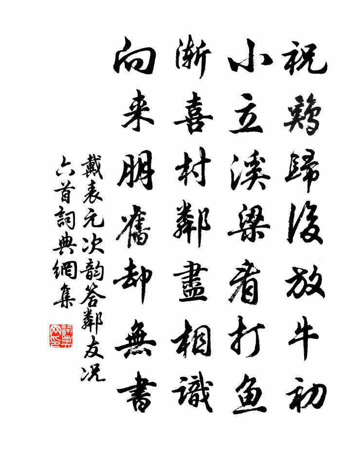 詩詞名句歷史字典書法欣賞書法字典國語詞典說文解字康熙字典古漢語字典標 題 作 者 詩 句 次韻答鄰友況六首作者:戴表元 朝代:宋代次韻答鄰友況六首原文祝雞歸後放牛初,小立溪梁看打魚。漸喜村鄰盡相識,向來朋舊卻無書。詩詞問答問:次韻答鄰友況六首的作者是誰?答:戴表元問:次韻答鄰友況六首寫於哪個朝代?答:宋代戴表元次韻答鄰友況六首書法欣賞次韻答鄰友況六首書法作品詩詞推薦和此陽先生感興詩二十首劉黻〔宋代〕禮樂節性情,工夫貴深省。愛親篤冰履,酬世尚錦絅。勿任忘與助,一敬收眾騁。威儀筋骸束,趣味素神領。相彼金陵懷古江立信〔宋代〕勝地尚存龍虎氣,荒台已失鳳凰蹤。六朝文物山川古,霸氣終歸指雇中。聞琳老欲入山今少雨想未成行奉寄一絕毛滂〔宋代〕野僧報我泉新白,此老居庵山更清。雨澀故應須小住,雲寒端未出相迎。送從子沆宰鄖鄉樓鑰〔宋代〕小阮幼種愛,長乃遭百罹。風木既深痛,棣華更纏悲。所賴有吾子,獨立守家規。上有門戶托,傍有孤與嫠。忽為即事二首陳造〔宋代〕形容骯髒水雲宜,心意闌殘欲語誰。不作貴人炎冷麵,北山逋客最相知。暮春言懷寄浙東轉運黃工部釋簡長〔宋代〕花落前林春又殘,舍深蒼蘚擁柴關。十年霜雪獨為客,萬里夢魂空到山。溪竹舊憐同性直,嶺雲終約伴身間。遙思正月十八日蔡州道上遇雪子由韻二首蘇軾〔宋代〕蘭菊有生意,微陽回寸根。方憂集暮雪,復喜迎朝暾。憶我故居室,浮光動南軒。松竹半傾瀉,未數葵與萱。三徑錦城方天瑞玄英先生後人得白雲山居圖仿佛桐仇遠〔宋代〕翼翼山千朵,蕭蕭屋數間。石崖不可度,門徑幾曾關。綠樹經秋在,白雲終日閒。依稀鏡湖曲,西島水迴環。郊祀樂章太祖皇帝位酌獻登歌作大呂宮彰安崔敦詩〔宋代〕一德開墓,百年垂統。中天禘郊,薄海朝貢。寶龜相承,器鼎加重。澤深慶綿,帝復命宋。游城東王駙馬亭陸暢〔唐代〕城外無塵水間松,秋天木落見山容。共尋蕭史江亭去,一望終南紫閣峰。浮丘道人招魂歌汪元量〔宋代〕有詩有詩吟嘯集,紙上飛蛇歕香汁。杜陵寶吃得開埤親拾,滄海月明老珠泣。天地長留國風什,鬼神護呵六丁立。挽唐伯玉常卿二首劉克莊〔宋代〕久欲攜蓴鯽,呻吟去未能。甫封陶母墓,俄吊董生陵。言立何曾死,騷招更不應。那須論宿草,身盡淚方冰。送康彥博文夫吉州教長句二十韻方回〔宋代〕廟廊謁賢飯吐哺,留子翰林不肯住。閻公大學今儒宗,邀子同宿玉堂霧。曰我天南有嚴親,滫瀡旨甘奉朝暮。得一望江南(感事)蔡伸〔宋代〕落花盡,寂寞委殘紅。蝶帳夢回空曉月,鳳樓人去謾東風。春事已成空。閒佇立,□□水溶溶。雲鎖亂山橫慘澹,菩薩蠻舒亶〔宋代〕綺櫳深閉桃園曲。劉郎老向花間宿。笑臉抹流霞。心知是小琶。纖纖垂素玉。掠鬢春雲綠。彈了醉思仙。小窗紅日和胡經仲即事二首吳芾〔宋代〕雨腳轉前灣,煙蓑帶雨還。清詩陶野色,薄色散愁顏。檐鳥下苔徑,溪雲媚屋山。世途方擾擾,誰得似君閒。九日獨酌韓元吉〔宋代〕茱萸滿把半青紅,強擬登臨少客同。碧樹池塘秋色里,黃花時節雨聲中。官閒覓句能消日,酒薄看山尚怯風。高李寄杜仲觀賀鑄〔宋代〕中春雨收霽,與子登叢台。形勝宛然在,太行西北來。無情百尺土,千載未摧頹。四顧發悲嘯,淒風振頤頦。淩高慶曆八年四月二十八日漢體書二詩宋仁宗〔宋代〕花領紅鬃一向偏,綠槐香陌欲朝天。仍嫌眾里驕行疾,傍鐙深藏白玉鞭。次韻莫令因迓使者同泛舟至漂神已而誤焉問宿趙蕃〔宋代〕璧月儼中懸,村空聽悄然。借床依樹閣,輟棹上灘船。物外我懷趣,區中公了緣。異時殊出處,安否要詩傳。名句推薦形勝三分國,波流萬世功。潘大臨《江間作四首·其三》 瓜熟蒂落,水到渠成。佚名《增廣賢文·下集》 不見又思量,見了還依舊。李之儀《謝池春·殘寒銷盡》 上有愁思婦,悲嘆有餘哀。曹植《明月上高樓》 世上無難事,只怕不專心。佚名《增廣賢文·下集》 滾滾長江東逝水,浪花淘盡英雄。楊慎《臨江仙·滾滾長江東逝水》 此時卻羨閒人醉,五馬無由入酒家。白居易《早冬》 冥冥寒食雨,客意向誰親?劉一止《冥冥寒食雨》 時人不識凌雲木,直待凌雲始道高。杜荀鶴《小松》 欲勝人者,必先自勝;欲論人者,必先自論;欲知人者,必先自知。呂不韋《呂氏春秋·紀·季春紀》