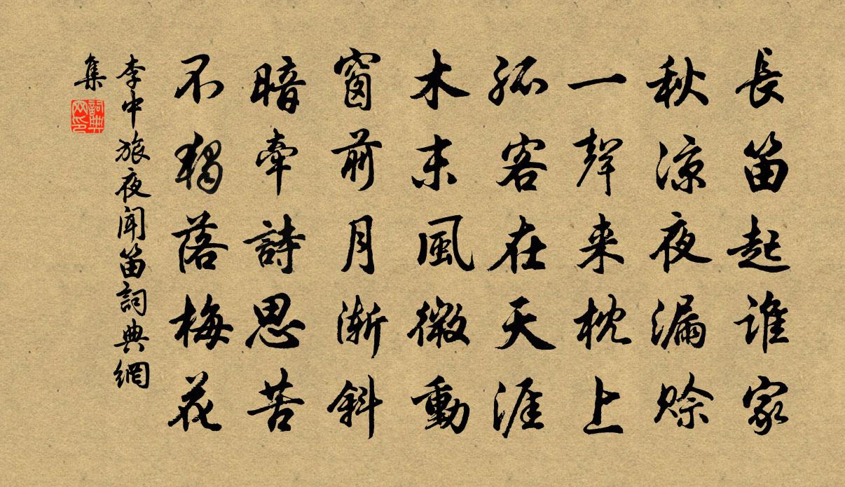 詩詞名句歷史字典書法欣賞書法字典國語詞典說文解字康熙字典古漢語字典標 題 作 者 詩 句 旅夜聞笛作者:李中 朝代:唐代旅夜聞笛原文長笛起誰家,秋涼夜漏賒。一聲來枕上,孤客在天涯。木末風微動,窗前月漸斜。暗牽詩思苦,不獨落梅花。詩詞問答問:旅夜聞笛的作者是誰?答:李中問:旅夜聞笛寫於哪個朝代?答:唐代問:旅夜聞笛是什麼體裁?答:五律李中旅夜聞笛書法欣賞旅夜聞笛書法作品注釋全唐詩:卷750-17詩詞推薦次韻李公擇送新賜龍團與黃學士三絕句蘇頌〔宋代〕團團龍鏡未磨開,馥馥新香滿座來。試酌靈泉看餑沫,猶疑盞底有風雷。晚發鹹陽,寄同院遺補李嘉祐〔唐代〕征戰初休草又衰,鹹陽晚眺淚堪垂。去路全無千里客,秋田不見五陵兒。秦家故事隨流水,漢代高墳對石碑。回首為歸雲師賦野航薛嵎〔宋代〕遇坎與乘流,誰能舍跡求。即空皆是境,大渡本無舟。風流隨機息,乾坤任光浮。可憐迷岸者,漂蕩幾時休。次韻胡仲方因楊伯子見寄姜夔〔宋代〕此去廬陵定幾程,向來筇杖未經行。懸知片棹雲邊集,大有吟情雪裡生。楚渡食萍應甚美,舜祠吹玉直難清。二君小雪前三日鍾冠之約余侍老人行山舟發後洪入洪咨夔〔宋代〕系舡官柳根,闤闠得深密。日落遠水明,雲收好山出。天開有聲畫,人立無價璧。酒行不須多,鷺下孤蒲夕。摸魚兒李裕翁〔宋代〕計江南、許多風景,繁華只在晴晝。些兒淡沲沖融意,到處粘花著柳。疏雨後。更艷艷綿綿,潑眼濃如酒。飛浮宇偈公六十五首釋鹹傑〔宋代〕四月明十五日結,七月十明五日解。六隻骰子滿盆紅,大都只是看頭米。春日山行二首洪咨夔〔宋代〕一晴一雨柳添碧,半落半開梅著酸。不被東風相鼓弄,春山只有老蒼官。別呂守三首黃公度〔宋代〕自此調元去,人今臥轍同。棠陰閩嶺外,星傳浙江東。四月黃梅雨,千山荔子風。離亭獨歸處,回首意無窮。太常樂章三十首其七酌獻第三室奏大順之舞曲楊億〔宋代〕明明我祖,積德累仁。居晦匿曜,邁種惟勤。帝圖天錫,輝光日新。寢廟繹繹,昭事同寅。有惠新醬及酒者朱翌〔宋代〕拾遺久住浣花橋,生理誰能濟一毫。攜醬藉糟來過我,故人惟有孟倉曹。送唐御史仲訥〔宋代〕力犯雷霆眾共危,遠投魑魅獨為宜。忠州學業真無負,高廟神靈固有知。自倚聖明容直道,未甘憔悴死荒陲。滿朝詠張諲山水(末缺)李頎〔唐代〕小山破體閒支策,落日梨花照空壁。詩堪記室妒風流,畫與將軍作勍敵。小松(一作杜荀鶴詩,非)羅隱〔唐代〕已有清陰逼座隅,愛聲仙客肯過無。陵遷谷變須高節,莫向人間作大夫。和除字韻問大淵來期劉克莊〔宋代〕故人有約欽遲久,竹榭茅亭自掃除。寧載鴟夷訪楊子,羞蒙狗監薦相如。極思座上揮長麈,莫賺□□□□車。□□薦黃平仲過雪岩以詩代簡姚勉〔宋代〕秀岩萬仞拔天起,劃堮剜垠爭怪詭。六花一夜積三尺,化作冰壺無表里。幼輿丘壑自不凡,何況有雪被此岩。天教陪諸先輩題名登春台臞軒即席次故相陳魏公韻劉克莊〔宋代〕遨頭唱首各高深,才薄難披作賦襟。已覺鶯花成一夢,尚貪螢雪競分陰。即今空負台萊意,宿昔曾賡殿閣吟。北望次韻陸子高陳造〔宋代〕一從別君來,圓缺幾望舒。相與兄弟然,異姓殊厥居。向來帆歸船,欲去仍趦趄。平安可但已,擬憑雙鯉魚。兩地寶鼎現(上元)趙長卿〔宋代〕囂塵盡掃,碧落輝騰,元宵三五。更漏永、遲遲停鼓。天上人間當此遇。正年少、盡香車寶馬,次第追隨士女。看柳梢青許楨〔元代〕疊嶂浮嵐。澄江拖練,遠浦歸帆。橙蟹分甘,蓴鱸專美,露酒霜柑。登高聊憩禪庵。採菊蕊、茱萸滿籃。丹桂飄香名句推薦歸鴻聲斷殘雲碧。背窗雪落爐煙直。李清照《菩薩蠻·歸鴻聲斷殘雲碧》 微雨眾卉新,一雷驚蟄始。韋應物《觀田家》 人學始知道,不學非自然。孟郊《勸學》 煙水初銷見萬家,東風吹柳萬條斜。竇鞏《襄陽寒食寄宇文籍》 是天外空汗漫,但長風、浩浩送中秋。辛棄疾《木蘭花慢·中秋飲酒將旦客謂前人詩詞有賦待月無送月者因用天問體賦》 溪雲初起日沉閣,山雨欲來風滿樓。許渾《鹹陽城東樓 / 鹹陽城西樓晚眺 / 西門》 拜迎長官心欲碎,鞭撻黎庶令人悲。高適《封丘作》 南朝四百八十寺,多少樓台煙雨中。杜牧《江南春》 極陽以殺,極陰以生佚名《黃帝四經·經法·四度》 余拏一小舟,擁毳衣爐火,獨往湖心亭看雪。張岱《湖心亭看雪》