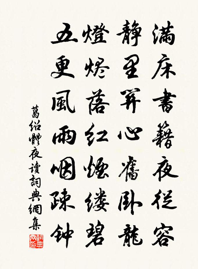 詩詞名句歷史字典書法欣賞書法字典國語詞典說文解字康熙字典古漢語字典標 題 作 者 詩 句 夜讀作者:葛紹體 朝代:宋代夜讀原文滿床書籍夜從容,靜里關心舊臥龍。燈燼落紅煙縷碧,五更風雨咽疎鍾。詩詞問答問:夜讀的作者是誰?答:葛紹體問:夜讀寫於哪個朝代?答:宋代葛紹體夜讀書法欣賞夜讀書法作品詩詞推薦題簡上人西亭詩文後劉翼〔宋代〕真如非字義,綺語道之疵。未見西亭作,長為北磵欺。晚因僧媚遠,初實客從曦。多少才名士,沉淪世不知。滿江紅許有壬〔元代〕徒倚危闌,愛四面、嵐光翠濕。回首見、疏雲黃葉,遠林平磧。老眼都迷秋遠近,壯遊已遍天南北。有一官、更比江夏春感舊李頻〔唐代〕東風出海門,處處動林園。澤國雪霜少,沙汀花木繁。暖魚依水淺,晴雁入空翻。何處陽和力,生萍不駐根。書嘆七首戴表元〔宋代〕數友越州居,無書無三年。台州已無數,逢人每相賢。日夜已遠友,遠者隔蠻煙。風氣不擇州。俗情輕目前。管鮑贈琴士劉伯華蔡沈〔宋代〕公子方年少,絲桐長有名。曲雖仍舊譜,指要發新聲。澗落泉初響,風清月正明。起予千古意,愴惻不勝情。送僧之湖南貫休〔唐代〕湘水萬餘里,師游芳草生。登山乞食後,無伴入雲行。宿雨和花落,春牛擁霧耕。不知今夜月,何處聽猿聲。別蔣穎叔黃庭堅〔宋代〕金城千里要人豪,理君亂絲須孟勞。文星合在天東壁,清都紫微醉雲璈。荊溪居士傲軒冕,胸吞雲夢如秋毫。三品送李庶子致仕還洛楊炯〔唐代〕此地傾城日,由來供帳華。亭逢李廣騎,門接邵平瓜。原野煙氛匝,關河游望賒。白雲斷岩岫,綠草覆江沙。詔賜七月六日二首張耒〔宋代〕積雨空階生綠衣,幽幽點點弄秋姿。黃昏樓角看新月,還是去年牛女時。避秦十人黃庭堅〔宋代〕九真承詔上龍胡,儘是驪山所送徒。惟有鄧公留不去,松根搘鼎煮菖蒲。偈頌二十四首釋智遇〔宋代〕一人要貧貧不得,一人要富富不得。要知貧富不相當,且請各歸本位立。頌古四十五首釋如珙〔宋代〕豈要共出一雙手,只教喚著沙彌來。鐵鐺無腳又無耳,牆下春深薺葉開。七夕泛舟二首盧照鄰〔唐代〕汀葭肅徂暑,江樹起初涼。水疑通織室,舟似泛仙潢。連橈渡急響,鳴棹下浮光。日晚菱歌唱,風煙滿夕陽。鳳杼山林古松釋文珦〔宋代〕古松形甚怪,得性在山林。偃蓋盤空老,流脂入地深。青霜曾換骨,野火誤燒心。材大誠難用,良工亦漫尋。西湖竹枝歌楊維楨〔元代〕勸郎莫上南高峰,勸郎莫上北高峰,南高峰雲北高雨,雲雨相催愁殺儂。賀新郎(張總領□□生日)魏了翁〔宋代〕家住峨山趾。暑風輕、雙泉漱玉,五坡攢翠。坡上主人歸無計。夢泛滄波清泚。曾拜奏、前旒十二。願上皇華將親送行可和尚游雁宕翁森〔宋代〕靈運平生屐,如何一瘦藤。夕陽紅葉寺,秋雨白頭僧。閱世三兵火,傳心幾佛燈。詎押金還記我,曾向此山登。望龍山懷道士許法棱劉長卿〔唐代〕心惆悵,望龍山。雲之際,鳥獨還。懸崖絕壁幾千丈,綠蘿裊裊不可攀。龍山高,誰能踐。靈原中,蒼翠晚。嵐煙問少年白居易〔唐代〕千首詩堆青玉案,十分酒瀉白金盂。回頭卻問諸年少,作個狂夫得了無?梅花十絕答石塘二林劉克莊〔宋代〕塞北寒梅要笛催,更憑畫鼓奪春回。江南氣候閩尤暖,只用詩催也自開。名句推薦柳葉雙眉久不描,殘妝和淚污紅綃。江采萍《謝賜珍珠》 胡沙沒馬足,朔風裂人膚。韋元甫《木蘭歌》 夢斷香消四十年,沈園柳老不吹綿。陸游《沈園二首》 燕簾鶯戶,雲窗霧閣,酒醒啼鴉。張炎《朝中措·清明時節》 雲青青兮欲雨,水澹澹兮生煙。李白《夢遊天姥吟留別 / 別東魯諸公》 亂碧萋萋,雨後江天曉。梅堯臣《蘇幕遮·草》 衣貴潔,不貴華。上循分,下稱家。李毓秀《弟子規·謹》 琴瑟在御,莫不靜好。佚名《女曰雞鳴》 李白能詩復能酒,我今百杯復千首。唐寅《把酒對月歌》 去年射虎南山秋,夜歸急雪滿貂裘。陸游《三月十七日夜醉中作》