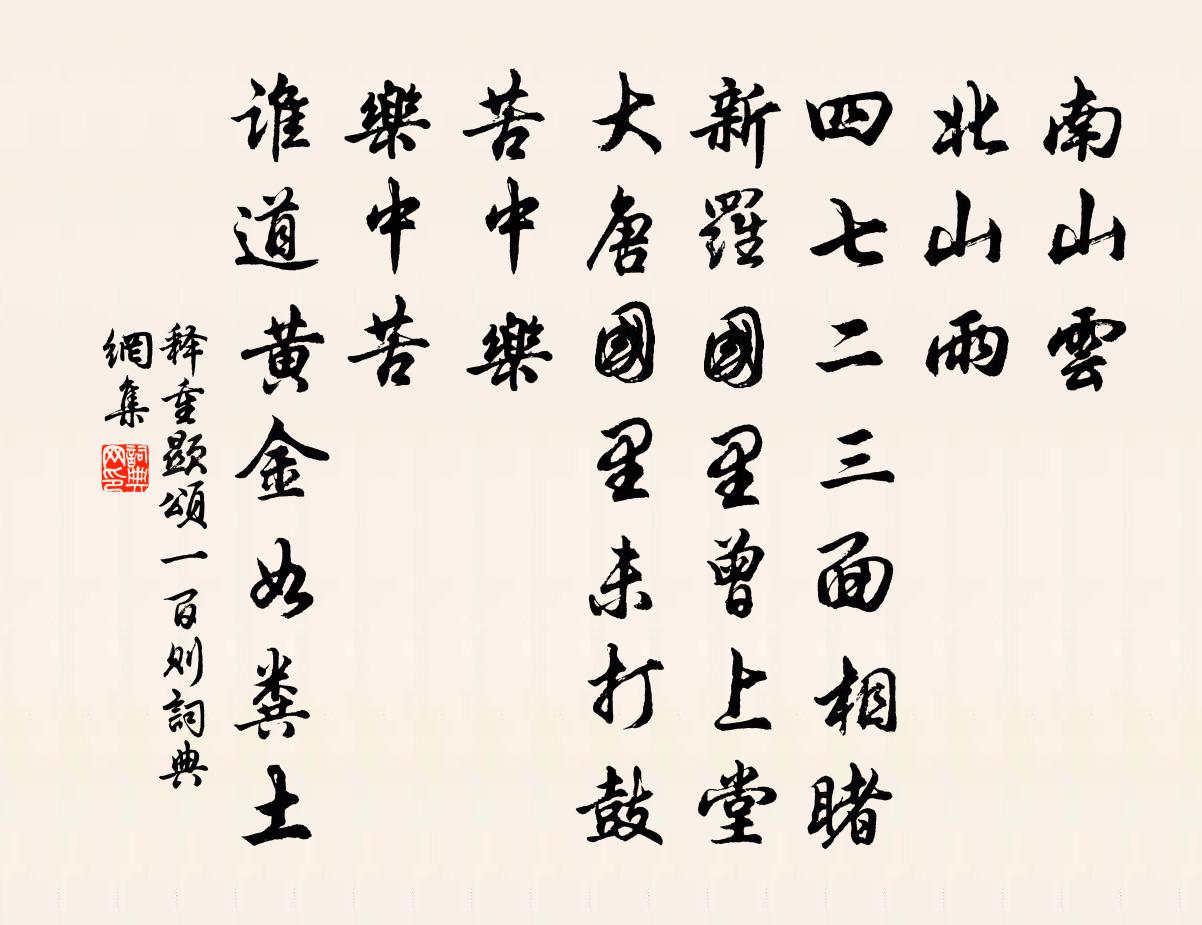 詩詞名句歷史字典書法欣賞書法字典國語詞典說文解字康熙字典古漢語字典標 題 作 者 詩 句 頌一百則作者:釋重顯 朝代:宋代頌一百則原文南山雲,北山雨,四七二三面相睹,新羅國里曾上堂,大唐國里未打鼓。苦中樂,樂中苦,誰道黃金如糞土。詩詞問答問:頌一百則的作者是誰?答:釋重顯問:頌一百則寫於哪個朝代?答:宋代釋重顯頌一百則書法欣賞頌一百則書法作品詩詞推薦滿庭芳 寄與平張先生馬鈺〔元代〕超然悟道,怡然舍俗。寧肯泥拖水漉。決烈回頭*了,恩山愛獄。堪為風鄰月伴,與雲朋霞友相逐。無系欄,在人呂尚書挽章王洋〔宋代〕古遠儒冠拙,時忙壯士尊。百年難保命,萬里未歸魂。身後塞翁馬,生前廷尉門。悲笳咽遺恨,行矣不須論。同賦梅花十二題月下王銍〔宋代〕樽前舊厭繁多態,雪裹曾嫌淡少情。何似天容開夜色,數枝寒玉轉輕盈。過松源,晨炊漆公店六首楊萬里〔宋代〕政是行人腸斷時,子規得得向人啼。若能淚得居人臉,始信春愁總為伊。麗正殿賜宴同勒天前煙年四韻應制王灣〔唐代〕金殿忝陪賢,瓊羞忽降天。鼎羅仙掖里,觴拜瑣闈前。院逼青霄路,廚和紫禁菸。酒酣空忭舞,何以答昌年。雨後子文、伯莊二弟相訪,同游東園楊萬里〔宋代〕北阮稀相見,東園肯到無。鞋留沙跡淺,扇答雨聲疏。新長水三尺,倒漂梅一株。炊煙起山崦,好個晚村圖。開歲連日大雪陸游〔宋代〕開歲大雪如飛鷗,轉盼已見平檐溝。村深出門風裂面,況復取醉湖邊樓。從來春雪不耐久,臥聽點滴無時休。去年自齊山借舟泛湖還家曹緯〔宋代〕十里平湖漫不流,晚風吹浪打行舟。定知歸得侵燈火,家在菰蒲最盡頭。句施樞〔宋代〕刺分下蛹堆盤脆,嚼破冰蠶繞齒涼。次答邦直、子由五首蘇軾〔宋代〕城南短李好交遊,箕踞狂歌不自由。尊主庇民君有道,樂天知命我無憂。醉呼妙舞留連夜,閒作清詩斷送秋。瀟灑尹山接待釋崇岳〔宋代〕千古尹山寺,家風不厭貧。只將這個意,接待往來人。史稿劉克莊〔宋代〕雖有隆乾手澤傳,空疏豈敢望談遷。春秋筆絕經誰續,光岳氣分材少全。老去汗顏慚巧斬,向來執手付遺編。文名句林憲〔宋代〕天空霜無影。賀新涼/賀新郎林正大〔宋代〕環滁皆山也。望西南、蔚然深秀,者琅邪也。泉水潺潺峰路轉,上有醉翁亭也。亭、太守自名之也。試問醉翁何所漁父詞趙孟頫〔元代〕渺渺煙波一葉舟。西風落木五湖秋。盟鷗鷺,傲王侯。管甚鱸魚不上酬秘書王丞見寄(一作酬王秘書閒居見寄)張籍〔唐代〕相看頭白來城闕,卻憶漳溪舊往還。今體詩中偏出格,常參官里每同班。街西借宅多臨水,馬上逢人亦說山。芸閣別胡仲立次敬子伯量二丈韻二首裘萬頃〔宋代〕修水相望無百里,從來人物勝西昌。弘齋自是朝陽鳳,伯仲行看接翼翔。張道宗比部輓詩三首文同〔宋代〕學富詞章妙,才高志力強。帝方知可用,官欲漸難量。始得西原使,才終石省郎。念公今止此,無語問蒼蒼。漢武錢惟演〔宋代〕一曲橫汾鼓吹回,侍臣高會柏梁台。金芝燁煜凌晨見,青雀軒翔白晝來。立候東溟邀鶴駕,窮兵西極待龍媒。甘泉懷仙二首鮑溶〔唐代〕崑崙九層台,台上宮城峻。西母持地圖,東來獻虞舜。虞宮禮成後,回駕仙風順。十二樓上人,笙歌沸天引。裴回名句推薦美人慵翦上元燈,彈淚倚瑤瑟。朱敦儒《好事近·春雨細如塵》 心生而言立,言立而文明,自然之道也劉勰《文心雕龍·原道》 細草微風岸,危檣獨夜舟。杜甫《旅夜書懷》 念故人,千里至此共明月。寇準《踏莎行·寒草煙光闊》 詩酒趁年華。蘇軾《望江南·超然台作》 過份求福,適以速禍;安分遠禍,將自得福。陳繼儒《小窗幽記·集靈篇》 大漠孤煙直,長河落日圓。王維《使至塞上》 樹繞村莊,水滿陂塘。秦觀《行香子·樹繞村莊》 獨上江樓思渺然,月光如水水如天。趙嘏《江樓舊感》 當軒對尊酒,四面芙蓉開。王維《臨湖亭》