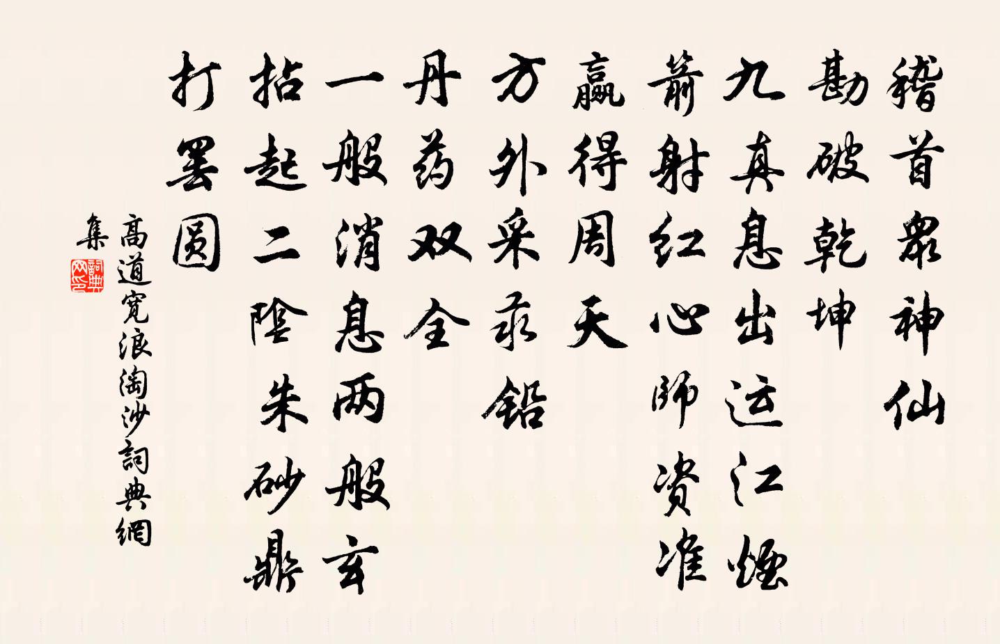 詩詞名句歷史字典書法欣賞書法字典國語詞典說文解字康熙字典古漢語字典標 題 作 者 詩 句 浪淘沙作者:高道寬 朝代:元代浪淘沙原文稽首眾神仙。勘破乾坤。九真息出運江煙。箭射紅心師資準,贏得周天。方外采汞鉛。丹藥雙全。一般訊息兩般玄。拈起二陰硃砂鼎,打罷圓詩詞問答問:浪淘沙的作者是誰?答:高道寬問:浪淘沙寫於哪個朝代?答:元代問:浪淘沙是什麼體裁?答:詞高道寬浪淘沙書法欣賞浪淘沙書法作品詩詞推薦贈申長官方乾〔唐代〕言下隨機見物情,看看獄路草還生。旅人莫怪無魚食,直為寒江水至清。題齋壁陸游〔宋代〕四顧茫茫水接天,幽居真箇似乘船。月窗竹影連棲鵲,露井桐聲帶斷蟬。甘寢每憎茶作祟,清狂直以酒為仙。形骸除夜懷劉朋山為坑司乾官朱南傑〔宋代〕失腳糟丘又一春,歲除牢落頗關情。誰家不換桃符句,比屋相聞竹爆聲。舊友未知能鑄冶,新年宜入孰陶成。來朝述懷二首孫璉〔宋代〕少也不諧俗,老去益美閒。百草生已綠,春雨滿南山。朝朝荷鋤去,既夕驅牛還。長生茆檐下,貧賤甚獨安。但願海鄉竹枝歌楊維楨〔元代〕潮來潮退白洋沙,白洋女兒把鋤耙。苦海熬乾是何日?免得儂來爬雪沙。門前海坍到竹籬,階前腥臊蟛子肥。亞仔早春呈水部張十八員外二首韓愈〔唐代〕天街小雨潤如酥,草色遙看近卻無。最是一年春好處,絕勝煙柳滿皇都。莫道官忙身老大,即無年少逐春心。憑君洪秀才乞頌釋慧遠〔宋代〕列聖叢中獨許君,空王令下急翻身。會須別有拿雲手,指出威音那畔人。賀新郎(和陳新淥觀競渡韻)趙必〔宋代〕繡口琅玕腹。美人兮、陽春一曲,華貂難續。喚醒荷花歸棹夢,猶憶紅塵迷目。只消得、烏飛兔逐。往事已隨流水臨江仙蔡伸〔宋代〕簾幕深深清晝永,玉人不耐春寒。鏤牙棋子縷金圓。象盤雅戲,相對小窗前。隔打直行尖曲路,教人費盡機關。局餞唐郎中洛陽令沈佺期〔唐代〕一台推往妙,三史佇來修。應宰鳧還集,辭郎雉少留。郊筵乘落景,亭傳理殘秋。願以弦歌暇,芝蘭想舊遊。龔宗伯座中贈優人扮虞姬杜濬〔清代〕年少當場秋思深,座中楚客最知音。八千子弟封侯去,唯有虞兮不負心。寄汪狀元釋慧遠〔宋代〕全機倒用若為酬,盡法無民未肯休。金馬玉堂留不住,依前屋裹販揚州。伯父《送先人下第歸蜀》詩云︰人稀野店休安蘇軾〔宋代〕我夢隨汝去,東阡松柏青。卻入西州門,永愧北山靈。景祐饗先農五首佚名〔宋代〕居德之厚,厥祀攸陳。土膏初胍,農事先春。鏗然金奉,儼若華紳。陟降於阼,福祿惟神。句薛紹彭〔宋代〕看雲醒醉眼,乘月棹回瀾。送王龍圖源叔之襄陽梅堯臣〔宋代〕忽驚車騎臨,乃是荊州長。登堂語出處,陳事猶夢想。別逾二十年,相遇今始兩。爵位異禮數,齒髮可下上。但問徐南卿友竹軒二首陳造〔宋代〕皺縠香羅裹瓠壺,此君高韻豈其徒。蕭然相對心莫逆,敢謂徐郎山澤臞。楞嚴六根異舌知味釋慧遠〔宋代〕憍梵缽提知此味,苦澀鹹酸那裹是。一舉如能至梵天,超證如來真實錢。句仇遠〔宋代〕割蒲分坐具,貯瀑入軍持。春日田園雜興五首陳希聲〔宋代〕田園與在早春時,眼纈生紅喜一眉。門巷日高人掃雪,池塘煙漲水流澌。杯柈新歲嘆同社,燈火元宵鬧古祠。野老名句推薦小男供餌婦搓絲,溢榼香醪倒接罹。李郢《南池》 屈盤戲白馬,大笑上青山。李白《登敬亭北二小山余時送客逢崔侍御並登此地》 六翮飄颻私自憐,一離京洛十餘年。高適《別董大二首》 波面澄霞,蘭艇采香去。高觀國《祝英台近·荷花》 虎狼也有父子之情。馮夢龍《喻世明言·卷二十一》 如何亡國恨,盡在大江東!屈大均《秣陵》 春路雨添花,花動一山春色。秦觀《好事近·夢中作》 胭脂淚,相留醉,幾時重。李煜《相見歡·林花謝了春紅》 美人結長想,對此心悽然。李白《折楊柳》 舉頭紅日白雲低,四海五湖皆一望。唐寅《伯虎扮乞兒,作詩騙酒》