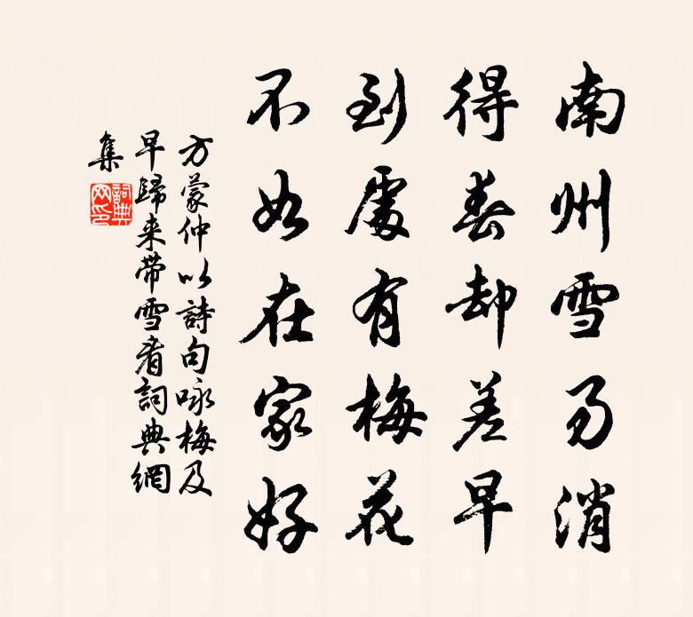 詩詞名句歷史字典書法欣賞書法字典國語詞典說文解字康熙字典古漢語字典標 題 作 者 詩 句 以詩句詠梅及早歸來帶雪看作者:方蒙仲 朝代:宋代以詩句詠梅及早歸來帶雪看原文南州雪易消,得春卻差早。到處有梅花,不如在家好。詩詞問答問:以詩句詠梅及早歸來帶雪看的作者是誰?答:方蒙仲問:以詩句詠梅及早歸來帶雪看寫於哪個朝代?答:宋代方蒙仲以詩句詠梅及早歸來帶雪看書法欣賞以詩句詠梅及早歸來帶雪看書法作品詩詞推薦瓮牖吟邵雍〔宋代〕有客無知,唯知自守。自守無他,唯求寡咎。有屋數間,有田數畝。用盆為池,以瓮為牖。牆高於肩,室大於斗。和子瞻和陶淵明雜詩十一首蘇轍〔宋代〕嘗聞左師言,少子古所喜。二兒從兩父,服辱了百事。佳子何關人,自怪余此意。看書時獨笑,屢與古人值。他年月下口占戲子溫李新〔宋代〕桂華已出海邊山,雨葉翻光作夜寒。陶令骨清無鼻息,苦吟休倦倚闌乾。林和叔山園九詠秀野姜特立〔宋代〕坡仙獨樂賦新詩,秀野於公兩得之。山卉名花同一囿,調元妙手本無私。寄天台道友盧士衡〔唐代〕相思遙指玉霄峰,悵望江山阻萬重。會隔曉窗聞法鼓,幾同寒榻聽疏鍾。別來知子長餐柏,吟處將誰對倚松。且住春日與劉評事過故證上人院楊巨源〔唐代〕曾共劉咨議,同時事道林。與君方掩淚,來客是知心。階雪凌春積,鍾煙向夕深。依然舊童子,相送出花陰。次韻答少章聞雁聽雞二首黃庭堅〔宋代〕平生絕少分甘處,身要從師萬事忘。霜雁叫群傾半枕,夢回兄弟彩衣行。冬日游甘露寺蔡肇〔宋代〕漕河膠舟水流咽,水關著鍵行者歇。大江伏槎臥長劍,萬頃濕銀寒不結。蓬萊諸仙亦避寒,海門冥冥凍欲坼。朔風贊成功毛文錫〔唐代〕海棠未坼,萬點深紅,香包緘結一重重。似含羞態,邀勒春風。蜂來蝶去,任繞芳叢。昨夜微雨,飄灑庭中,忽聞八月十三日觀長星梅堯臣〔宋代〕長星彗雲出,天狗欲墮鳴。狗掃不見跡,昭晰河漢橫。河漢秋轉淨,箕斗垂光晶。勸爾長星酒,收祲看太平。題蕭照山水舒岳祥〔宋代〕翩翩涼樹下茅堂,揖客柴門去棧長。山外橫舟篷不啟,誰知世有送迎忙。夜坐聞湖中漁歌陸游〔宋代〕少年嗜書謁目力,老去觀書澀如棘。短檠油盡固自佳,坐守一窗如漆黑。漁歌裊裊起三更,哀而不怨非凡聲。明星新荷葉(詠荷)趙長卿〔宋代〕冷徹蓬壺,翠幢鼎鼎生香。十頃琉璃,望中無限清涼。遮風掩日,高低襯、密護紅妝。陰陰湖裡,羨他雙浴鴛鴦。寄內白居易〔唐代〕條桑初綠即為別,柿葉半紅猶未歸。不如村婦知時節,解為田夫秋搗衣。奉和聖制送來濟應制許敬宗〔唐代〕萬乘騰鑣警岐路,百壺供帳餞離宮。御溝分水聲難絕,廣宴當歌曲易終。興言共傷千里道,俯跡聊示五情同。良哉八月十五日二十日兩至南山飲瀟灑亭方回〔宋代〕悠悠桐江水,寓廬十二年。重來六日內,兩日登南山。南山有何好,高閣西北偏。隔江三千家,一抹煙靄間。閣檻贈潘岳詩陸機〔魏晉〕僉曰吾生。明德惟允。侍趙開府夜宴陳允平〔宋代〕剩陪華佩醉蟠桃,楊柳飄飄拂午橋。夜月樓台行錦障,春風簾幕卷紅綃。歌傳杏苑黃金縷,樂奏梨園紫玉簫。銀漏寄新定桂雍貫休〔唐代〕獨自住烏龍,應憐是衲僧。句須人未道,君此事偏能。塢濕雲埋觀,溪寒月照罾。相思不可見,江上立騰騰。永遇樂(學士兄築室南山拒梗峰下,與西山相對。因生日,以詞見意)李彌遜〔宋代〕一水如繩,兩山如翼,綠野如繡。松院乾霄,筠莊枕浪,攬盡溪山秀。水南水北,竹輿蘭棹,來往月宵花晝。問人名句推薦油壁香車不再逢,峽雲無跡任西東。晏殊《無題·油壁香車不再逢》 愛故不二,威故不犯。 故善將者,愛與威而已。尉繚《尉繚子·攻權》 相見易得好,久住難為人。佚名《增廣賢文·上集》 梧桐真不甘衰謝,數葉迎風尚有聲。張耒《夜坐·庭戶無人秋月明》 法之不行,自於貴戚。司馬遷《史記·秦本紀》 淮水悠悠。萬頃煙波萬頃愁。淮上女《減字木蘭花·淮山隱隱》 酒美梅酸,恰稱人懷抱。李清照《蝶戀花·上巳召親族》 黃河怒浪連天來,大響谹谹如殷雷。溫庭筠《拂舞詞 / 公無渡河》 淒涼寶劍篇,羈泊欲窮年。李商隱《風雨》 香醪欲醉茱萸節,壯志還為出塞歌。石茂華《九月九日登長城關》
