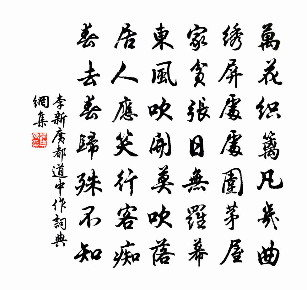 詩詞名句歷史字典書法欣賞書法字典國語詞典說文解字康熙字典古漢語字典標 題 作 者 詩 句 廣都道中作作者:李新 朝代:宋代廣都道中作原文萬花織籬凡幾曲,繡屏處處圍茅屋。家貧張日無羅幕,東風吹開莫吹落。居人應笑行客痴,春去春歸殊不知。詩詞問答問:廣都道中作的作者是誰?答:李新問:廣都道中作寫於哪個朝代?答:宋代李新廣都道中作書法欣賞廣都道中作書法作品詩詞推薦滿江紅 送劉叔謙御史張之翰〔元代〕滿酌離杯,留不住、繡衣行客。還正是、登車攬轡,慨然時節。白簡才辭烏府去,紅塵旋被青山隔。看弓刀千騎擁村東晚眺陸游〔宋代〕興來信步過東陂,最愛村東物象奇。藤杖穿雲秋望處,葛衣沾露夜歸時。殘聲淒斷蟬移樹,孤影荒寒鵲遶枝。自揣約訪王卿已而中輟次韻樓鑰〔宋代〕歸來親戚話通情,準擬流花得再行。已荷適齋容接武,敢從酌古遽渝盟。烏衣門巷我非遠,綠野樽罍計未成。官已飛來峰董嗣杲〔宋代〕理公著腳五峰前,樹石蒼浮滴翠涎。因指何年飛到此,要棲中國悟來禪。一猿可驗為靈鷲,萬古無言有冷泉。今日偶題二首杜牧〔唐代〕勞勞千里身,襟袂滿行塵。深夜懸雙淚,短亭思遠人。蒼江程未息,黑水夢何頻。明月輕橈去,唯應釣赤鱗。有恨魏漕彥成昔宰弋陽政績上聞召對改秩予適當詞胡寅〔宋代〕滁萊千頃變嘉禾,兩歲之中績效多。賞格雖懸初不用,柄臣何事有偏頗。表忠觀韓小官人葉紹翁〔宋代〕觀里韓風子,無心似有靈。繞廊時自語,捫虱故忘形。午暴松檐暖,晨餐柏葉青。客來知有饋,迎笑立中庭。即目王士禎〔清代〕蕭條秋雨夕,蒼茫楚江晦。時見一舟行,濛濛水雲外。次韻賓暘齋中獨坐五首方回〔宋代〕舞燕歌鶯子所無,不無燈照短檠書。酒來形影相酬酢,詩就煙霞共卷舒。八極渺茫供傲睨,一襟空洞極恢疏。世間登明戍堡潘鹹〔唐代〕來經古城上,極目思無窮。寇盡煙蘿外,人歸蔓草中。峰巒當闕古,堞壘對雲空。不見昔名將,徒稱有戰功。平山和韻鶴田張蘊〔宋代〕瓊花應自笑南翁,白髮棲棲逐斷蓬。兵後百年城郭是,塵間多事古今同。孤煙遠堠如常夜,五月窮邊尚冷風。可竺洞仙歌朱彝尊〔清代〕韶光最好,甚眉峰長聚。相勸乘船漾南浦。盼海棠簪後插到茶蘼,同夢裡又是楝花風雨。橋東芳草岸,勝樂遊原,偈頌二百零五首釋正覺〔宋代〕拽石般土,打鼓作舞。意不立玄,機不停午。踏破草鞋赤腳行,見成底事休回互。不回互,大龍不受玄沙瞞,前面送張忠州使君八兄二首曾協〔宋代〕邂逅江乾不自期,坐傾談屑看霏霏。豈無清禁摛華地,只得名城衣錦歸。惜別定知雙鬢換,問詩常恨寸心違。目窮江城子元好問〔金代〕旗亭誰唱渭城詩。酒盈卮。兩相思。萬古垂楊,都是折殘枝。舊見青山青似染,緣底事,澹無姿。情緣不到木腸兒蘭花二首易士達〔宋代〕曲水流邊苔色浸,右軍遺墨動清吟。蕙風和暢人非昔,香得山陰直到今。梅開次韻答葉教授二首項安世〔宋代〕春風一點暗驚梅,便有千花動地開。卻似德人方寸事,等間流向筆端來。宿劉溫書齋張喬〔唐代〕不掩盈窗月,天然格調高。涼風移蟋蟀,落葉在離騷。回筆挑燈燼,懸圖見海濤。因論三國志,空載幾英豪。丙申元日五絕方回〔宋代〕新年仍著舊年衣,老健深慚七十希。一炷爐香拜天地,今春早早買船歸。廣鑒大師觀上人為靈芝數百眾故乞從檀施乞米毛滂〔宋代〕靈芝有良田,歲比萬戶侯。平生有力耕,以德作耡耰。不許倉箱豐,但知缽盂秋。木魚一呼飯,千屐如水流。靈芝名句推薦謫仙何處,無人伴我白螺杯。黃庭堅《水調歌頭·遊覽》 雪沫乳花浮午盞,蓼茸蒿筍試春盤。蘇軾《浣溪沙·細雨斜風作曉寒》 黃葉覆溪橋,荒村唯古木。柳宗元《秋曉行南谷經荒村》 三五年時三五月,可憐杯酒不曾消。黃景仁《綺懷》 兵可千日而不用,不可 一日而不備。李大師、李延壽《南史·列傳·卷六十一》 花意爭春,先出歲寒枝。辛棄疾《江神子·賦梅寄余叔良》 至今窺牧馬,不敢過臨洮。西鄙人《哥舒歌》 觀其交遊,則其賢不肖可察也管仲《管子·權修》 寒月悲笳,萬里西風瀚海沙。納蘭性德《採桑子·塞上詠雪花》 千貫買田,萬貫結鄰。佚名《增廣賢文·下集》