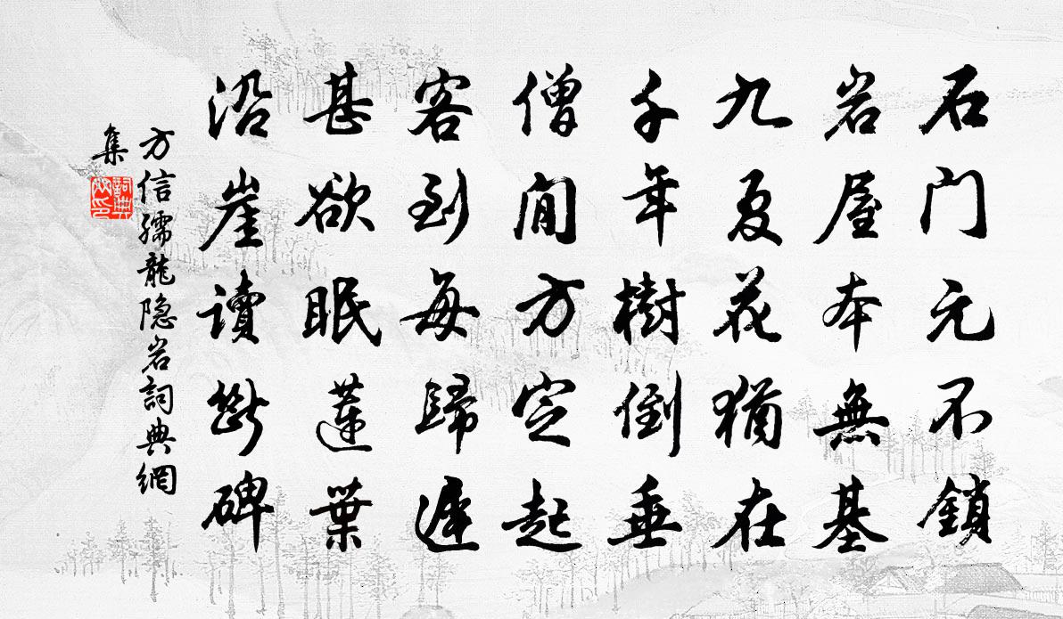 詩詞名句歷史字典書法欣賞書法字典國語詞典說文解字康熙字典古漢語字典標 題 作 者 詩 句 龍隱岩作者:方信孺 朝代:宋代龍隱岩原文石門元不鎖,岩屋本無基。九夏花猶在,千年樹倒垂。僧閒方定起,客到每歸遲。甚欲眠蓮葉,沿崖讀斷碑。詩詞問答問:龍隱岩的作者是誰?答:方信孺問:龍隱岩寫於哪個朝代?答:宋代方信孺龍隱岩書法欣賞龍隱岩書法作品詩詞推薦洛中早春贈樂天劉禹錫〔唐代〕漠漠復靄靄,半晴將半陰。春來自何處,無跡日以深。韶嫩冰後木,輕盈煙際林。藤生欲有托,柳弱不自任。花意登南嶽山真德秀〔宋代〕煙霞本成癖,況復游名山。舉手招白雲,欲納懷袖間。咄哉亦痴絕,有著即名貪。振衣遇長風,浩浩天地寬。正月二十日出城張九成〔宋代〕春風驅我出,騎馬到江頭。出門日已暮,獨游無獻酬。江山多景物,春色滿汀洲。隔岸花繞屋,斜陽明戍樓。人家鰲山下燈市即事顧逢〔宋代〕元夕牌燈大字題,高懸彩架果然奇。鰲山山下人來往,只聽笙歌不看詩。題余不溪廢寺皎然〔唐代〕武原離亂後,真界積塵埃。殘月生秋水,悲風起故台。居人今已盡,棲鴿暝還來。不到無生理,應堪賦七哀。挽曾原伯大卿孫應時〔宋代〕夙昔吾何幸,龍門獲御公。青燈鳴夜雨,白髮對春風。契闊今安訪,蹉跎愧所蒙。源流千古意,鉛槧若為功。湖山十詠王希呂〔宋代〕山光擁翠落杯中,水色天容上下同。身入蓬山人不悟,碧桃無數倚春風。南湖書院趙汝譡〔宋代〕捍川始成邑,巡甸遂建都。千載倚修堤,三吳達高塗。衛軍弛馬牧,令尹司官湖。濬中深有蓄,豐外堅無虞。往昔聞角呈宗諭方蕙岩武衍〔宋代〕曉角吹愁客夢寒,一聲聲落曲屏閒。吳兒可殺無風味,老卻梅花只當閒。檐卜花蔣梅邊〔宋代〕清淨法身如雪瑩,肯來林下見孤芳。樹花六月無炎暑,省爇銅匜幾炷香。排悶陸游〔宋代〕白髮無端日日新,自憐猶作百憂身。孤燈聽雨常終夜,一榼尋花又送春。旋壓麥糕邀父老,時分菜把餉比鄰。不須春日過田明府遇焦山人蘇廣文〔唐代〕陶公歸隱白雲溪,買得春泉溉藥畦。夜靜林間風虎嘯,月明竹上露禽棲。陳倉邑吏驚烽火,太白山人訝鼓鼙。相見郊廟歌辭。祭汾陰樂章。太和王晙〔唐代〕於穆聖皇,六葉重光。太原刻頌,后土疏場。寶鼎呈符,歊雲孕祥。禮樂備矣,降福穰穰。述懷釋行海〔宋代〕五月山中長對雨,一春湖上懶看花。杜鵑莫惱 * 客,何處野泉不是家。玉樓春歐陽修〔宋代〕尊前擬把歸期說,欲語春容先慘咽。人生自是有情痴,此恨不關風與月。離歌且莫翻新闋,一曲能教腸寸結。直須答客宋祁〔宋代〕承明年老厭文書,尺奏朝通暮剖符。數領近藩君莫笑,猶勝長被鬼揶揄。玉漏遲 春日有懷張翥〔元代〕病懷因酒惱。依稀夢裡,吳娃嬌小。金縷歌殘,人去月斜雲杳。怕見棲香燕晚,又怕聽、啼花鶯曉。庭院悄。生衣釣閣鄭損〔唐代〕小閣愜幽尋,周遭萬竹森。誰知一沼內,亦有五湖心。釣直魚應笑,身閒樂自深。晚來春醉熟,香餌任浮沈。苦貧陸游〔宋代〕老作清時版籍民,深耕迨及故山春。熟思豈是天貧我,妄計還憂鬼笑人。但使甑中余麥飯,何妨澗底采荊薪。此窮襄城道中懷曼叔韓維〔宋代〕吾交作尉地,南望一淹留。歲月催人老,山川記子游。向城非昔勇,遇物更春愁。獨喜高陽近,嵐光逼馬頭。名句推薦愛多者則法不立,威寡者則下侵上。韓非及後人《韓非子·內儲說上七術》 幾日喜春晴,幾夜愁春雨。高觀國《卜運算元·泛西湖坐間寅齋同賦》 前村深雪裡,昨夜一枝開。齊己《早梅》 千形萬象竟還空,映水藏山片復重。來鵠《雲》 善處事者,但就是非可否,審定章程,而不必利於己。王永彬《圍爐夜話·第九則》 雲中誰寄錦書來,雁字回時,月滿西樓。李清照《一剪梅·紅藕香殘玉簟秋》 白鳥明邊帆影直。隔江聞夜笛。周密《聞鵲喜·吳山觀濤》 故人遠,問誰搖玉佩,檐底鈴聲。蔣捷《聲聲慢·秋聲》 黑雲壓城城欲摧,甲光向日金鱗開。李賀《雁門太守行》 昨夜笙歌容易散,酒醒添得愁無限馮延巳《鵲踏枝·梅落繁枝千萬片》