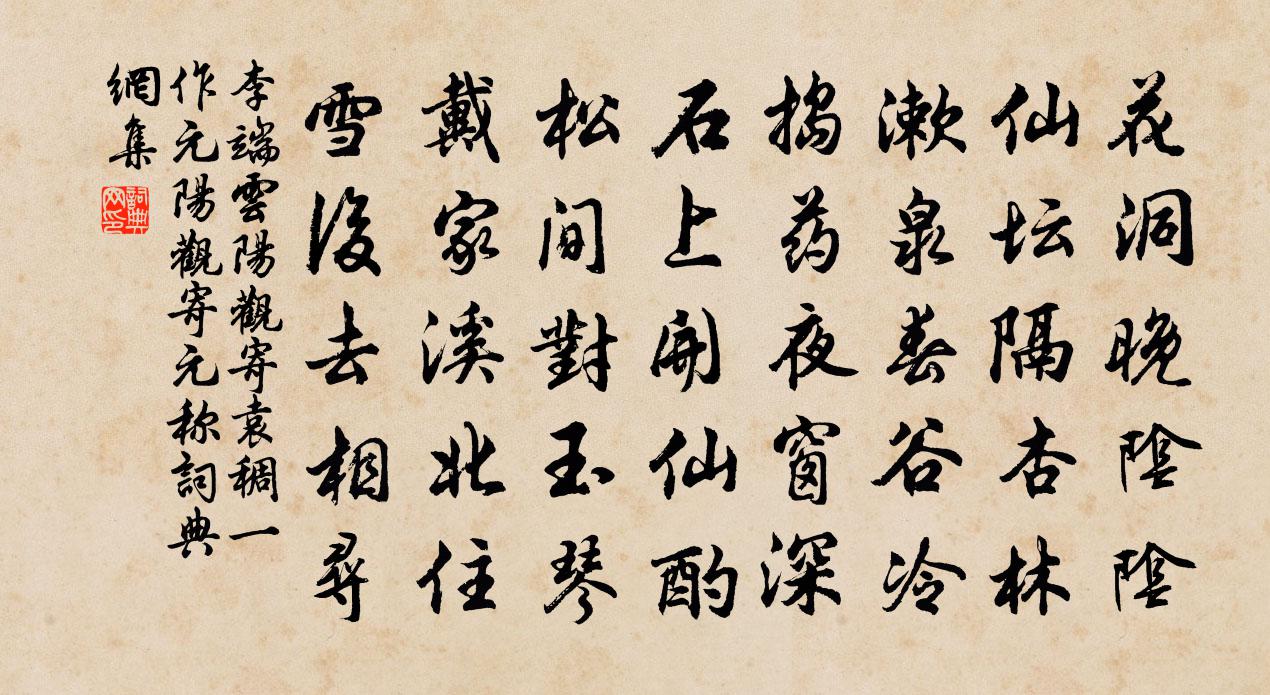 詩詞名句歷史字典書法欣賞書法字典國語詞典說文解字康熙字典古漢語字典標 題 作 者 詩 句 雲陽觀寄袁稠(一作元陽觀寄元稱)作者:李端 朝代:唐代原文花洞晚陰陰,仙壇隔杏林。漱泉春谷冷,搗藥夜窗深。石上開仙酌,松間對玉琴。戴家溪北住,雪後去相尋。詩詞問答問:《雲陽觀寄袁稠(一作元陽觀寄元稱)》的作者是誰?答:李端問:該詩寫於哪個朝代?答:唐代書法欣賞雲陽觀寄袁稠(一作元陽觀寄元稱)書法作品注釋全唐詩:卷285_29詩詞推薦東城尋春白居易〔唐代〕老色日上面,歡情日去心。今既不如昔,後當不如今。今猶未甚衰,每事力可任。花時仍愛出,酒後尚能吟。但恐閏月二十日離玉山八月到餘干易舟又二日抵鄱趙蕃〔宋代〕岸盡催撐渡,風橫促解橋。傳聞記常歲,偉觀得今朝。時有疎鍾度,誰雲隔岸遙。明當絕溪去,應為好山招。叔度賢良再用游字韻見貽複次韻謝之喻良能〔宋代〕夕郎分閫鎮東秋,幕下揮毫秦少游。一代風流今不泯,百年文物尚堪求。交情莫逆人誰似,吟事方殷歲又遒。他日宿大明寺郭印〔宋代〕歷覽成終日,禪房處處深。野僧應怪見,俗客可幽尋。煙竹寒垂幄,風松靜鼓琴。清談不知寐,明月到天心。詠史徐鉉〔唐代〕京洛多權豪,游服相隨。青牛中甸車,白馬連環羈。珩佩競照耀,紳組舊參差。騶鳴行人駐,倏若流風馳。名園不再游玄都觀劉禹錫〔唐代〕百畝庭中半是苔,桃花淨盡菜花開。種桃道士歸何處,前度劉郎今又來。鷓鴣天·戊午拜復職奉祠之命辛棄疾〔宋代〕老退何曾說著官。今朝放罪上恩寬。便支香火真侍俸,更綴文書舊殿班。扶病腳,洗衰顏。快從老病借衣冠。此身聞蛩徐集孫〔宋代〕獨搔短髮坐更深,夜雨書燈半欲陰。近日病魔詩思澀,一秋清句付蛩吟。安邑王校書居耿湋〔唐代〕秋來池館清,夜聞宮漏聲。迢遞玉山迥,泛灩銀河傾。琴上松風至,窗里竹煙生。多君不家食,孰雲事岩耕。壽李悅齋五首和三勞使尹使君韻程公許〔宋代〕衡泌春無盡,湖天風快哉。書堂三壽語,仙籍幾生來。一發扶周鼎,千金築隗台。人心索調護,根本要須培。用洪覺范詩為首作四絕趙蕃〔宋代〕釣舟無事白鷗閒,自是江湖境界寬。我欲泛然隨所往,竹君誰與報平安。暮春三首張耒〔宋代〕應接非吾事,深幽興有餘。筍深鳴鳥下,花薄午風疏。草淺見飛雉,溪清生細魚。端居亦多趣,不用席門車。代書寄商洛令陳成伯邵雍〔宋代〕此去替期猶半歲,商山窮僻少醫名。感傷多後風防滯,暑濕偏時疾易生。聖智不能無蹇剝,賢才方善處哀榮。斯言曾宏甫見招看海棠而郡城新有更初闔扉之令予曾幾〔宋代〕西蜀名花得許穠,晚來呼客醉花中。可憐朵朵枝枝弱,自占深深淺淺紅。收拾雖微少陵老,寵光還有翰林公。無聊沖谷過予晏齋趙蕃〔宋代〕夢裡春歸去,榴花晚欲然。窗晴書味熟,竹密鳥聲圓。多病妨搜句,逢人懶問禪。澹然無可語,危坐了爐煙。春日雜興方岳〔宋代〕沖雨沖泥處處行,物情殊不可詩情。牡丹又是一年過,春事略無三日晴。先後筍爭滕薛長,東西鷗背晉齊盟。山居和仲良春晚即事楊萬里〔宋代〕筍改齋前路,蔬眠雨後畦。晴江明處動,遠櫥看來齊。我語真雕朽,君詩妙斫泥。殷勤報春去,恰恰一鶯啼。輦下會裡人子蒙飲黃庶〔宋代〕秋風吹客衣,歸思入夢寐。相逢在千里,一飲勝百醉。果脯隨分列,不減到家味。平生金石心,顛倒獨莫棄。何時登西樓范成大〔宋代〕少年豪氣合摧鋒,青鬢朱顏萬事慵。疇昔四愁無夢到,及時一笑有誰供。詩情飲興如雲薄,草色花光似酒醲。千里寄題安福彭文昌春風樓二首楊萬里〔宋代〕沂水何人解問津,樓中蠹簡拂蛛塵。杏花壇下朱弦瑟,十指風生別是春。名句推薦相見時難別亦難,東風無力百花殘。李商隱《無題·相見時難別亦難》 靜勝躁,寒勝熱。清靜為天下正。老子《老子·德經·第四十五章》 醲肥辛甘非真味,真味只是淡無味洪應明《菜根譚·概論》 汀洲采白苹,日落江南春。柳惲《江南曲》 菩提本無樹,明鏡亦非台。惠能《菩提偈》 蘭溪三日桃花雨,半夜鯉魚來上灘。戴叔倫《蘭溪棹歌》 莫辭盞酒十分勸,只恐風花一片飛。程顥《郊行即事》 遊人記得承平事,暗喜風光似昔年。韋莊《長安清明》 玉爐香,紅蠟淚,偏照畫堂秋思。溫庭筠《更漏子·玉爐香》 知否,知否?應是綠肥紅瘦。李清照《如夢令·昨夜雨疏風驟》