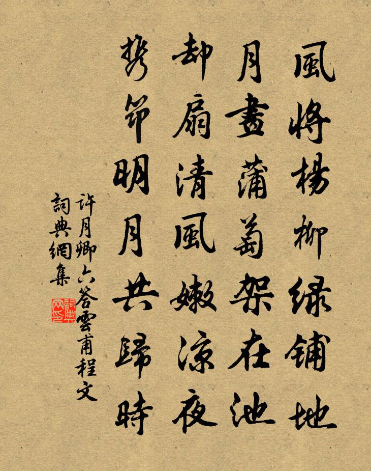 詩詞名句歷史字典書法欣賞書法字典國語詞典說文解字康熙字典古漢語字典標 題 作 者 詩 句 答雲甫程文作者:許月卿六 朝代:宋代答雲甫程文原文風將楊柳綠鋪地,月畫蒲萄架在池。卻扇清風嫩涼夜,攜筇明月共歸時。詩詞問答問:答雲甫程文的作者是誰?答:許月卿六問:答雲甫程文寫於哪個朝代?答:宋代許月卿六答雲甫程文書法欣賞答雲甫程文書法作品詩詞推薦外丹吳龍翰〔宋代〕手掇乾坤鐺里煎,神仙肘後有書傳。紅鉛黑汞一斤藥,陽火陰符六百篇。金鼎自疑三素氣,玉爐輕散九霞煙。玄霜苦雪四首高適〔唐代〕二月猶北風,天陰雪冥冥。寥落一室中,悵然慚百齡。苦愁正如此,門柳復青青。惠連發清興,袁安念高臥。余故謝胡編校惠藥醫膝病遂以藥名賦劉黻〔宋代〕益智莫如愚,誰甘遂作非。年增思續斷,親老續當歸。起石安吟久,防風見客稀。前胡古君子,松節自相依。詠馮昭儀當熊賈至〔唐代〕白羽插雕弓,霓旌動朔風。平明出金屋,扈輦上林中。逐獸長廊靜,呼鷹御苑空。王孫莫諫獵,賤妾解當熊。春日即事四絕王炎〔宋代〕小園桃李怯風雨,春事一年渾得晴。燕子欲相牽率去,踏青吾不敢徒行。路出祝融背仰見上封寺遂登絕頂張栻〔宋代〕我尋西園路,徑上上封寺。竹輿不留行,及此秋容霽。磴危霜葉滑,林空山果墜。崇蘭供清芬,深壑遞幽吹。不知寄友人張蠙〔唐代〕戀道欲何如,東西遠索居。長疑即見面,翻致久無書。甸麥深藏雉,淮苔淺露魚。相思不我會,明月幾盈虛。題金吾郭將軍石洑茅堂常袞〔唐代〕雲戟曙沈沈,軒墀清且深。家傳成棟美,堯寵結茅心。玉佩多依石,油幢亦在林。爐香諸洞暖,殿影眾山陰。草奏早花杜甫〔唐代〕西京安穩未,不見一人來。臘日巴江曲,山花已自開。盈盈當雪杏,艷艷待春梅。直苦風塵暗,誰憂容鬢催。九峰過重陽陳藻〔宋代〕登高卻是今最高,九峰寺上誦莊騷。茶話恰宜湯餅素,滿身風癢怕村醪。昔游詩 其十一姜夔〔宋代〕昔游衡山上,未曉入幽谷。欲識所坐輿,橫版掛兩竹。狀如鞦韆垂,高下不傾覆。登山九千丈,中道多佛屋。一峰句石延年〔宋代〕葉嫩藏修節,苞遺出紺膚。與鄰翁登山亭陸游〔宋代〕數掩槿籬圍夕照,一間茅舍背陰崖。吾生擾擾實無樂,人事悠悠那可諧?憂患向來侵綠鬢,登臨此日費青鞋。京華賀王起(一作賀王侍郎典貢放榜)廣宣〔唐代〕從辭鳳閣掌絲綸,便向青雲領貢賓。再辟文場無枉路,兩開金榜絕冤人。眼看龍化門前水,手放鶯飛谷口春。明日初春岩桂著花詩人太和令君首賦佳篇才臣伯和周必大〔宋代〕蟾窟雲根夜夜新,天台子落四時榮。君看月桂閒花草,猶似長春竊此名。過鄱陽湖天晴風順楊萬里〔宋代〕湖外廬山已見招,春風好送木蘭橈。青天挾日波中浴,白晝繁星地上跳。萬頃琉璃吹一葉,半簪霜雪快今朝。廬陵飯溪石葛紹體〔宋代〕一石類古鐘,范模昔誰制。開闢幾歲月,蘿蔓疑篆隸。老木上婆娑,清泉下溶{左氵右裔}。左右亂石列,拱若朝山水圖唐寅〔明代〕秋月攀仙桂,春風看杏花。一朝欣得意,聯步上京華。悶成華岳〔宋代〕勿憂李廣不封侯,廣不封侯未足憂。漢鼎不烹曹操肉,吳鉤空斷伍員頭。鴻門自昔推屠狗,虎帳於今愧沐猴。千萬句宋太宗〔宋代〕奉使南遊多好景。名句推薦梅片作團飛,雨外柳絲金濕。雷應春《好事近·梅片作團飛》 一番荷芰生池沼,檻前風送馨香。尹鶚《臨江仙·一番荷芰生池沼》 錦江近西煙水綠,新雨山頭荔枝熟。張籍《成都曲》 守節自誓,親誨之學。歐陽修《畫地學書》 天下三分明月夜,二分無賴是揚州。徐凝《憶揚州》 門外平橋連柳堤,歸來晚樹黃鶯啼。溫庭筠《春洲曲》 聚斂者,召寇、肥敵、亡國、危身之道也荀子《荀子·王制》 窈窕淑女,君子好逑。佚名《關雎》 綠葉兮素華,芳菲菲兮襲予;屈原《九歌》 細數十年事,十處過中秋。范成大《水調歌頭·細數十年事》