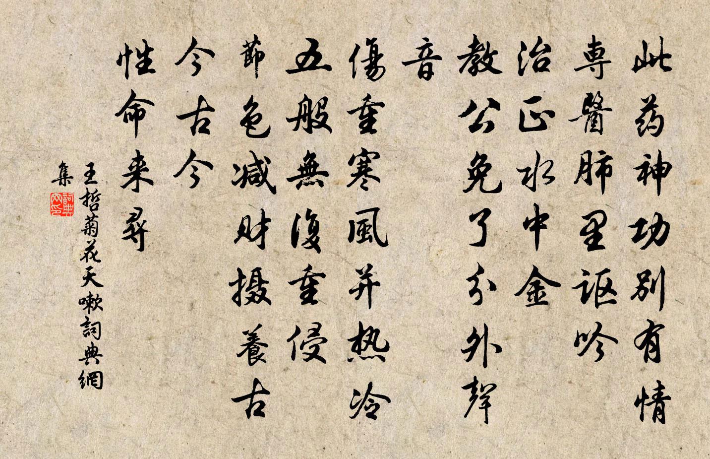 詩詞名句歷史字典書法欣賞書法字典國語詞典說文解字康熙字典古漢語字典標 題 作 者 詩 句 菊花天 嗽作者:王哲 朝代:元代菊花天 嗽原文此藥神功別有情。專醫肺里謳吟。治正水中金。教公免了,分外聲音。傷重寒風並熱冷,五般無復重侵。節色減財攝養,古今古今。性命來尋詩詞問答問:菊花天 嗽的作者是誰?答:王哲問:菊花天 嗽寫於哪個朝代?答:元代問:菊花天 嗽是什麼體裁?答:詞王哲菊花天 嗽書法欣賞菊花天 嗽書法作品詩詞推薦再和時習五章取禮記一句月令上丁習舞釋菜袁甫〔宋代〕聖道洋洋滄海如,不流天下只流洙。上丁釋菜今非古,喚起遺鳳屬我徒。歲暮書事十二首張耒〔宋代〕北風吹馬疾,石徑上危基。野俎飽貆脯,山爐煮橡糜。寒耕敲凍石,獵火上風枝。留滯親麋鹿,多慚發欲絲。休日不出張耒〔宋代〕久厭衣冠塵土浸,賜休何苦馬駸駸。窮冬積雪春不雨,昨日殘紅今綠陰。卻掃不知門外事,安禪深得靜中心。讀書失調名佚名〔宋代〕夜深簾幕靜,一曲管弦清。送林袞侍御東陽秩滿赴上都劉商〔唐代〕幾年烏府內,何處逐鳧歸。關吏迷驄馬,銅章累繡衣。野亭山草綠,客路柳花飛。況復長安遠,音書從此稀。鹹平親郊八首諸臣撰〔宋代〕有牲斯純,有俎斯陳。進於上帝,昭報深仁。住東岩釋居靜〔宋代〕月生一,東岩乍住增愁寂。紅塵世路有多端,米麵倉儲無顆粒。崖為伴,泉為匹,颯颯清風來入室。山王地暗中忙偈二首釋擇明〔宋代〕從來家富小兒嬌,偏向江頭弄畫橈。引得老爺把不住,又來船上助歌謠。袷饗太廟佚名〔宋代〕洪緒載德,盛際講畫。精崇袷事,恭展孝思。肸鄉錫義,齊莊受釐。猗歟聲烈,垂貺本支。一斛珠歐陽修〔宋代〕今朝祖宴。可憐明夜孤燈館。酒醒明月空床滿。翠被重重,不似香肌暖。愁腸恰似沈香篆。千回萬轉縈還斷。夢中送杜介歸揚州蘇軾〔宋代〕再入都門萬事空,閒看清洛漾東風。當年帷幄幾人在,回首觚稜一夢中。採藥會須逢薊子,問禪何處識龐翁。歸來超然居士得得問道於寶峰祥祥師且欲歸歌長篇釋正覺〔宋代〕門門通徹長安道,信手拈來還恰好。腳跟踏著趙州關,丈六金身一莖草。我初相會箇中人,法法圓通見懷抱。杖屨客久董嗣杲〔宋代〕衣裳敝盡客游闌,三月江城雨更寒。小店有翁賒酒易,名園無主看花難。驅馳塵土身千里,荏苒光陰指一彈。種種和關子東鐵尺歌王之望〔宋代〕先生平生無俗嗜,博取珍奇自娛戲。案間雙尺本蛟龍,怪底雄雌俱出地。含精古鐵色沈沈,質白玉兮價黃金。有時徐氏閒軒陳師道〔宋代〕倦遊梁楚愛吾廬,老寄山林孰與娛。想見杖藜臨過鳥,更能赤手縛於菟。君寧平世輕三釜,我亦東原有一區。擬買九月十日郡樓獨酌羊士諤〔唐代〕掾史當授衣,郡中稀物役。嘉辰悵已失,殘菊誰為惜。欞軒一尊泛,天景洞虛碧。暮節獨賞心,寒江鳴湍石。歸期梅花絕句陸游〔宋代〕月中疏影雪中香,只為無言更斷腸。曾與詩翁定花品,一丘一壑過姚黃。和商守雪霽登樓邵雍〔宋代〕百尺危樓小雪晴,晚來閒望逼人清。山橫暮靄高還下,水隔疏林淡復明。天際落霞千萬縷,風余殘角兩三聲。此時禪友李呂〔宋代〕寄語同參人,切忌隨他轉。若向句中尋,相逢不識面。霜葉飛(大石)周邦彥〔宋代〕露迷衰草。疏星掛,涼蟾低下林表。素娥青女斗嬋娟,正倍添淒悄。漸颯颯、丹楓撼曉。橫天雲浪魚鱗小。似故人名句推薦此去經年,應是良辰好景虛設。柳永《雨霖鈴·寒蟬淒切》 商女不知亡國恨,隔江猶唱後庭花。杜牧《泊秦淮》 主人有酒歡今夕,請奏鳴琴廣陵客。李頎《琴歌》 苦恨年年壓金線,為他人作嫁衣裳。秦韜玉《貧女》 欲窮千里目,更上一層樓。王之渙《登鸛雀樓》 國有賢相良將,民之師表也。司馬遷《史記·七十列傳·太史公自序》 花滿河陽,為君羞褪晨妝茜。吳文英《燭影搖紅·賦德清縣圃古紅梅》 寒蟬淒切,對長亭晚,驟雨初歇。柳永《雨霖鈴·寒蟬淒切》 時人不識凌雲木,直待凌雲始道高。杜荀鶴《小松》 星河秋一雁,砧杵夜千家。韓翃《酬程延秋夜即事見贈》