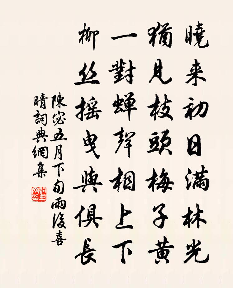 詩詞名句歷史字典書法欣賞書法字典國語詞典說文解字康熙字典古漢語字典標 題 作 者 詩 句 五月下旬雨後喜晴作者:陳宓 朝代:宋代五月下旬雨後喜晴原文曉來初日滿林光,猶見枝頭梅子黃。一對蟬聲相上下,柳絲搖曳與俱長。詩詞問答問:五月下旬雨後喜晴的作者是誰?答:陳宓問:五月下旬雨後喜晴寫於哪個朝代?答:宋代陳宓五月下旬雨後喜晴書法欣賞五月下旬雨後喜晴書法作品詩詞推薦壬辰十二月車駕東狩後即事元好問〔金代〕慘澹龍蛇日鬥爭,干戈直欲盡生靈。高原出水山河改,戰地風來草木腥。精衛有冤填瀚海,包胥無淚哭秦庭。并州朗湖道中因見二事信筆二首許月卿六〔宋代〕烏雀逢鸇皆憶鳳,鸕鶿遇獺等求魚。秋風散天無極,清曉冥冥鴻影孤。悟黃粱 贈興平楊先生馬鈺〔元代〕密密相傳理最深。向水裡,自生金。個人無口解喔吟。能雲步,曳雲襟。尋思今古修仙道,今如古,古如今。古今莫愁村易士達〔宋代〕千古行人說莫愁,荒村依舊石城頭。不知艇子今何在,漢水滔滔空自流。水調歌頭林淳〔宋代〕湖波漲新綠,環繞越王山。棠齋清晝餘暇,贏得靜中觀。四面屏圍碧玉,十里障開雲錦,冰鑒倒晴瀾。目送孤鴻遠詠史下司馬宣王陳普〔宋代〕諸葛誕謀非是誕,令狐愚計未為愚。豺狼頸項何堪抱,千載猶悲誤託孤。鹿鳴宴詩葉適〔宋代〕鹿鳴著周雅,取士各惟時。永嘉近千載,文物盛於期。賢侯奉明指,薦棘鎖秋扉。希寶難聚識,獨鑒防群嗤。誠雲虞帝廟樂歌辭張載〔宋代〕皇胡為兮西山之幽,翳長薄兮府清流。眇冀州兮何有,眷茲士兮淹留。皇之神兮如在,子我民兮不窮以愛。沛皇澤龍回院謝諤〔宋代〕堂殿塵埃外,軒欞紫翠中。憑欄千嶂雨,欹枕半窗風。得意何妨僻,尋幽豈易窮。分張閒草木,一一見春工。酬周從事望海亭見寄元稹〔唐代〕年老無流輩,行稀足薜蘿。熱時憐水近,高處見山多。衣袖長堪舞,喉嚨轉解歌。不辭狂復醉,人世有風波。朝天門城角仇遠〔宋代〕颯颯秋風起白榆,山前吹徹小單于。行人便作邊城聽,忘卻杭州是故都。監洞霄宮俞康直郎中所居四詠 逸堂蘇軾〔宋代〕新第誰來作並鄰,舊官寧復憶星辰。請君置酒吾當賀,知向江湖拜散人。送薛九被讒去魯李白〔唐代〕宋人不辨玉,魯賤東家丘。我笑薛夫子,胡為兩地游。黃金消眾口,白璧竟難投。梧桐生蒺藜,綠竹乏佳賓。鳳凰宇文氏莊觀海棠時海棠未甚開而余旦夕歸矣賦李流謙〔宋代〕雨猛幾終夕,風狂遂徹朝。眼緣春色醉,魂為客愁消。澤國空留滯,山房恐寂寥。平蕪煙一望,鄉夢太迢遙。贈僧曹汝弼〔宋代〕一從叨命服,乘興入天台。院接石橋住,門臨瀑布開。松閒應獨坐,雪裡更誰來。時復攜藜杖,看雲上古台。和林叔己詠揚守福壽林塘之韻陳淳〔宋代〕史君幽趣鍾靈台,胸中台畫如天開。居閒薄發林塘勝,根原福壽兩山來。石骨旁峙虎蹲踞,泉脈下繞龍瀊洄。高低少年游(送元素)蘇軾〔宋代〕千古風流阮步兵。平生遊宦愛東平。千里遠來還不住。歸去。空留風韻照人清。紅粉尊前深懊惱。休道。怎生留得頌古一百首釋智愚〔宋代〕你有更須當面與,渠無背手奪將來。驀然夜半化龍去,黑雨烏風裂地雷。贈筆工王諶〔宋代〕試子玉簪筆,他工總不如。毫長宜貯墨,管淨可抄書。汝自誇淮兔,吾猶註魯魚。鬢毛斑白盡,心折正緣渠。到鄂渚戴復古〔宋代〕連宵歌舞醉東樓,不信樽前有別愁。半夜月明何處笛,長江風送故人舟。十年浪跡游淮甸,一枕高眠到鄂州。明日名句推薦惜恐鏡中春。不如花草新。張先《菩薩蠻·憶郎還上層樓曲》 君言不得意,歸臥南山陲。王維《送別》 舊相思、偏供閒晝。吳文英《夜遊宮·春語鶯迷翠柳》 向河梁、回頭萬里,故人長絕。辛棄疾《賀新郎·別茂嘉十二弟》 市,朝則滿,夕則虛,非朝愛市而夕憎之也,求存故往,亡故去。劉向《戰國策·齊四·孟嘗君逐於齊而復反》 日月盈昃,辰宿列張。周興嗣《千字文·全文》 落梅庭榭香,芳草池塘綠。晏幾道《生查子·落梅庭榭香》 音塵絕,西風殘照,漢家陵闕。李白《憶秦娥·簫聲咽》 日出江花紅勝火,春來江水綠如藍。白居易《憶江南·江南好》 主失其神,虎隨其後。主上不知,虎將為狗。韓非及後人《韓非子·揚權》