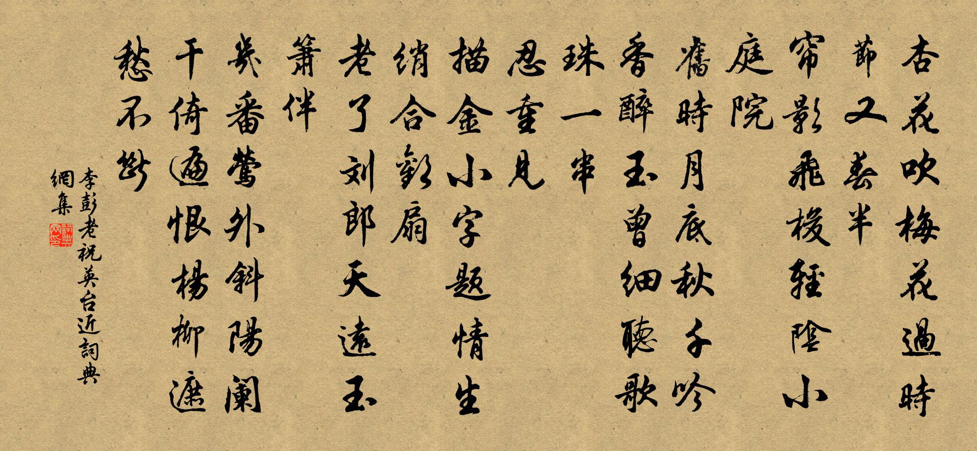 起首“杏花初 ,梅花過 ,時節又春半。”三句,點出時間為春半時節。紅杏初開,梅花盡落,由此觸起對歲月如飛的感慨。“簾影飛梭,輕陰小庭院”,寫索居獨處時百無聊賴的心境。“飛梭”,喻時間流逝之速。微陽照著低垂的簾幕,小庭院裡,一片漠漠輕陰。以上幾句重在寫景,雖用了“杏花”、“簾影”等看來是華麗的詞語,卻構成了幽悄淒寂的氛圍,詞人那孤獨的心情已隱現其中了。“舊時月底鞦韆,吟香醉玉,曾細聽 、歌珠一串 。”三句,轉入追憶。極力刻畫,精艷絕倫。想當時她在春月下打罷鞦韆,那如花似玉的美好容顏,已足以使人為之傾賞不已,何況還有她那圓轉清脆的歌聲呢!“鞦韆”一詞,不可滑眼而過。