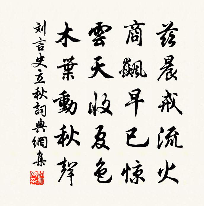 詩詞名句歷史字典書法欣賞書法字典國語詞典說文解字康熙字典古漢語字典標 題 作 者 詩 句 立秋作者:劉言史 朝代:唐代立秋原文茲晨戒流火,商飆早已驚。雲天收夏色,木葉動秋聲。詩詞問答問:立秋的作者是誰?答:劉言史問:立秋寫於哪個朝代?答:唐代問:立秋是什麼體裁?答:五絕劉言史立秋書法欣賞立秋書法作品注釋全唐詩:卷468-19詩詞推薦東林寺贈宜上人董嗣杲〔宋代〕幽階苔蘚翠纖纖,屐齒沾濡逐步黏。曉澗迸泉迷杏塢,春風停雨暗茅檐。禪高何待音聲悟,詩好爭傳格律嚴。誰浼冬至日獨游吉祥寺陳襄〔宋代〕東群意淺著寒梅,十朵深紅未暇裁。安得道人殷七與,不論時節遣花開。石版李鹹用〔唐代〕高人好自然,移得它山碧。不磨如版平,大巧非因力。古蘚小青錢,塵中看野色。冷倚砌花春,靜伴疏篁直。山僧閒書二首方回〔宋代〕年年心事樂陶陶,氣不低垂亦不豪。酒飲八分何必滿,棋贏一子便為高。修行到此元非易,把捉從今更要牢。縉笏隔牆聞正父鄉飲甚樂偶畏風不預用前韻敬簡張栻〔宋代〕元日忻晴色,新年只舊心。故人同客里,鄉話自情深。盡說成都酒,休為楚澤吟。相逢須痛飲,歲月易侵尋。解秩西還夕次葛驛二通判與簽判學士留府諸君蘇頌〔宋代〕遠行車馬出西城,風義相高一府傾。留幕經年叨主諾,郵亭終夕困飛觥。人煙數舍將歸路,霜月三冬愴別情。政拙靜林精舍靈一〔唐代〕靜林溪路遠,蕭帝有遺蹤。水擊羅浮磬,山鳴于闐鍾。燈傳三世火,樹老萬株松。無數煙霞色,空聞昔臥龍。王德言樞密生日十首曹勛〔宋代〕籍甚家聲孰可儔,玉堂金馬著清修。已攄荷橐三千牘,行相楓宸十二旒。春暮吟邵雍〔宋代〕花開春正好,花謝春還暮。不意子規禽,猶能道歸去。好事近管鑒〔宋代〕列炬照梅花,仰看滿空春雪。翠幕沈沈天淨,掛一鉤新月。微風不動暖光融,金杯墮瓊屑。仿佛暗香吹夢,醉廣寒贈天隱李君瑞一首劉克莊〔宋代〕唱名納祿尤崖異,誓墓休官更崛奇。先輩翔而皆集矣,廣文得此欲逃之。聖門豈不高曾皙,列傳何為首伯夷。虎帥長門怨劉皂〔唐代〕雨滴長門秋夜長,愁心和雨到昭陽。淚痕不學君恩斷,拭卻千行更萬行。憶舊遊(新朋故侶,詩酒遲留,吳山蒼蒼,渺渺兮余懷也。寄沈堯道諸公)張炎〔宋代〕記開簾過酒,隔水懸燈,款語梅邊。未了清遊興,又飄然獨去,何處山川。淡風暗收榆莢,吹下沈郎錢。嘆客里光偈頌七十八首釋正覺〔宋代〕地水火風休假藉,一切不留還脫灑。家風廓落等虛空,田地虛明非晝夜。鳥道須知舉足難,玄機不許絲頭掛。同中重陽後絕句五首方回〔宋代〕梧桐疏葉間微黃,年例江南未肯涼。菊自此花三兩月,樽前日日是重陽。呂司空輓詞三首蘇轍〔宋代〕將相家聲近,勛名晚歲隆。給扶安舊德,賜府壓群公。不見彌縫跡,空推翼戴功。山公舊多可,寒士泣清風。工侍國史李丈奉御香禱雪上竺前一夕雪瑞已應程公許〔宋代〕阿佛常時奮老拳,為銜詔旨意精專。且煩大士開顏笑,吹散曼陀黼扆前。醉蓬萊晁端禮〔宋代〕向重門深閉,永夜孤眠,夢魂飛過。夢裡分明,共玉人雙臥。粉淡香濃,翠深紅淺,是那回梳裹。楚雨難成,巫雲軒游宮十五夜李隆基〔唐代〕行邁離秦國,巡方赴洛師。路逢三五夜,春色暗中期。關外長河轉,宮中淑氣遲。歌鐘對明月,不減舊遊時。同李益、崔放送王鍊師還樓觀,兼為群公先營山居孟郊〔唐代〕十年白雲士,一卷紫芝書。來結崆峒侶,還期縹緲居。霞冠遺彩翠,月帔上空虛。寄謝泉根水,清泠閒有餘。名句推薦嘆息此人去,蕭條徐泗空李白《經下邳圯橋懷張子房》 遙憶獨眠人,早寒驚夢頻。顧貞觀《菩薩蠻·山城夜半催金柝》 明主思短而益善,暗主護短而永愚。吳兢《貞觀政要·卷二·論求諫》 若問相思甚了期,除非相見時。晏幾道《長相思·長相思》 算翠屏應是,兩眉餘恨倚黃昏。孔夷《南浦·旅懷》 江暗雨欲來,浪白風初起。何遜《相送》 探其懷,奪之威。主上用之,若電若雷。韓非及後人《韓非子·揚權》 是他春帶愁來,春歸何處。辛棄疾《祝英台近·晚春》 故人離別盡,淇上轉驂騑。王維《送魏郡李太守赴任》 江皋樓觀前朝寺,秋色入秦淮。徐再思《人月圓·甘露懷古》