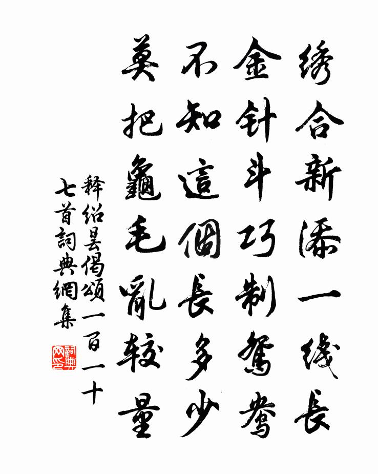 詩詞名句歷史字典書法欣賞書法字典國語詞典說文解字康熙字典古漢語字典標 題 作 者 詩 句 偈頌一百一十七首作者:釋紹曇 朝代:宋代偈頌一百一十七首原文繡合新添一線長,金針鬥巧制鴛鴦。不知這個長多少,莫把龜毛亂較量。詩詞問答問:偈頌一百一十七首的作者是誰?答:釋紹曇問:偈頌一百一十七首寫於哪個朝代?答:宋代釋紹曇偈頌一百一十七首書法欣賞偈頌一百一十七首書法作品詩詞推薦延平次趙糾曹韻十四首劍歸陳宓〔宋代〕神龍澤一世,豈但三尺用。清潭知幾許,吞 * 雲夢。題狠石張舜民〔宋代〕江北江南一道兵,匆匆據石各論情。功成與爾游滄海,此語當初是至誠。又和黃清表惠早梅吳芾〔宋代〕姑射風姿絕點埃,年年長是臘前開。方疑今歲無訊息,多謝君能折取來。謝高茶使遣餉頭貢余趙汝騰〔宋代〕東風吹折鳳山芽,驛獻花箱仗使家。遙想仙芳供御盌,應憐味諫落天涯。厥包錫貢何年始,其苦如飴信地嘉。齋祭賦滕王閣謁辛稼軒胡時可〔宋代〕滕王高閣臨江渚,帝子不來春已暮。鶯啼紅樹柳搖風,猶似當年舊歌舞。中夜睡覺兩目每有光如初日曆歷照物晁文元公陸游〔宋代〕人情所願欲,莫若貴與富。是皆有命焉,非力可成就。予昔未有聞,無與發其覆。趑趄強幹祿,時命適大謬。方行詠漢高祖王珪〔唐代〕漢祖起豐沛,乘運以躍鱗。手奮三尺劍,西滅無道秦。十月五星聚,七年四海賓。高抗威宇宙,貴有天下人。憶昔毋忽詩周端臣〔宋代〕毋忽咫尺水,中恐有伏龍。毋忽尋丈山,中恐有毒蟲。是以古君子,不敢欺盲聾。審密言語間,戒謹闇室中。幾微文宣王及其弟子贊宋高宗〔宋代〕易之為書,彌合天地。五十乃學,師則有是。子能受授,洗心傳世。知機其神,宜被厥祀。三叟者訣楊維楨〔元代〕道逢三叟者,高壽比神仙。問叟何以壽?壽訣倘予傳。上叟前致辭,大道抱天全。中叟前致辭,寒暑順節宣。下叟偈頌一百二十三首釋祖欽〔宋代〕鐵牛對對黃金角,木馬雙雙白玉蹄。明舉似君如未會,江南三月鷓鴣啼。次韻錢申伯游東山既歸述懷之章張元乾〔宋代〕山人不省大明宮,懷昔幽尋自改容。廬阜東西二林寺,錢塘南北兩高峰。百年有盡雲歸壑,萬事無邊月掛松。滿院暑夕三首王鎡〔宋代〕草蚊聲歇樹鳴螿,碧漢無人夜氣涼。起向翠爐更宿炭,一絲沉水有殘香。寄南仲仇遠〔宋代〕坡翁昔年五十二,翰林侍讀為學士。溪翁年德與坡同,官職胡為未相似。我道閒人勝貴人,儻來軒冕溪雲比。翁今沁園春葛長庚〔宋代〕暫聚如萍,忽散似雲,無可奈何。向天涯海角,兩行別淚,風前月下,一片離騷。啼罷棲烏,望窮芳草,此恨與之失調名佚名〔宋代〕曾教入夜月添白。惜別行送劉僕射判官(僕射乃其主將劉乃僕射之判官也)杜甫〔唐代〕聞道南行市駿馬,不限匹數軍中須。襄陽幕府天下異,主將儉省憂艱虞。只收壯健勝鐵甲,豈因格鬥求龍駒。而今虎圖王安石〔宋代〕壯哉非羆亦非貙,日光夾鏡當坐隅。橫行妥尾不畏逐,顧盼欲去仍躊躇。卒然我見心為動,熟視稍稍摩其須。固知醉蓬萊仲殊〔宋代〕報一陽初動,二五蓂疏,履長時候。大昴星精,宛分靈儲秀。早運鈞衡,亟還貂袞,向載歌成後。書展儀形,承華蓬萊客 贈譚公馬鈺〔元代〕於郎急。留心長在船頭客。船頭客。殺魚蝦命,罪根非隔。把予言語休胡測。速燒船綱冤魂溺。冤魂溺。要全靈物名句推薦相逢成夜宿,隴月向人圓。杜甫《宿贊公房》 命由我作,福自己求。袁黃《了凡四訓·立命之學》 善惡同,則功臣倦。黃石公《三略·上略》 始憐幽竹山窗下,不改清陰待我歸。錢起《晚春歸山居題窗前竹 / 暮春歸故山草堂詩》 多事年年二月風,翦出鵝黃縷。納蘭性德《卜運算元·新柳》 草木搖殺氣,星辰無光彩。李白《經亂離後天恩流夜郎憶舊遊書懷贈江夏韋太守良宰》 童孫未解供耕織,也傍桑陰學種瓜。范成大《夏日田園雜興·其七》 世事悠悠渾未了,年光冉冉今如許。吳潛《滿江紅·送李御帶珙》 冬無愆陽,夏無伏陰,春無淒風,秋無苦雨左丘明《左傳·昭公·昭公四年》 寄書長不達,況乃未休兵。杜甫《月夜憶舍弟》