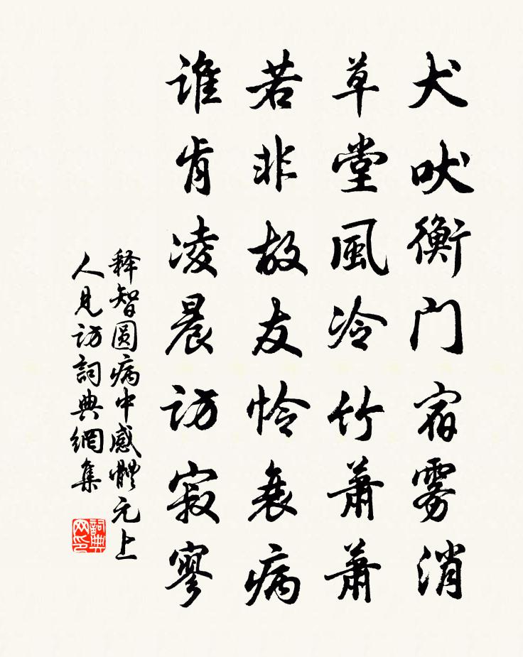 詩詞名句歷史字典書法欣賞書法字典國語詞典說文解字康熙字典古漢語字典標 題 作 者 詩 句 病中感體元上人見訪作者:釋智圓 朝代:宋代病中感體元上人見訪原文犬吠衡門宿霧消,草堂風冷竹蕭蕭。若非故友憐衰病,誰肯凌晨訪寂寥。詩詞問答問:病中感體元上人見訪的作者是誰?答:釋智圓問:病中感體元上人見訪寫於哪個朝代?答:宋代釋智圓病中感體元上人見訪書法欣賞病中感體元上人見訪書法作品詩詞推薦行營送馬侍御戴叔倫〔唐代〕萬里羽書來未絕,五關烽火晝仍傳。故人多病盡歸去,唯有劉禎不得眠。偈釋省回〔宋代〕南番人泛船,塞北人搖艫。波斯入大唐,須彌山作舞。南鄉子晏幾道〔宋代〕畫鴨懶薰香,繡茵猶展舊鴛鴦。不似同衾愁易曉,空床。細剔銀燈怨漏長。幾夜月波涼,夢魂隨月到蘭房。殘睡覺九絕為亞卿作韓駒〔宋代〕君住江邊起畫樓,妾居海角送潮頭。潮中有妾相思淚,流到樓前更不流。和況子提刑途中遇雪韓維〔宋代〕雪凝野曠接高低,切切寒侵使者衣。客路怳驚霜鬢改,家山回望玉觴飛。更添宿雨催花潤,未放春雷起蟄威。柳色謝韓實之直閣送燈陸游〔宋代〕玉作華星綴絳繩,樓台交映暮天澄。東都父老今誰在,腸斷當時諫浙燈!寄題蠲流亭唐士恥〔宋代〕烏傷仇覽仙,一弓扁蠲流。清流從誰蠲,濁流石之幽。石之幽定可,齒齒翻成憂。君看得失珠,象罔無全牛。渰中水淺輿從下水肩舟二首岳珂〔宋代〕揚塵驚淺瀨,平陸比通津。絕臏正扛鼎,化身如轉輪。未輿譏代畜,不狩愧懸鶉。誰借商岩手,一嵩煙水春。送王炎弼赴山陽守以兵衛森畫戟宴寢凝清香為曾協〔宋代〕公材如武庫,劍槊方森森。亦復擅風流,坐繼正始音。贈從弟弘元謝靈運〔南北朝〕緬邈荊巫。杳翳江湍。三千既曠。繇役實難。想像微景。延佇音翰。因雲往情。感風來嘆。題鏡湖野老所居 [一作秦系詩]馬戴〔唐代〕湖裡尋君去,樵風往返吹。樹喧巢鳥出,路細葑田移。漚薴成漁網,枯根是酒卮。老年唯自適,生事任群兒。送二季之江東李白〔唐代〕初發強中作,題詩與惠連。多慚一日長,不及二龍賢。西塞當中路,南風欲進船。雲峰出遠海,帆影掛清川。禹穴天花寺呂夷簡〔宋代〕賀家湖上天花寺,一一軒窗向水開。不用閉門防俗客,愛間能有幾人來。送閒師歸江南張籍〔唐代〕遍住江南寺,隨緣到上京。多生修律業,外學得詩名。講殿偏追入,齋家別請行。青楓鄉路遠,幾日盡歸程。贈溧陽宋少府陟李白〔唐代〕李斯未相秦,且逐東門兔。宋玉事襄王,能為高唐賦。常聞綠水曲,忽此相逢遇。掃灑青天開,豁然披雲霧。葳蕤悼亡九首張耒〔宋代〕欲治煩惱更無方,只有頭陀理最長。不待存亡始知夢,故應交臂已淒涼。送鮮于漕吳泳〔宋代〕樹德必欲滋,去疾必欲除。世人亡分明,蒿蘭同一鋤。鳳兮德之美,誰不相稱譽。翻韛下霜雲,義蓋非鶻如。煌煌偈頌七十六首釋師觀〔宋代〕上元佳節是今日,匝地普天星斗出。好向機先著眼看,莫教蹉過然燈佛。續韋蟾句武昌妓〔唐代〕悲莫悲兮生別離,登山臨水送將歸。武昌無限新栽柳,不見楊花撲面飛。讀杜子美詩韓維〔宋代〕寒燈熠熠宵漏長,顛倒圖史形勞傷。取觀杜詩盡累紙,坐覺神氣來洋洋。高言大義經比重,往往變化安能常。壯哉名句推薦上言加餐食,下言長相憶。佚名《飲馬長城窟行》 君子少思長,則學;老思死,則教;有思窮,則施也。荀子《荀子·法行》 何期今日酒,忽對故園花。文森《九日》 請君看取東流水,方識人間別意長。嚴仁《鷓鴣天·惜別》 客子光陰詩卷里,杏花訊息雨聲中。陳與義《懷天經智老因訪之》 門外平橋連柳堤,歸來晚樹黃鶯啼。溫庭筠《春洲曲》 濁酒一杯家萬里,燕然未勒歸無計。范仲淹《漁家傲·秋思》 民不畏死,奈何以死懼之?老子《老子·德經·第七十四章》 若對黃花孤負酒,怕黃花、也笑人岑寂。劉克莊《賀新郎·九日》 暝色入高樓,有人樓上愁。李白《菩薩蠻·平林漠漠煙如織》
