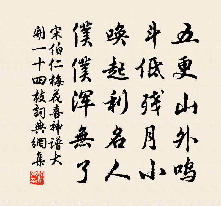 詩詞名句歷史字典書法欣賞書法字典國語詞典說文解字康熙字典古漢語字典標 題 作 者 詩 句 梅花喜神譜大開一十四枝作者:宋伯仁 朝代:宋代梅花喜神譜大開一十四枝原文五更山外鳴,斗低殘月小。喚起利名人,僕僕渾無了。詩詞問答問:梅花喜神譜大開一十四枝的作者是誰?答:宋伯仁問:梅花喜神譜大開一十四枝寫於哪個朝代?答:宋代宋伯仁梅花喜神譜大開一十四枝書法欣賞梅花喜神譜大開一十四枝書法作品詩詞推薦自覺二首方回〔宋代〕忍垢包羞混世塵,胸中無物只天真。平生我亦輕餘子,此日君當如醉人。鍾乳金釵空喪志,鱸魚蓴菜向知津。中行登寶公塔李流謙〔宋代〕樹老巢翻鷹亦化,錫飛近地鶴猶驚。太平寺主今安在,潮打山圍建業城。南城詠古迺賢〔元代〕落日燕城下,高台草樹秋。千金何足惜,一士固難求。淪海誰青眼?空山盡白頭。還憐易河水,今古只東流。如夢令(秋懷)張仲宇〔宋代〕送過雕梁舊燕。聽到妝樓新雁。菊訊一何遲,倒盡清樽誰伴。魂斷。魂斷。人與暮雲俱遠。醉蓬萊(代壽昌州守叔祖)李曾伯〔宋代〕記石湖佳句,為海棠花,合來西蜀。不道東州,更香霏情淑。漢竹光中,召棠陰里,想清歡未足。少駐旌麾,姑留紹興祀太社太稷十七首佚名〔宋代〕乃粒函民,工昭萬古。國有常祀,薦獻式斜。肅肅雍纊,舊章鹹舉。神保聿歸,介我稷黍。喜雨陸游〔宋代〕勢掠郊原飛急雪,聲搖窗戶過奔雷。坐知多稼連雲熟,不獨新涼傍枕來。攬鏡六言三首劉克莊〔宋代〕背傴水牛泅磵,發 * 蠶吐絲。貌醜似猴行者,詩瘦於鶴何師。次前韻酬王景雲見和三首陳著〔宋代〕與子相逢別未長,新詩寄我寂寞鄉。嚼情咀義心如醉,背立西風不自將。和徐季功舒蘄道中二十首王之道〔宋代〕庭閒人靜鳥窺簾,坐對文書亦倦拈。春旱正須三尺雨,江湖寧放老蛟潛。巴陵歐陽玭〔唐代〕孤城向夕原,春入景初暄。綠樹低官舍,青山在縣門。樓台疑結蜃,枕席更聞猿。客路何曾定,棲遲欲斷魂。江行趙葵〔宋代〕霜清月冷雁聲秋,今古江流不盡愁。風卷蘆花漫雪裹,夜深鼓櫂落汀洲。贈淨因臻長老蘇轍〔宋代〕十方老僧十年舊,燕坐繩床看奔走。遠遊新自濟南來,滿身自覺多塵垢。暖湯百斛勸我浴,驪山袞袞泉傾竇。明窗登壇作趙善括〔宋代〕一壇橫壓紺天低,好向雲端覲紫微。林鶴慣聞鑫磬舞,煙鸞疑認玉台飛。步虛聲徹空猶響,寶篆香銷露未晞。星斗田單王安石〔宋代〕湣王萬乘齊,走死區區燕。田單一即墨,掃敵如風旋。舞鳥怪不測,騰牛怒無前。飄颻樂毅去,磊砢功名傳。掘葬說詩八首宋湘〔清代〕三百詩人豈有詩,都成絕唱沁心脾。今人不講源頭水,只問支流派是誰。塗脂傳粉畫長眉,按拍循腔疾復遲。學過讀書有感陳普〔宋代〕弄舌儀秦久厭看,無言混沌自安間。人心何日無堯舜,道學終天有孔顏。五鬼不磨吾道義,二秦長是此江山。窗前句王操〔宋代〕彩箋分卷碧雲薄,蠟燭對燒紅淚乾。餞康侯二首楊公遠〔宋代〕報政三年滿,還容借寇么。絲綸來帝幄,褚夸藹民歌。遺愛棠陰茂,留傳錦句多。蒼生今有待,霖雨早滂沱。西江月王惟一〔元代〕太極未分混沌,兩儀已非其中。一陽才動破鴻蒙。造化從茲運用。水火升沉南北,木金間隔西東。略移斗柄指坤宮名句推薦北極朝廷終不改,西山寇盜莫相侵。杜甫《登樓》 亂雲低薄暮,急雪舞迴風。杜甫《對雪》 野老念牧童,倚杖候荊扉。王維《渭川田家》 夏條綠已密,朱萼綴明鮮。韋應物《夏花明》 行人悵望蘇台柳,曾與吳王掃落花。姜夔《姑蘇懷古》 登高望蓬流,想像金銀台。李白《游泰山六首》 月華今夜黑,全見梨花白。楊基《菩薩蠻·水晶簾外娟娟月》 夜月一簾幽夢,春風十里柔情。秦觀《八六子·倚危亭》 奢侈之敗家,猶出常情;而慳吝之敗家,必遭奇禍。王永彬《圍爐夜話·第五九則》 民惟邦本,本固邦寧。佚名《尚書·夏書·五子之歌》