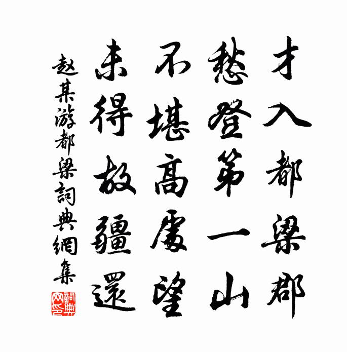 詩詞名句歷史字典書法欣賞書法字典國語詞典說文解字康熙字典古漢語字典標 題 作 者 詩 句 游都梁作者:趙某 朝代:宋代游都梁原文才入都梁郡,愁登第一山。不堪高處望,未得故疆還。詩詞問答問:游都梁的作者是誰?答:趙某問:游都梁寫於哪個朝代?答:宋代趙某游都梁書法欣賞游都梁書法作品詩詞推薦送王尚恭隰州幕歐陽修〔宋代〕去國初遊宦,從軍苦寂寥。愁雲帶城起,畫角向山飄。秋勁方馳馬,春寒正襲貂。遙知為客恨,應賴酒杯消。滿江紅(艤舟南良作)趙善括〔宋代〕三十年前,曾向此、舞風歌月。今依舊、江山如畫,鬢須如雪。故友冥鴻隨淨社,舊時秋蚓橫塵壁。賴廬峰、對我上饒方君小粹官而不婚宦居偏戶間靜無官宦之曾幾〔宋代〕掾曹官事了,載取曲生來。得酒且歡喜,俗氛安在哉。贈行腳僧子蘭〔唐代〕世界曾行遍,全無行可修。炎涼三衲共,生死一身休。片斷雲隨體,稀疏雪滿頭。此門無所著,不肯暫淹留。題林詠道浮江別業徐大受〔宋代〕密林凝書寂,一葉動須驚。砌淨飛花影,池深落果聲。正宜鋪枕簟,且復倒瓶罌。向晚催歸急,煙江野艇橫。玉蕊花岳珂〔宋代〕路入平山萬木清,松蘿薈蔚接煙甍。鹿跑泉眼涵秋影,雁帶雲容度晚晴。花徑有時傳相國,蘚碑無字紀昭明。六朝思歸樂韓偓〔唐代〕淚滴珠難盡,容殊玉易銷。儻隨明月去,莫道夢魂遙。寄南嶽客乞靈蕪香陸龜蒙〔唐代〕聞說融峰下,靈香似反魂。春來正堪采,試為劚雲根。送溫伯玉二首韓元吉〔宋代〕牛渚青山路,衰遲舊往來。西風動黃葉,朔雪記寒梅。戍鼓邊城近,樓船猛士催。然犀不用照,拔劍憶澹臺。謁顏範祠趙蕃〔宋代〕處士當年配水仙,范公亦儼客星懸。誰知舊日番君國,颯爽英姿蓋九賢。秋日郊居陸游〔宋代〕車盪比鄰例饋魚,流涎對此四腮鱸。北窗雨過涼如水,消得先生一醉無?古斷腸曲三十首周端臣〔宋代〕一篩涼雨歇亭皋,菡萏坎香可得消。玉簟怯秋眠未隱,阿誰樓上夜 * 。風入松(雙溪閣觀水)曹冠〔宋代〕瑤煙斂散媚晴空。雲淡奇峰。澄江金斗平波面,扁舟載、蓑笠漁翁。仿佛輞川圖上,依稀苕霅溪中。舂鋤掠水浪花連日雨作頓有秋意懷感之餘得詩七首書呈教授趙蕃〔宋代〕頹齡不可羈,寒事亦已迫。女褐破未紉,兒襦短仍窄。杜陵嘆女痴,淵明更兒責。返念田有翁,囷禾與機帛。到儀真沙河阻風三首吳芾〔宋代〕求退那知卻冒遷,天心人意古難全。今朝行役還堪笑,下水船為上水船。西江柳氏月江詩趙文〔宋代〕何人種此玻璃橘,掛在空高寒露濕。秋風吹墮清泠中,驚殺神髯夜深蟄。鈷鉧潭中豈無月,冷光長照衰羈泣。何如置酒簽廳觀荷徐判官攜家釀四首曾幾〔宋代〕白日紅紅花映階,高高下下葉成杯。嬌嬈似不禁長夏,故就團圞扇影來。錢陳匝峰之濂泉趙必象〔宋代〕四海人物如星晨,老成典型公一人。秋月玉壺光皎皎,飛鸞不驂翔八表。寒花晚節紛其香,春風筆底多甘棠。景定再次韻四首陳造〔宋代〕翰墨場中對抗旌,黃陳一筆萬鈞輕。武安屋瓦秋鼙震,湘水波光夜月晴。沮洳求魚真自笑,渚涯向若倍馳情。吾生劉彥修江岸帖贊岳珂〔宋代〕其忠足以繼忠顯,其教足以傳西樞。其略足以佐魏公,其識足以知二吳。名句推薦十年愁眼淚巴巴。今日思家。明日思家。汪元量《一剪梅·懷舊》 我當二十不得意,一心愁謝如枯蘭。李賀《開愁歌》 不自貴於物而物宗焉,不自重於人而人敬焉。房玄齡《晉書·列傳·第二十五章》 丈夫一言許人,千金不易。司馬光《資治通鑑·唐紀二》 曾苦傷春不忍聽,鳳城何處有花枝李商隱《流鶯》 勝地不常,盛筵難再;蘭亭已矣,梓澤丘墟。王勃《滕王閣序》 安土重遷,黎民之性;骨肉相附,人情所願也。班固《漢書·紀·元帝紀》 曉雞驚樹雪,寒鶩守冰池。李商隱《幽居冬暮》 金柳搖風樹樹,系彩舫龍舟遙岸。柳永《破陣樂·露花倒影》 然而其持之有故,其言之成理。荀子《荀子·非十二子》