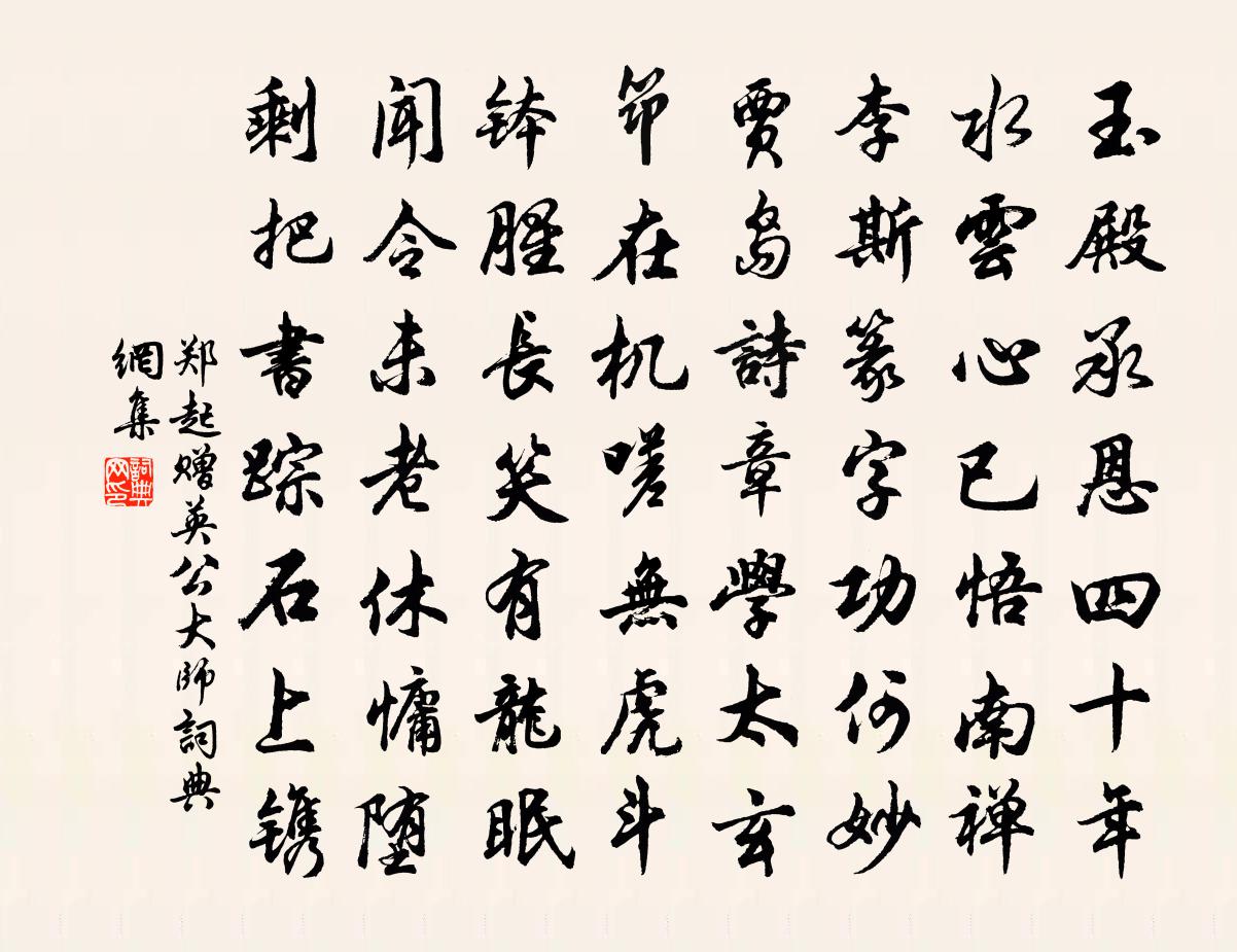 詩詞名句歷史字典書法欣賞書法字典國語詞典說文解字康熙字典古漢語字典標 題 作 者 詩 句 贈英公大師作者:鄭起 朝代:宋代贈英公大師原文玉殿承恩四十年,水雲心已悟南禪。李斯篆字功何妙,賈島詩章學太玄,筇在機嗟無虎鬥,缽腥長笑有龍眠。聞令未老休慵墮,剩把書蹤石上鐫。詩詞問答問:贈英公大師的作者是誰?答:鄭起問:贈英公大師寫於哪個朝代?答:宋代鄭起贈英公大師書法欣賞贈英公大師書法作品詩詞推薦將離柯山十月二十七日張耒〔宋代〕去此定有期,逝將泛扁舟。千里須聚糧,尚復少遲留。雖有隸囚籍,聊喜脫遐陬。問我行何之,岱宗古東州。念我法安院黃順之〔宋代〕瘦藤拄到古韜光,分得山僧半榻涼。幽鳥一聲春夢斷,濕雲漠漠護殘香。嘯岩居士請釋祖欽〔宋代〕湖山影里,水月光中。似我非我,朦朦朧朧。總講師涅磐台黃庚〔宋代〕莫將生死視如來,要看蓮花火裹開。勘到灰飛煙滅處,涅磐不是涅磐台。暇日步西園感物輒為詩得七篇菊叢張耒〔宋代〕下根盤秋泥,上葉披宿雨。惟余黃金蕊,秀色日夜吐。寧須薦九日,但惜歲雲暮。吾將屑落英,持泛蘭皋露。虎丘六絕句劍池范成大〔宋代〕石罅泓渟劍氣潛,誰將樓閣苦莊嚴。只知暖熱遊人眼,不道蒼藤翠木嫌。上潘舍人陳宓〔宋代〕淛水人如大雅詩,唯君出句最能奇。騰聲直欲驂鸞鶴,赤子猶思縛虎羆。覽卷幾年如舊識,忘年今日辱新知。漳濱錢穆仲有高麗松扇館中多得者以詩求之孔武仲〔宋代〕巨鰲昂頭鯨掉尾,東顧滄溟天接水。錢公涉險如通渠,破帆一抹三千里。島夷之國遠且偏,歸來逢人語輒喜。大荒次韻斌老冬至書懷示子舟篇末見及之作因以贈黃庭堅〔宋代〕二宗性清真,俱抱歲寒節。常思風雲會,為國奮忠烈。道方滄波穨,位有豺虎竊。夫婦相魚肉,關中一丈雪。北風聞高平公殂謝述哀感舊以助輓歌三首梅堯臣〔宋代〕京洛同逃酒,單袍跨馬歸。明朝各相笑,此分不為稀。公既參爐冶,予將事蕨薇。悲哀無以報,有涕向風揮。冬暮客中王鎡〔宋代〕典盡寒衣未得歸,客囊惟有帶來詩。夜深月照回家夢,怕殺梅花笛又吹。偈頌一百零九首釋可湘〔宋代〕重陽節,何可說。籬菊新開剪剪金,霜柑微露團團月。元亮攢眉回去見境生情,閩王特地緘來弄巧成拙。處處登高振鷺佚名〔先秦〕振鷺于飛,於彼西雍。我客戾止,亦有斯容。在彼無惡,在此無斁。庶幾夙夜,以永終譽。送東浦張應發歸永嘉施樞〔宋代〕客里偶相逢,襟懷亦偶同。對梅吟夜月,折柳問春風。子勿言浮梗,余方笑轉蓬。歸程經雁盪,得句附郵筒。有感王冕〔元代〕春風花開洛陽縣,此處與子初相見。亂離相去五十秋,我□星星子皺面。莫言今日重淒涼,且說當年與華宴。細腰次韻張安撫李侍郎同賦茯苓酥項安世〔宋代〕山人採藥晞喬松,披雲扶石松根空。搗霜鉺玉得不死,大樂真與神靈通。論功合在金石上,何意坐隨脂澤融。誰令八朋七日省真苦雨三首司馬光〔宋代〕菊蕊如排粟,青青見葉心。未嘗窺白日,何以散黃金。欹側疏籬短,綿延墁草深。寒蛩爾何與,終夕亦悲吟。頌證道歌證道歌釋印肅〔宋代〕分別名相不知休,陽焰空花豈可求。龍舟舊閣閒田地,一度贏來方始休。失調名連靜女〔宋代〕朦朧花月影,黯花淡花陰,花獨立等多花時。只恐冤家誤約,又怕他、側近人知。千回作念,萬般思憶,心下暗猜謝前人陳著〔宋代〕意行非夙盟,一見眼雙青。款接生如熟,高談醉易醒。夜床清老夢,晨粥洗余腥。須踐楊梅約,重來水月亭。名句推薦多情卻被無情惱,今夜還如昨夜長。元好問《鷓鴣天·候館燈昏雨送涼》 臥龍躍馬終黃土,人事音書漫寂寥。杜甫《閣夜》 斷送落花三月雨,摧殘楊柳九秋霜。施耐庵《水滸傳·第十六回》 借得山東煙水寨,來買鳳城春色施耐庵《念奴嬌·天南地北》 燕子來時新社,梨花落後清明。晏殊《破陣子·春景》 辭柯霜葉,飛來就我題紅。朱庭玉《天淨沙·秋》 兵出無名,事故不成班固《漢書·紀·高帝紀上》 西風滿天雪,何處報人恩。齊己《劍客》 三歲為婦,靡室勞矣。夙興夜寐,靡有朝矣。佚名《氓》 眼覷著災傷教我沒是處,只落得雪滿頭顱。張養浩《一枝花·詠喜雨》