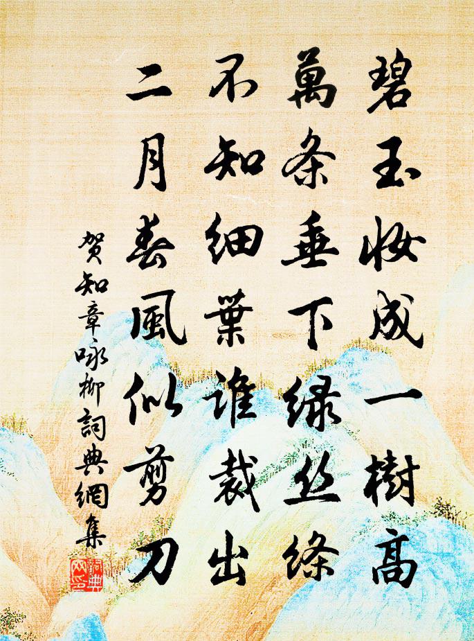 寫楊柳,該從哪兒著筆呢?毫無疑問,它的形象美是在於那曼長披拂的枝條。一年一度,它長出了嫩綠的新葉,絲絲下垂,在春風吹拂中,有著一種迷人的意態。這是誰都能欣賞的。古典詩詞中,借用這種形象美來形容、比擬美人苗條的身段,婀娜的腰支,也是我們所經常看到的。這詩別出新意,翻轉過來。“碧玉妝成一樹高”,一開始,楊柳就化身為美人而出現;“萬條垂下綠絲絛”,這千條萬縷的垂絲,也隨之而變成了她的裙帶。上句的“高”字,襯托出美人婷婷裊裊的風姿;下句的“垂”字,暗示出纖腰在風中款擺。詩中沒有“楊柳”和“腰支”字樣,然而這早春的垂柳以及柳樹化身的美人,卻給寫活了。《南史》說劉悛之為益州刺史,獻蜀柳數株,“條甚長,狀若絲縷。”齊武帝把這些楊柳種植在太昌雲和殿前,玩賞不置,說它“風流可愛”。這裡把柳條說成“綠絲絛”,可能是暗用這個關於楊柳的著名典故。但這是化用,看不出一點痕跡的。