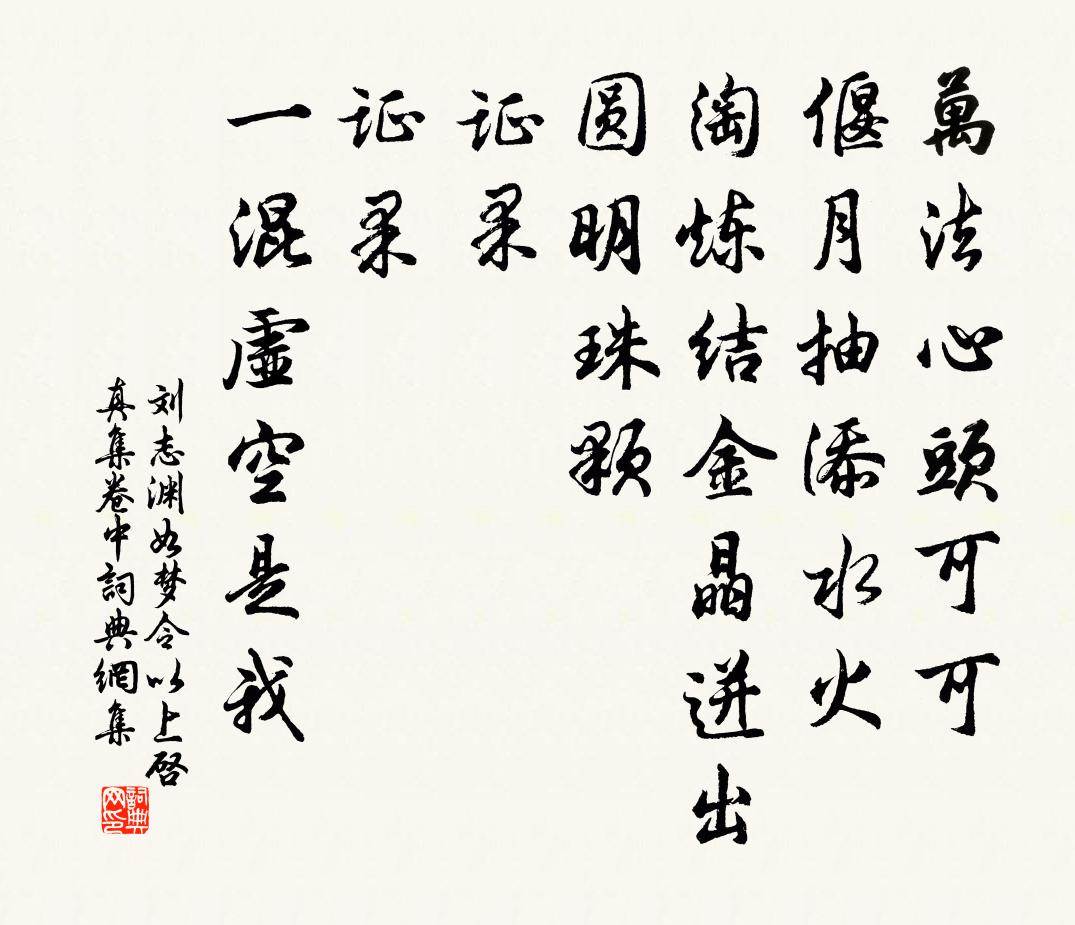 詩詞名句歷史字典書法欣賞書法字典國語詞典說文解字康熙字典古漢語字典標 題 作 者 詩 句 如夢令 以上啟真集卷中作者:劉志淵 朝代:元代如夢令 以上啟真集卷中原文萬法心頭可可。偃月抽添水火。淘煉結金晶,迸出圓明珠顆。證果。證果。一混虛空是我。詩詞問答問:如夢令 以上啟真集卷中的作者是誰?答:劉志淵問:如夢令 以上啟真集卷中寫於哪個朝代?答:元代問:如夢令 以上啟真集卷中是什麼體裁?答:詞劉志淵如夢令 以上啟真集卷中書法欣賞如夢令 以上啟真集卷中書法作品詩詞推薦題張衡廟鄭谷〔唐代〕遠俗只憑淫祀切,多年平子固悠悠。江煙日午無簫鼓,直到如今詠四愁。梅崔道融〔唐代〕溪上寒梅初滿枝,夜來霜月透芳菲。清光寂寞思無盡,應待琴尊與解圍。東園池上書所見五首宋庠〔宋代〕堂下濺濺水欲周,水清煙底見游鯈。主人不是無芳餌,此意從來信直鉤。頌證道歌證道歌釋印肅〔宋代〕四事供養敢辭勞,自有摩尼價最高。任君寶滿三千界,性無利益漫豐豪。挽李中甫使君孫應時〔宋代〕書卷平生事,篝燈靜夜分。韻鈞奏韓柳,黼黻補卿雲。不鄙頻揮塵,曾窺一運斤。詞人嗟不遇,地下早修文。滿江紅 壽張繡江張伯淳〔元代〕省*絲綸,早傳到、和羹訊息。無限事、但從綱領,認教端的。回省平生遊宦處,那曾些個由人力。算知心、惟有次韻宋肇惠澄心紙二首蘇軾〔宋代〕詩老囊空一不留,百番曾作百金收。(永叔以澄心百幅遺聖俞,聖俞有詩。)知君也厭雕肝腎,分我江南數斛愁。小年文天祥〔宋代〕燕朔逢窮臘,江南拜小年。歲時生處樂,身世死為緣。鴉噪千山雪,鴻飛萬里天。出門意寥廓,四顧但茫然。寄李道夫吳可〔宋代〕亂後時通問,飄流尚此身。干戈傷白髮,桃李自青春。故國田疇遠,殊方盜賊頻。知君懷老伴,詩酒慰情親。奉使契丹二十八首其二十八筠州聖祖殿詩蘇轍〔宋代〕如日在天,靡國不臨。筠雖小邦,其有不歆。東廡西向,誰昔營之。民昏不知,神以不懷。梅花十詠大實張至龍〔宋代〕圓碧日益肥,磊落壓枝重。雖然苦味酸,酸中藏大用。送別張長官東歸敖陶孫〔宋代〕勸君少留持一觴,三年一日才初長。春風愔愔著桃李,露雨沃沃開麻桑。道傍簫鼓莫淒咽,使君平生面如鐵。裁量贈方江二君丁謂〔宋代〕偶向嚴堂吊子陵,布衣攜手遠相迎。乍親冠蓋談諧少,久住林泉骨自清。正好辛勤緣齒少,最難遭遇是時平。李頻憶故鄉淳于震先〔宋代〕蔚陽山下祖塋居,巍嶺崇高畫不如。離亂不堪回首顧,春秋誰為掃墳廬。辛酉大雪戲成二詩以千山鳥飛絕萬逕人蹤滅為周麟之〔宋代〕復帳蕤香篝,綺度羅妓圍。焉知蓽門子,清喔袖鶉衣。臘白三日寒,遽使晝掩扉。愁思已如話,共作風絮飛。次韻紫岩潘庭堅二首白玉蟾〔宋代〕何 * 里有陽秋,誰絹能包得許羞。早趁黃舊丞相押,莫空白了少年頭。既無顧戀於人已,便請清閒袖手休。豈必醉落魄/一斛珠王千秋〔宋代〕驚鷗撲蔌。蕭蕭臥聽鳴幽屋。窗明怪得雞啼速。牆角爛斑,一半露松綠。歌樓管竹誰翻曲。丹唇冰面噴餘馥。遺珠代聖集贈別范成大〔宋代〕一曲悲歌水倒流,尊前何計緩千憂?事如夢斷無尋處,人似春歸挽不留。草色粘天鶗鴃恨,雨聲連曉鷓鴣愁。迢迢西江月陳德武〔宋代〕時序去如流矢,人生宛如飛蓬。石灣江上又逢冬。且喜一場初動。但見堪輿杳杳,更連山水重重。淒涼雲物雨濛濛以虎臂杖送李任道二首黃庭堅〔宋代〕未衰筋力先扶杖,能救衰年十二三。八百老彭嗟杖晚,可憐矍鑠馬征南。名句推薦如何亡國恨,盡在大江東!屈大均《秣陵》 人不可貌相,海水不可斗量。馮夢龍《醒世恆言·卷三》 倚篷窗無寐,引杯孤酌。張元乾《滿江紅·自豫章阻風吳城山作》 險韻詩成,扶頭酒醒,別是閒滋味。李清照《念奴嬌·春情》 起望衣冠神州路,白日銷殘戰骨。辛棄疾《賀新郎·用前韻送杜叔高》 街南綠樹春饒絮。雪滿遊春路。晏幾道《御街行·街南綠樹春饒絮》 從此擾擾攘攘,又不知夢醒何時耳。沈復《浮生六記·坎坷記愁》 秋聲萬戶竹,寒色五陵松。李頎《望秦川》 昨夜笙歌容易散,酒醒添得愁無限馮延巳《鵲踏枝·梅落繁枝千萬片》 暗暗淡淡紫,融融冶冶黃。李商隱《菊花》