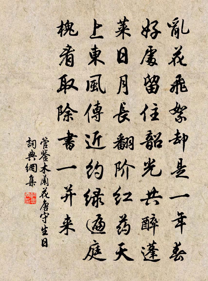 詩詞名句歷史字典書法欣賞書法字典國語詞典說文解字康熙字典古漢語字典標 題 作 者 詩 句 木蘭花(唐守生日)作者:管鑒 朝代:宋代木蘭花(唐守生日)原文亂花飛絮。卻是一年春好處。留住韶光。共醉蓬萊日月長。翻階紅藥。天上東風傳近約。綠遍庭槐。看取除書一併來。詩詞問答問:木蘭花(唐守生日)的作者是誰?答:管鑒問:木蘭花(唐守生日)寫於哪個朝代?答:宋代管鑒木蘭花(唐守生日)書法欣賞木蘭花(唐守生日)書法作品詩詞推薦丈亭陳造〔宋代〕小江隨山巧回互,轉首碧流分兩股。丈亭系纜待潮生,徙倚才容一炊許。潮信曾何差頃刻,固應作意憐行客。為誰樓心月佚名〔宋代〕手把新荷葉一枝。喚來池上只愁歸。流螢裹在紅紗袖,忽到持杯個個飛。牡丹石延年〔宋代〕縹葉湘叢照碧欄,幾春都未見殷鮮。栽培不得華腴地,豈是東君用意偏。尚書都堂瓦松李曄〔唐代〕華省秘仙蹤,高堂露瓦松。葉因春後長,花為雨來濃。影混鴛鴦色,光含翡翠容。天然斯所寄,地勢太無從。接棟隗囂宮晚望許棠〔唐代〕西顧伊蘭近,方驚滯極邊。水隨空谷轉,山向夕陽偏。磧鳥多依地,胡云不滿天。秋風動衰草,只覺犬羊膻。漁陽杜甫〔唐代〕漁陽突騎猶精銳,赫赫雍王都節制。猛將飄然恐後時,本朝不入非高計。祿山北築雄武城,舊防敗走歸其營。系書贈隱者劉鎮〔宋代〕夫子生東野,經年不到城。愛吟無俗趣,貪畫得閒名。荒徑侵山影,虛堂出燕聲。我慚為謫吏,泉石負幽情。【正宮】塞鴻秋_蘇卿寫下金劉庭信〔元代〕蘇卿寫下金山恨,雙生得個風流信。亞仙不是夫人分,元和到受十年困。馮魁到底村,雙漸從來嫩,思量惟有王魁花時對雪張舜民〔宋代〕急霰飄零際,群芳爛熳中。半開先逐水,未落已隨風。兵渡金陵破,塵來繡嶺空。誰能勞樽酒,暫使客顏紅。古意李新〔宋代〕嗟來吐食死,漂母愛王孫。等是乞憐人,一飽何足論。東方老先生,笑傲忘至尊。朔飢侏儒飽,且用長短分。月庭白玉蟾〔宋代〕佳人冰雪姿,奕奕紫芝眉。中懷徑寸珠,曉夜光陸離。似月充其庭,謂是亦良非。乃知可憐宵,誠與姮娥期。四座塞上曲郭昭著〔宋代〕胡馬秋肥塞草黃,彎弧直擬犯漁陽。歸鞭卻避弓閭水,知是嫖姚舊戰場。古意陸游〔宋代〕千金募戰士,萬里築長城。何時青冢月,卻照漢家營?閿鄉寓居十首小徑吳融〔唐代〕礙竹妨花一徑幽,攀援可到玉峰頭。若教須作康莊好,更有高車駟馬憂。周侯古祠劉宰〔宋代〕廟宇巍峨對古墳,將軍英氣宛如存。當進改行除民害,歷代封功沐寵恩。虎穴雲埋山寂寞,蛟溪波冷月黃昏。我來感遇其二李白〔唐代〕可嘆東籬菊。莖疏葉且微。雖言異蘭蕙。亦自有芳菲。未泛盈樽酒。徒沾清露輝。當榮君不採。飄落欲何依。寄謝晏尚書二絕歐陽修〔宋代〕送盡殘春始到家,主人愛客不須嗟。紅泥煮酒嘗青杏,猶向臨流藉落花。古意十四首章雲心〔宋代〕逝川常東流,白日易西沒。悠悠天地間,二物何飄忽。促迫於生人,綠鬢成華發。昧者不自知,終朝常汩汩。利慾淳祐祭海神十六首佚名〔宋代〕[徽一曲]若稽有唐,克致崇極。祝號既升,爰增祭式。從享於郊,神斯受職。我祀事新,式祈險驚。漁家傲辛棄疾〔宋代〕道德文章傳幾世。到君合上三台位。自是君家門戶事。當此際。鬼山正抱西江水。三萬六千排日醉。鬢毛只恁青青名句推薦愛向竹欄騎竹馬,懶於金地聚金沙。金地藏《送童子下山》 人生自古誰無死?留取丹心照汗青。文天祥《過零丁洋》 荒煙涼雨助人悲,淚染衣襟不自知。王安石《送和甫至龍安微雨》 富潤屋,德潤身,心廣體胖曾子《禮記·大學》 微陽下喬木,遠色隱秋山。馬戴《落日悵望》 雨橫風狂三月暮,門掩黃昏,無計留春住。歐陽修《蝶戀花·庭院深深深幾許》 養弟子如養閨女,最要嚴出入,謹交遊。洪應明《菜根譚·概論》 蘭陵美酒鬱金香,玉碗盛來琥珀光。李白《客中行 / 客中作》 上不失天時,下不失地利,中得人和,而百事不廢。荀子《荀子·王霸》 不戚戚於貧賤,不汲汲於富貴。陶淵明《五柳先生傳》