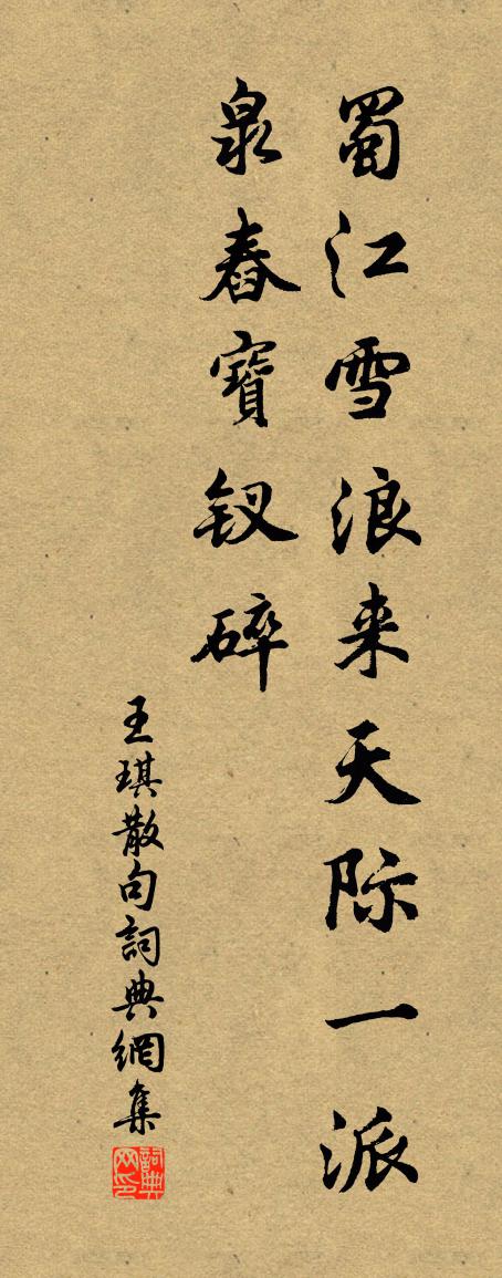 詩詞名句歷史字典書法欣賞書法字典國語詞典說文解字康熙字典古漢語字典標 題 作 者 詩 句 句作者:王琪 朝代:宋代句原文蜀江雪浪來天際,一派泉舂寶釵碎。詩詞問答問:句的作者是誰?答:王琪問:句寫於哪個朝代?答:宋代王琪句書法欣賞句書法作品詩詞推薦人日感懷因寄玉山親舊並以示當塗溧陽諸表弟趙蕃〔宋代〕唐人重人日,往往見於詩。孰謂風流遠,聊須著語追。憑高縱無地,念遠得忘思。欲寄江東弟,斷腸梅滿枝。觀伯時畫馬黃庭堅〔宋代〕儀鸞供帳饕虱行,翰林濕薪爆竹聲,風簾官燭淚縱橫。木穿石盤未渠透,坐窗不遨令人瘦,貧馬百藖逢一豆。眼明新豐路逢故人白居易〔唐代〕塵土長路晚,風煙廢宮秋。相逢立馬語,盡日此橋頭。知君不得意,鬱郁來西遊。惆悵新豐店,何人識馬周?即席和端約韻蔡戡〔宋代〕竹溪追勝槩,得侶最為多。自覺功名懶,空嗟歲月磨。夢驚風落葉,心破雨鳴荷。無此杯中物,其如良夜何。贈吳渠州從姨兄士則元稹〔唐代〕憶昔分襟童子郎,白頭拋擲又他鄉。三千里外巴南恨,二十年前城裡狂。寧氏舅甥俱寂寞,荀家兄弟半淪亡。淚因張氏東園送王恭父得殿字葉適〔宋代〕燕鴻不相須,進趣自求便。余來君其館,乃復當我餞。一春三月雨,亭樹郁霧澱。絮重厄飛楊,花蔫堆紫茜。縱有雨夕排悶陸游〔宋代〕煙雨暗郊墟,頹然臥草廬。蟲喧夢回枕,燈伴讀殘書。短褐頻關念,荒畦久廢鋤。更堪湖水漲,累日食無魚!畫堂春(賞海棠)趙長卿〔宋代〕夜來暖趁海棠時。臉邊勻透胭脂。亂紅嬌影困垂垂。睡損楊妃。多少肉溫香潤,朱唇綠鬢相偎。晚風何苦過台西。相和歌辭。怨詩三首李暇〔唐代〕羅敷初總髻,蕙芳正嬌小。月落始歸船,春眠恆著曉。何處期郎游,小苑花台間。相憶不可見,且復乘月還。別來郡樓曾鞏〔宋代〕滿眼青山更上樓,偶攜閒客此閒遊。飛花不盡隨風起,野水無邊帶雨流。懷舊有情惟社燕,忘機相得更沙鷗。黃金賦得春風扇微和郭遵〔唐代〕微風飄淑氣,散漫及茲晨。習習何處至,熙熙與春親。曖空看早辨,映日度逾頻。高拂非煙雜,低垂眾卉新。霽天嘗茶次寄越僧靈皎林逋〔宋代〕白雲峰下兩槍新,膩綠長鮮穀雨春。靜試恰如湖上雪,對嘗兼憶剡中人。瓶懸金粉師應有,筯點瓊花我自珍。清話立春七首劉克莊〔宋代〕生後至和嘉佑時,老身猶及見淳熙。都忘滿鏡星星發,帶了春幡便出嬉。以人生五馬貴莫受侵為韻送胡獻叔守邵陽方岳〔宋代〕吾道一而已,惟誠一之至。毋或參以三,亦勿貳以二。次韻景文社屋留題徐瑞〔宋代〕四海誰知已,江濤正渺然。山林聊偃息,歲月易流連。行李清霜曉,荒祠落木天。留題不盡意,感激尚君賢。郊廟歌辭。褒德廟樂章。武舞作佚名〔唐代〕昭昭竹殿開,奕奕蘭宮啟。懿範隆丹掖,殊榮辟朱邸。六佾薦徽容,三簋陳芳醴。萬石覃貽厥,分珪崇祖禰。挽林煥章二首劉克莊〔宋代〕昔在端平際,臨朝想老成。但聞轅固召,不見伏生行。霜柏無寒暑,朝華有悴榮。由來天所靳,上壽與高名。酬朱元順參議王之道〔宋代〕舟來自金沙,敢避江路繞。計程逾五月,書勞比三考。湖陰見君處,取別殊草草。因思會面難,相從意彌好。新詩雨師雷神七首佚名〔宋代〕眾萬之吒,動之潤之。昭格孔時,維神之依。冷然後先,肆我肯顧。是耶非耶,紛其來下。題齋壁張耒〔宋代〕松庭日午聽啼鶯,簾外人稀睡老鈴。已嘆近秋添白髮,更因多病讀黃庭。江魚未上烹難致,吳酒空斟醉易醒。好住名句推薦人情若比初相識,到底終無怨恨心。馮夢龍《醒世恆言·卷一》 江上春山遠,山下暮雲長。葛長庚《水調歌頭·江上春山遠》 總為浮雲能蔽日,長安不見使人愁。李白《登金陵鳳凰台》 日長睡起無情思,閒看兒童捉柳花。楊萬里《閒居初夏午睡起》 野幕敞瓊筵,羌戎賀勞旋。盧綸《和張僕射塞下曲·其四》 西門秦氏女,秀色如瓊花。李白《秦女休行》 君人者,愛民而安,好士而榮,兩者無一焉而亡。荀子《荀子·君道》 睡起覺微寒。梅花鬢上殘。李清照《菩薩蠻·風柔日薄春猶早》 兒大詩書女絲麻,公但讀書煮春茶。黃庭堅《送王郎》 聞風聲鶴唳,皆以為王師已至房玄齡《晉書·列傳·第四十九章》