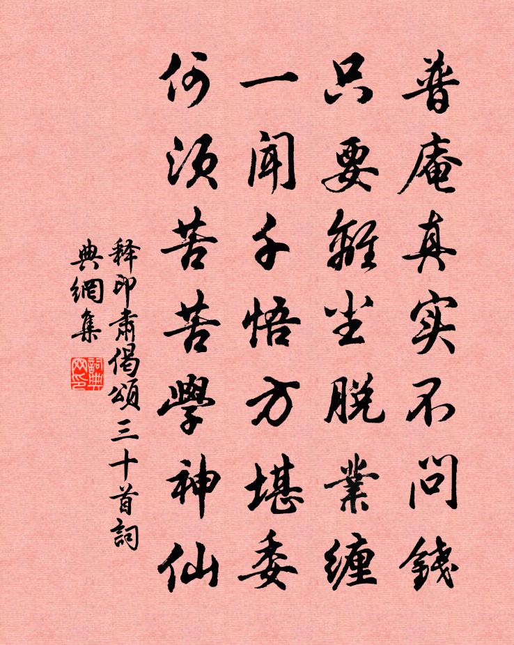 詩詞名句歷史字典書法欣賞書法字典國語詞典說文解字康熙字典古漢語字典標 題 作 者 詩 句 偈頌三十首作者:釋印肅 朝代:宋代偈頌三十首原文普庵真實不問錢,只要離塵脫業纏。一聞千悟方堪委,何須苦苦學神仙。詩詞問答問:偈頌三十首的作者是誰?答:釋印肅問:偈頌三十首寫於哪個朝代?答:宋代釋印肅偈頌三十首書法欣賞偈頌三十首書法作品詩詞推薦句釋義了〔宋代〕百年休間幾時好,萬事不勞明日看。送崔生李新〔宋代〕斥鷃意自適,舉俛歡一枝。安知摶扶搖,乃有萬里期。鳴鳳困高岡,愧此腹背衣。我無瓊蕤漿,可以療酒飢。一稅寄道友趙子甄〔宋代〕秦川蟬蛻已三回,明月清風任去來。寄語沖虛諸道友,芒鞋竹杖不須埋。秋夜寄外劉若蕙〔清代〕一片長安月,清光兩地盈。懸知千里客,不盡故鄉情。窗竹寫秋影,村砧搗夜聲。空閨愁不寐,自語對燈檠。題鍾路分見一軒二首吳芾〔宋代〕名利場中車馬塵,區區有愧百年身。如君未老甘閒退,眼底今方見一人。簡王尉方岳〔宋代〕買書終欲寄幽村,槿樹籬庶水際門。滿聽秋聲移竹母,徑眠明月枕桐孫。諸公未逸市朝累,六籍坐為場屋昏。有客憂闋還台次韻和道卿學士終喪歸集賢舊職見寄宋庠〔宋代〕半生多難竄民廛,北闕重來雪履穿。木在溝中寧有間,人從河上更相憐。塵棲綬笥昏餘采,蟲食書縢脫故篇。不敢馬郎婦贊釋大觀〔宋代〕倩盼動嬋娟,常持六萬言。金沙灘上月,五欲浪中翻。夏州道中黃滔〔唐代〕隴雁南飛河水流,秦城千里忍回頭。征行渾與求名背,九月中旬往夏州。中秋不見月羅隱〔唐代〕風簾淅淅漏燈痕,一半秋光此夕分。天為素娥孀怨苦,並教西北起浮雲。苦熱中寄舒員外白居易〔唐代〕何堪日衰病,復此時炎燠。厭對俗杯盤,倦聽凡絲竹。藤床鋪晚雪,角枕截寒玉。安得清瘦人,新秋夜同宿。非君中秋謝施婺源爰許月卿〔宋代〕高情古意清溪樓,靜拍欄乾盡兩眸。月不露圭天有道,風能□谷水無愁。從於所好萬青壑,捨我其誰雙白鷗。別樣壯別梁啓超〔清代〕丈夫有壯別,不作兒女顏。風塵孤劍在,湖海一身單。天下正多事,年華殊未闌。高樓一揮手,來去我何難。岳陽樓晚眺即事疊韻四首高善濂〔宋代〕無聊憑眺目西斜,替恨成啼集暮鴉。遠樹雲中浮墨障,游魚鏡底去菱花。臨高每憶登樓賦,遣興還嘗覓句茶。到處花心動 黃伯陽歲晚見梅,適遇舊賦以贈別,邵亨貞〔元代〕東閣何郎,記當時,曾賞舊家紅萼。彩筆賦詩,綠髮簪花,多少少年行樂。自從驚覺揚州夢,芳心事、等閒忘卻。酬郭十五受判官杜甫〔唐代〕才微歲老尚虛名,臥病江湖春復生。藥裹關心詩總廢,花枝照眼句還成。只同燕石能星隕,自得隋珠覺夜明。喬口枕上口占陸游〔宋代〕五十年前詩酒身,山陰風月尚如新。閒愁已是無闌障,一枕春寒更惱人。次韻無咎閻子常攜琴八村黃庭堅〔宋代〕士寒餓,古猶今,向來亦有子桑琴。倚楹嘯歌非寓淫,伯牙山高水深深,萬世丘壟一知音。閻君七弦抱幽獨,晁子頌古一百二十一首釋宗杲〔宋代〕壁上安燈盞,堂前置酒台。悶來打三盞,何處得愁來。鷓鴣天辛棄疾〔宋代〕樽俎風流有幾人。當年未遇已心親。金陵種柳歡娛地,庾嶺逢梅寂寞濱。樽似海,筆如神。故人南北一般春。玉人名句推薦回雁峰前路,煙樹正蒼蒼葛長庚《水調歌頭·江上春山遠》 縱浪大化中,不喜亦不懼。陶淵明《形影神三首》 奴為出來難,教君恣意憐。李煜《菩薩蠻·花明月暗籠輕霧》 表獨立兮山之上,雲容容兮而在下;屈原《九歌》 回看射鵰處,千里暮雲平。王維《觀獵》 賈傳自憐多感慨,東門何意泥孤虛。王惲《送姬仲實隱士北還》 三人行,必有我師焉。擇其善者而從之,其不善者而改之。孔子弟子《論語·述而篇》 離別家鄉歲月多,近來人事半消磨。賀知章《回鄉偶書二首》 吾生如寄,尚想三徑菊花叢。楊炎正《水調歌頭·把酒對斜日》 無邊家國事,併入雙蛾翠。秋瑾《菩薩蠻·寄女伴》