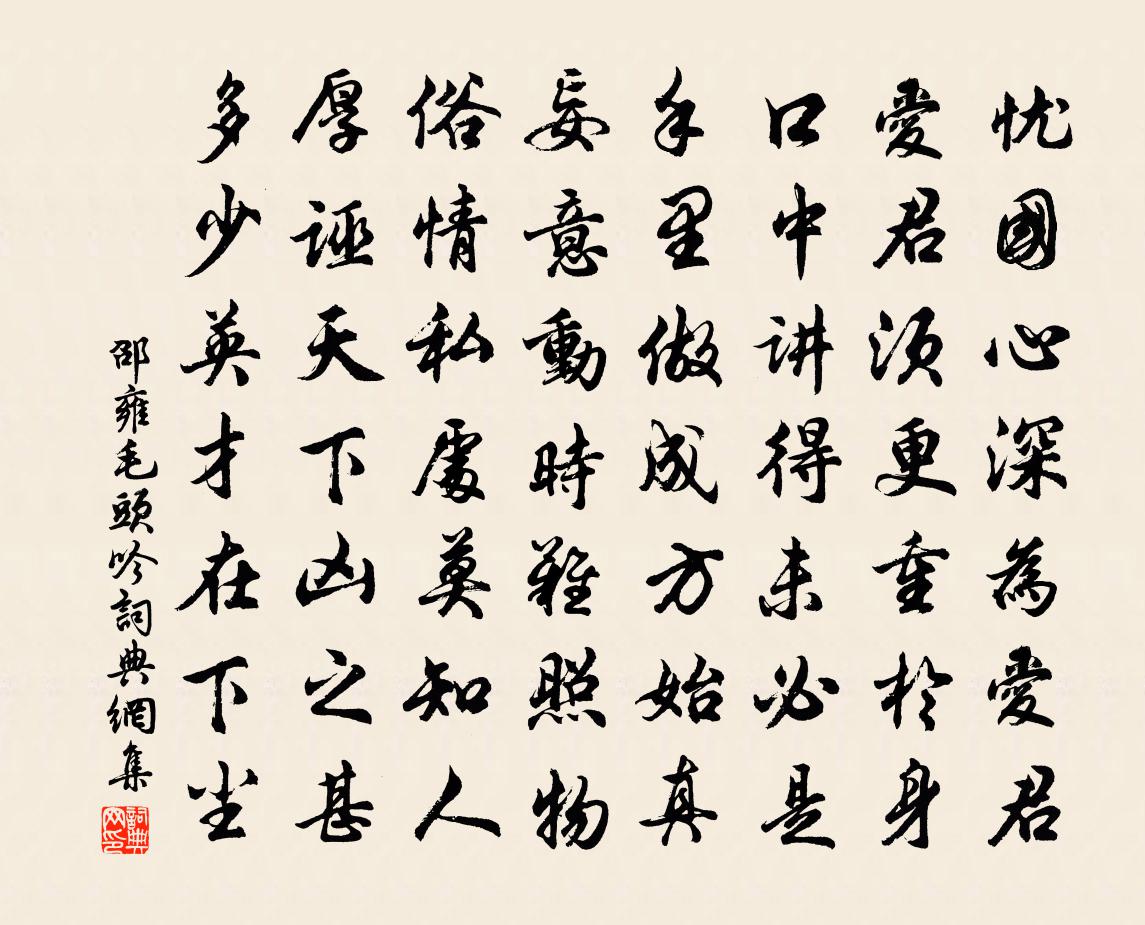 詩詞名句歷史字典書法欣賞書法字典國語詞典說文解字康熙字典古漢語字典標 題 作 者 詩 句 毛頭吟作者:邵雍 朝代:宋代毛頭吟原文憂國心深為愛君,愛君須更重於身。口中講得未必是,手裡做成方始真。妄意動時難照物,俗情私1-1處莫知人。厚誣天下凶之甚,多少英才在下塵。詩詞問答問:毛頭吟的作者是誰?答:邵雍問:毛頭吟寫於哪個朝代?答:宋代邵雍毛頭吟書法欣賞毛頭吟書法作品詩詞推薦月石吳頤〔宋代〕嫦娥促輕車,翩翩下瑤城。窮幽得靈山,意欲家平生。隳石擬素魄,神功夜無聲。佳桂願托根,老兔祈偕行。上帝熙寧祀皇地祗十二首佚名〔宋代〕有來穆穆,臨此方丘。其行風動,春止霆收。躬事匪懈,豐盛潔羞。百昌鹹殖,允矣神林。崔浩徐鈞〔宋代〕智謀斷國灼蓍龜,自比留侯果是非。一死人言緣史事,誰知謀泄為南歸。寓寧庵縱步鄧深〔宋代〕野澗雨初歇,曉陰雲未開。訪君行李處,許我杖藜來。及到田家問,還聞轍跡回。西風黃葉下,悵望立蒼苔。王簿清輝亭楊時〔宋代〕黛染煙螺拂檻低,抱城流水綠逶迤。澄瀾碎影搖青鏡,斜日流峰隱半規。坐上盈樽無俗客,壁間照夜有新詩。登臨奉和過慈恩寺應制許敬宗〔唐代〕鳳闕鄰金地,龍旂拂寶台。雲楣將葉並,風牖送花來。月宮清晚桂,虹梁絢早梅。梵境留宸矚,掞發麗天才。張明叔兄弟雨中見弄水軒投壺財酒薄暮而散斗司馬光〔宋代〕喜君午際來,涼雨正紛泊。呼奴掃南軒,壺席謹量度。軒前紅薇開,蒙下鳴泉落。必爭如五射,有禮異六博。求全西江月·日日深杯酒滿朱敦儒〔宋代〕日日深杯酒滿,朝朝小圃花開。自歌自舞自開懷。且喜無拘無礙。青史幾番春夢,黃泉多少奇才。不須計較與安排水龍吟(東宮壽詞)曹勛〔宋代〕嫩涼微裊,秋容乍肅,迥覺涼如水。重陽已近,岩華增秀,一鉤天際。香動前星,氣橫文圃,榮光呈瑞。仰宸心密偈傾一百三十三首釋法薰〔宋代〕一徑直,二周遮。衲僧會得,萬別千差。庭前閒放目,春盡尚余花,老胡不合過流沙。蕭蔘議雪中宴客朱僉判有詩因次韻王炎〔宋代〕不慣長安曳履游,貪看冰柱滿檐頭。素花一色如梅嶺,碎玉無聲欠竹樓。蠟炬欲殘方夜永,金釵半醉自春浮。無氈致政大夫胡公輓詩五首周麟之〔宋代〕末緒慚非偶,孤蹤托契深。委禽申舊好,奉屨負初心。已矣升堂拜,潸焉雪涕吟。四郊煙樹慘,引紼墮哀音。池畔二首白居易〔唐代〕結構池西廊,疏理池東樹。此意人不知,欲為待月處。持刀間密竹,竹少風來多。此意人不會,欲令池有波。寄懷徐行仲趙蕃〔宋代〕沅水與湘水,合流俱洞庭。如何君於我,乃隔影與形。滄江鷗鷺野,深林蘭蕙馨。含章斯發發,遂性逐冥冥。偶興四首韓元吉〔宋代〕江南菊少開金色,只有霜葩雜御黃。乞得黃花真愛惜,明年賸種壓群芳。先天易吟三十首方回〔宋代〕瀛登唐治日,奎聚宋興年。子午復南北,一聲啼杜鵑。初秋戲作山居雜興俳體十二解楊萬里〔宋代〕湖蜜青房蛹剝瓊,沼犀紫觝腦藏冰。先生病暑無多酌,堆飣金柈作麽生。贈郭功父吳則禮〔宋代〕兒童疇昔看揮毫,未覺雄辭愧廣騷。談塵縱橫走雷電,詩壇磊落建麾旄。捐身魚鳥黃塵遠,隱几江湖白浪高。短褐貧賤詩釋文珦〔宋代〕貧賤交親絕,形影自相吊。清泉白石間,朝夕事吟嘯。甑墮何足言,灰死不須溺。達人乃知此,寧免俗士誚。元日朝回中夜書情,寄南宮二故人盧綸〔唐代〕鳴珮隨鵷鷺,登階見冕旒。無能裨新地,何事別滄洲。閒夜貧還醉,浮名老漸羞。鳳城春欲晚,郎吏憶同游。名句推薦竹色溪下綠,荷花鏡里香。李白《別儲邕之剡中》 擬泛煙中片葉,但兩湖佳處,任風吹泊徐燦《念奴嬌·西湖雨感次素庵韻》 大鵬一日同風起,扶搖直上九萬里。李白《上李邕》 如知其非義,斯速已矣,何待來年。孟子《孟子·滕文公章句下·第八節》 欲窮千里目,更上一層樓。王之渙《登鸛雀樓》 花前失卻遊春侶,獨自尋芳。馮延巳《採桑子·花前失卻遊春侶》 匹馬南來渡浙河,汴城宮闕遠嵯峨。于謙《岳忠武王祠》 君子進則能益上之譽,而損下之憂戴聖《大戴禮記·曾子制言中第五十五》 感時花濺淚,恨別鳥驚心。杜甫《春望》 出其東門,有女如雲。佚名《出其東門》