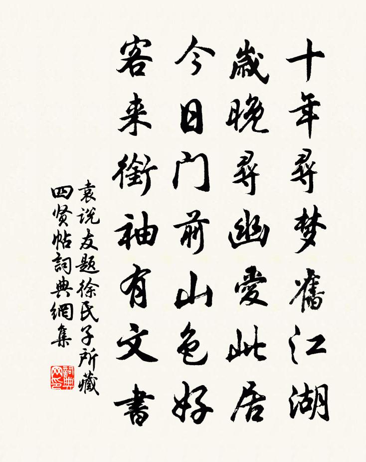 詩詞名句歷史字典書法欣賞書法字典國語詞典說文解字康熙字典古漢語字典標 題 作 者 詩 句 題徐氏子所藏四賢帖作者:袁說友 朝代:宋代題徐氏子所藏四賢帖原文十年尋夢舊江湖,歲晚尋幽愛此居。今日門前山色好,客來銜袖有文書。詩詞問答問:題徐氏子所藏四賢帖的作者是誰?答:袁說友問:題徐氏子所藏四賢帖寫於哪個朝代?答:宋代袁說友題徐氏子所藏四賢帖書法欣賞題徐氏子所藏四賢帖書法作品詩詞推薦某獲造司空府得至便座見文禽五六夷猶曲池上毛滂〔宋代〕許近清池養羽儀,恩波穩暖自忘歸。長依竹石供瀟灑,不學蒼鷹飽便飛。和王守城山陳杰〔宋代〕宦遊落拓成前夢,亂瘼摧藏各幸民。歲晚來門今雨舊,人間傾蓋白頭新。斯文不厭重論細,吾味何關數面新。海內與溫其對榻劉子翬〔宋代〕細雨南窗夜,青燈對榻眠,升沈嗟汪宦,聚散忽流年。失路誰推轂,他時看著鞭。竹林須款集,君亦暫留連。邊城曲戴叔倫〔唐代〕人生莫作遠行客,遠行莫戍黃沙磧。黃沙磧下八月時,霜風裂膚百草衰。塵沙晴天迷道路,河水悠悠向東去。胡笳題畫四首唐寅〔明代〕紅樹中間飛白雲,黃茅眼底界斜曛。此中大有逍遙處,難說與君畫與君。偈三十五首釋祖珍〔宋代〕飄空一葉兩新收,暑退涼生萬壑秋。貼肉汗衫才脫下,橫吹木笛倒騎牛。偈釋普紹〔宋代〕靈雲悟桃花,玄沙傍不肯。多少痴禪和,擔雪去填井。今春花又開,此意誰能領?端的少人知,花落春風靜。煙雨樓葉隆禮〔宋代〕傍家亭館占湖東,寂寞為鄰祗陸公。竹樹一堤如有礙,乾坤萬象自無窮。棹歌遠入秋波綠,塔影中分晚照紅。尊酒夜意陸游〔宋代〕火雲夕方收,草露秋已白。堂空燈欲翳,壁壞蟲自嘖。四顧寂無人,獨立岸吾幘。窮通何足論,等是百年客。何能送楊瓘雁門省親二首黃庭堅〔宋代〕執戟老翁年七十,人看生理亦無聊。草玄事業窺周易,作賦聲名動漢朝。今見遠孫勤翰墨,還持遺藁果簞瓢。三年雨後十小絕以一雨洗殘暑萬家生早涼為韻章甫〔宋代〕夢作吳淞去,膾鱸擣香橙。道逢湖海人,歡宴如平生。和清汀蔣省乾酒色財氣韻李曾伯〔宋代〕爛醉非生涯,小人若甘醴。斧斤戕天和,狂藥害正禮。可惜竹溪逸,吵飲潁之水。名教有餘樂,公未知趣耳。冬日(一作中)書懷寄惟真大師李中〔唐代〕自別吾師後,風騷道甚孤。雪霜侵鬢髮,音信隔江湖。擾擾悲時世,悠悠役夢途。向公期盡節,多病怕傾壺。賤跡如夢令呂渭老〔宋代〕百和寶釵香佩。短短同心霞帶。清鏡照新妝,巧畫一雙眉黛。多態。多態。偷觀榴花窗外。辛未中元記夢夢與一僧談世事良久問答中有凡五邁〔宋代〕石塔本無縫,吐光萬太余。不是風火扇,又非喉管噓。此肖胡為來,塔亦不知渠。解作如是觀,知心長自如,塔身次趙保之清明即事五絕洪咨夔〔宋代〕看花何必只長安,到處韶華總一般。可是家貧風物晚,郎當萵筍斗春盤。歸途用李泉野韻楊冠卿〔宋代〕乾坤萬古幾昏曉,兔走烏飛不暫停。去日荻花秋索索,歸時芳草又青青。東封山下宴群臣張諤〔唐代〕萬里扈封巒,群公遇此歡。幔城連夜靜,霜仗滿空寒。輦路宵煙合,旌門曉月殘。明朝陪聖主,山下禮圓壇。示兒魯饒炎〔宋代〕匡居終日只欽欽,一寸靈台萬古心。鹿洞象山前路在,頻思寡過到而今。國語引諺先秦無名〔先秦〕獸惡其綱。民惡其上。眾心成城。眾口鑠金。從善如登。從惡如崩。黍稷無成。不能為榮。黍不為黍。稷不為稷。名句推薦夜夜相思更漏殘,傷心明月憑闌乾,想君思我錦衾寒。韋莊《浣溪沙·夜夜相思更漏殘》 兩岸人家微雨後,收紅豆,樹底纖纖抬素手。歐陽炯《南鄉子·路入南中》 何日功成名遂了,還鄉,醉笑陪公三萬場。蘇軾《南鄉子·和楊元素時移守密州》 鄂王墳上草離離,秋日荒涼石獸危。趙孟頫《岳鄂王墓》 崖崩路絕猿鳥去,惟有喬木攙天長。蘇軾《李思訓畫長江絕島圖》 黃鶴樓前日欲低,漢陽城樹亂烏啼李夢陽《夏口夜泊別友人》 山川蕭條極邊土,胡騎憑陵雜風雨。高適《燕歌行》 好風朧月清明夜,碧砌紅軒刺史家。白居易《清明夜》 三百年間同曉夢,鐘山何處有龍盤。李商隱《詠史二首·其一》 人生百年有幾,念良辰美景,休放虛過。元好問《驟雨打新荷》