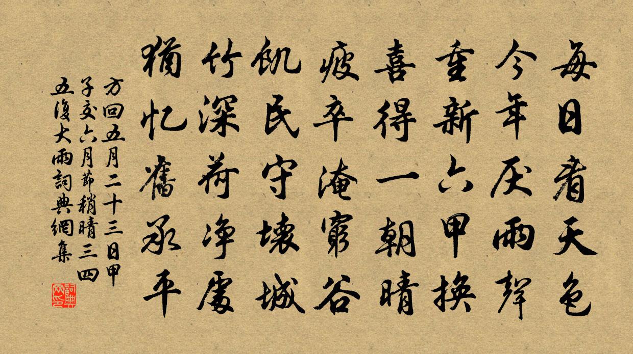 詩詞名句歷史字典書法欣賞書法字典國語詞典說文解字康熙字典古漢語字典標 題 作 者 詩 句 五月二十三日甲子交六月節稍晴三四五復大雨作者:方回 朝代:宋代原文每日看天色,今年厭雨聲。重新六甲換,喜得一朝晴。疲卒淹窮谷,饑民守壞城。竹深荷淨處,猶憶舊承平。詩詞問答問:《五月二十三日甲子交六月節稍晴三四五復大雨》的作者是誰?答:方回問:該詩寫於哪個朝代?答:宋代書法欣賞五月二十三日甲子交六月節稍晴三四五復大雨書法作品詩文賞析【原題】:五月二十三日甲子交六月節稍晴三四五復大雨賊寨未下詩詞推薦宴崔明府宅夜觀妓孟浩然〔唐代〕畫堂觀妙妓,長夜正留賓。燭吐蓮花艷,妝成桃李春。髻鬟低舞席,衫袖掩歌唇。汗濕偏宜粉,羅輕詎著身?調移江外除夜曹松〔唐代〕千門庭燎照樓台,總為年光急急催。半夜臘因風捲去,五更春被角吹來。寧無好鳥思花發,應有游魚待凍開。不是樂庵李先生居南床論張同知不行掛冠而歸賦二馬先覺〔宋代〕高人擺塵鞿,厲俗非小補。朝來漉酒巾,談笑易珪組。百年全始終,一節照今古。回首聲利場,車輪正旁午。偈公六十五首釋鹹傑〔宋代〕月圓月缺,循途守轍。打破牢關,天寬地寬。送遷客二首於鵠〔唐代〕得罪誰人送,來時不到家。白頭無侍子,多病向天涯。莽蒼凌江水,黃昏見塞花。如今賈誼賦,不漫說長沙。流人留題熙春亭張登〔唐代〕熙春亭建為民安,要識熙熙本不難。一日但能先克復,百年雖久亦勝殘。滿城和氣薰天地,終歲長春忘暑寒。斯道觀釣余靖〔宋代〕趨塵寒浦波,桂子秋空月。煙濕釣綸輕,雨濺苔磯滑。健鯉吞香鉤,錦文紅鱍鱍。將為沸鼎游,勢窮猶喣沫。搘頤和提刑趙學士探梅三絕范仲淹〔宋代〕靜映寒林晚未芳,人人慾看壽陽妝。玉顏須傍韶春笑,莫斗嚴風與惡霜。浣溪沙袁易〔元代〕江上芹芽短試春。去年燕子定巢頻。數朝風伯但消塵。莫問孟桓誰駕御,只緣嵇呂自情親。平生我亦不羈人。鍾子崧己丑歲簿秩滿去今自饒州教授還猶選人趙蕃〔宋代〕十四年中三別君,別君每輒嘆離群。案惟占位崔斯立,客乃無氈鄭廣文。給札不能因狗監,校書從昔老揚雲。君顏水調歌頭(壽歐陽景明)廖行之〔宋代〕蒼立籜龍秀,青壓雨梅肥。清和天氣,無限佳景屬斯時。試聽虞弦初理,便有熏兮入奏,風物正熙熙。此日定何日頌古十二首釋法泰〔宋代〕有無不問語先墮,明鏡當台雙照破。迷雲散盡曉天空,杲日團團紅似火。二色梅朱淑真〔宋代〕瑤池會罷朝元客,縞素仙棠問道裝。孫倅書尾附二詩曹勛〔宋代〕南徐作別抵閩鄉,三見春風換眾芳。若對舊遊知識問,為言羈旅鬢成霜。湞陽寓居洪皓〔宋代〕地瘠久荒蕪,驅童且荷鋤。誅茅仍遣瘴,汲水旋栽蔬。瓟醬調應晚,蓴羹興漸疏。秋高宜日涉,不必問丹書。乘黃署楊備〔宋代〕執轡何人籍帝台,漢家天馬不時來,疲駑多亦費芻粟,莫惜千金市駿材。潘歙州寄紙三百番石硯一枚梅堯臣〔宋代〕永叔新詩笑原父,不將澄心紙寄予。澄心紙出新安郡,臘月敲冰滑有餘。潘侯不獨能致紙,羅紋細硯鐫龍尾。墨花將至蘭陵道中以遠岫重疊出寒花散漫開為韻李處權〔宋代〕客程言浩渺,念此道里賒。秋林傷客情,霜葉色勝花。溪魚不論錢,我飢豈無涯。何當見昇平,四海如一家。十三日逆風舟行甚遲趙蕃〔宋代〕昨夜縱風幾喪生,今朝溯水頗留行。細看洶湧收帆腳,孰若夷猶聽槳聲。客路了知難數傲,長年謂我勿多驚。世間湖山十景三潭印月王洧〔宋代〕塔邊分占宿湖船,寶鑑開匳水接天。橫玉叫云何處起,波心驚覺老龍眠。名句推薦適與野情愜,千山高復低梅堯臣《魯山山行》 山不在高,有仙則名水不在深,有龍則靈劉禹錫《陋室銘》 黃塵清水三山下,更變千年如走馬。李賀《夢天》 楚王好細腰,宮中多餓死。佚名《無題》 月色穿簾風入竹,倚屏雙黛愁時。顧敻《臨江仙·月色穿簾風入竹》 秋霜不惜人,倏忽侵蒲柳。李白《長歌行》 藥醫不死病,死病無藥醫。張南莊《何典·第三回》 新來雁闊雲音,鸞分鑒影,無計重見。盧祖皋《宴清都·初春》 醉里秋波,夢中朝雨,都是醒時煩惱。時彥《青門飲·寄寵人》 多私者不義,揚言者寡信。戴聖《大戴禮記·文王官人第七十二》