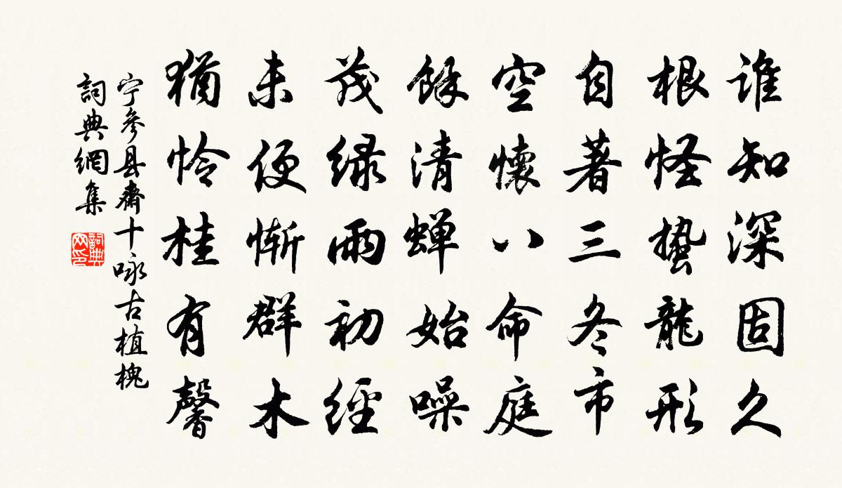 詩詞名句歷史字典書法欣賞書法字典國語詞典說文解字康熙字典古漢語字典標 題 作 者 詩 句 縣齋十詠古植槐作者:寧參 朝代:宋代縣齋十詠古植槐原文誰知深固久,根怪蟄龍形。自著三冬市,空懷八命庭。餘清蟬始噪,茂綠雨初經。未便慚群木,猶憐桂有馨。詩詞問答問:縣齋十詠古植槐的作者是誰?答:寧參問:縣齋十詠古植槐寫於哪個朝代?答:宋代寧參縣齋十詠古植槐書法欣賞縣齋十詠古植槐書法作品詩詞推薦天仙子 壽杜左丞程文海〔元代〕一自壽仙臨杜曲。歲歲小春春意熟。泰階相向更分明,調玉燭。扶鈞軸。突兀眼前惟此屋。折得歲寒枝上玉。擬祝李德夫司理即永康官居辟小軒賦詩二首求京花程公許〔宋代〕西洛風流壓眾久,十分國艷與天香。護持翠幕千窠錦,羞澁於銅兩鬢霜。不怕眼花疑保福,且將色相問空王。書窗和鄭邦達主簿五絕黃公度〔宋代〕風姿眇眇志堂堂,詩句驚人易數長。高士行看三府辟,可容枳棘困仇香。望江南 傍村之民兄弟四人,坐豪奪民產遠流梁寅〔元代〕山深處,豺虎縱跳踉。但愛體肥貪肉食,那知腹飽是身殃。天網甚恢張。千里外,魑魅可同鄉。三尺正當嚴律令,採桑子馮延巳〔唐代〕小庭雨過春將盡,片片段預告飛。獨折殘枝,無語憑闌只自知。玉堂香暖珠簾卷,雙燕來歸。君約佳期,肯信韶華得幾促拍滿路花(瑞香)呂勝己〔宋代〕名花無影跡,寒氣日淒涼。人間千萬樹,歇芬芳。紫微宮女,仙馭降霓裳。名在仙班簿,不屬塵凡,洞天密鎖雲窗感昔二首劉克莊〔宋代〕先皇立國用文儒,奇士多為禮法拘。澶水歸來邊奏少,熙河捷外戰功無。生前上亦知強至,死後人方誄尹洙。螻蟻木魚釋師觀〔宋代〕敲空作響人皆聽,聽聽之時非是聲。海藏龍宮留不住,卻來個裡現全身。小雨陸游〔宋代〕小雨明復闇,余寒去又來。新苔緣砌上,殘杏過籬開。垂老身余幾,逢春心尚孩。江天近寒食,林外過輕雷。和謝公定征南謠黃庭堅〔宋代〕傳聞交州初陵梁,東連五溪西氐羌。軍行不斷蠻標盾,謀主皆收漢畔亡。合浦譙門腥血沸,看興城下白骨荒。謀臣遊宦十年於外歸自浙東睹西山先塋周圍林木氣虞儔〔宋代〕萬畝墳山遍野陰,幾年樵採到如今。藩籬有限重加護,斤斧無端免見侵。缺處更須頻檢校,暇時何惜一登臨。先君贊歷代天師第二十代諱諶字堅德白玉蟾〔宋代〕吸乾酒每一須臾,冠冕玄壇百歲余。不食人間煙火氣,能傳天上電花書。少年游(壽雲谷謝右司)陳允平〔宋代〕光風懷抱玉精神。不染世間塵。香暖衣篝,歌題彩扇,清似晉時人。柳邊小駐朝天馬,一笑領佳賓。簾卷湖山,花贈琢硯熊禾〔宋代〕我聞銅雀瓦,只覆嬌屋姝。又聞端溪石,只近貪泉夫。胡為得貴重,置我几案隅。尚恐習氣膩,解使簡冊污。我有出峽題舟中鄭剛中〔宋代〕才疏任衙覺艱難,今日東歸意已閒。勿謂一舟輕似葉,君恩端的重如山。鹹淳三年生日口號賈似道〔宋代〕君恩猶使居湖曲,年未為高奈病何。做卻潞公官職了,較來謝事不爭多。講詩徹章置酒崇政殿講官兩府宗室近臣皆預會宋庠〔宋代〕經藝尊詩學,書林眷講臣。禮將恩並渥,道與日俱新。聖問臨篇裕,王風即席淳。妙談開寶帙,高宴寵華紳。朝笏和陶讀《山海經》蘇軾〔宋代〕今日天始霜,眾木斂以疏。幽人掩關臥,明景翻空廬。開心無良友,寓眼得奇書。建德有遺民,道遠我無車。無糧送孫百篇游天台方乾〔唐代〕東南雲路落斜行,入樹穿村見赤城。遠近常時皆藥氣,高低無處不泉聲。映岩日向床頭沒,濕燭雲從柱底生。更有送謝天奇止淮上之招李流謙〔宋代〕今日論形勝,全淮正上流。老成資畢召,俊異集枚鄒。共說從軍樂,休歌出塞愁。鄉邦饒杞梓,君已拔其尤。名句推薦傷心重見,依約眉山,黛痕低壓姜夔《慶宮春·雙槳蓴波》 酒盈杯,書滿架,名利不將心掛。李珣《漁歌子·荻花秋》 斗萬花樣巧,深染蜂黃。吳文英《惜黃花慢·菊》 地白風色寒,雪花大如手。李白《嘲王歷陽不肯飲酒》 敕勒川,陰山下。天似穹廬,籠蓋四野佚名《敕勒歌》 竹樹帶飛嵐,荇藻俱明麗。劉道著《湘江秋曉》 人生如寄,何事辛苦怨斜暉。朱熹《水調歌頭·隱括杜牧之齊山詩》 用貧求富,農不如工,工不如商。司馬遷《史記·貨殖列傳》 禍不好,不能為禍。左丘明《國語·周語·太子晉諫靈王壅谷水》 垂下簾櫳。雙燕歸來細雨中。歐陽修《採桑子·群芳過後西湖好》