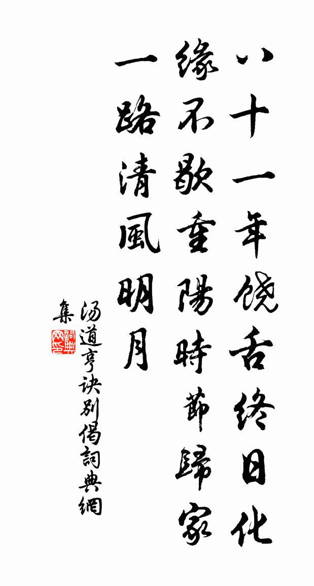 詩詞名句歷史字典書法欣賞書法字典國語詞典說文解字康熙字典古漢語字典標 題 作 者 詩 句 訣別偈作者:湯道亨 朝代:宋代訣別偈原文八十一年饒舌,終日化緣不歇。重陽時節歸家,一路清風明月。詩詞問答問:訣別偈的作者是誰?答:湯道亨問:訣別偈寫於哪個朝代?答:宋代湯道亨訣別偈書法欣賞訣別偈書法作品詩詞推薦題友人郊居水軒王安石〔宋代〕田中三畝宅,水上一軒開。為有漁樵樂,非無仕進媒。槎頭收晚釣,荷葉卷新醅。坐說魚腴美,功名挽不來。漁村即事薛嵎〔宋代〕維舟古渡頭,四望是汀洲。水闊唯宜夏,荷枯不礙秋。困歸牛背穩,曉汲井雲浮。獨坐愁無侶,多番為月留。促拍醜奴兒(辛巳除夕)劉辰翁〔宋代〕送歲可無詩。得團欒、忍不開眉。不記去年今夕夢,江東懷抱,江西信息,舍北妻兒。五十扊扅炊。待五十、富貴題奉化西峰圓覺禪院釋正覺〔宋代〕水流百折山蒼蒼,古寺秋容橫野航。明月初濡寒露白,籬花似趁重陽黃。道人心已老松石,學子膽須磨雪霜。默默夏日十二首張耒〔宋代〕山雨晴來暑,溪雲暗復興。林塘陰不解,巾幘潤還蒸。書帙慵披蠹,盤餐厭撲蠅。老來疲薾甚,多病日侵陵。猗覺寮晚飯朱翌〔宋代〕卒律葛答美,鉤輈格磔肥。翁川茶不媚,何氏酒今非。硯水添池淺,棋盤下子稀。姮娥憐我獨,未暮款窗扉。浪淘沙周密〔宋代〕柳色淡如秋。蝶懶鶯羞。十分春事九分休。開盡楝花寒尚在,怕上簾鉤。京洛少年游。誰念淹留。東風吹雨過西樓送交代倅車晏十一魯望張伯玉〔宋代〕魯望江南客,風騷獵將壇。高吟得意處,清韻逼人寒。場屋聲華舊,襟靈渤澥寬。閨門盡羔雁,庭野列芝蘭。黽勉和朱少章見寄晁說之〔宋代〕兼該夫子恥專門,卻笑何人哮吼村。悶己賦疑唯獨語,惱卿詩似得同論。夜來雨足寬貧病,秋到涼生破睡昏。幾欲長安夜訪澈上人李郢〔唐代〕關西木落夜霜凝,烏帽閒尋紫閣僧。松迥月光先照鶴,寺寒溝水忽生冰。琤琤曉漏喧秦禁,漠漠秋煙起漢陵。聞說送楊山人歸天台李白〔唐代〕客有思天台,東行路超忽。濤落浙江秋,沙明浦陽月。今遊方厭楚,昨夢先歸越。且盡秉燭歡,無辭凌晨發。我家河亭晴望 九月八日。白居易〔唐代〕風轉雲頭斂,煙銷水面開。晴虹橋影出,秋雁櫓聲來。郡靜官初罷,鄉遙信未回。明朝是重九,誰勸菊花杯?侍宴桃花園詠桃花應制趙彥昭〔唐代〕紅萼競燃春苑曙,莑茸新吐御筵開。長年願奉西王宴,近侍慚無東朔才。湖州李使君聞予游廬山寄書云為我一謝清絕陳舜俞〔宋代〕道微本一致,喧靜偶殊轍。眷言朝廷士,何必山水悅。李侯稟靈氣,家園鄰大別。廬峰五千仞,曾上捫日月。一隨碧雲程道士自清江相過示以玉淵劉清叔詩借韻程公許〔宋代〕掣鈴面者誰金門面客,神秀面迫人似曾識,八返未問龍虎交,一杯且薦琳腴碧。我昔卜隱大面山,旌驅人難得字間出遊陸游〔宋代〕僧院軒窗酒市樓,過門自入不須留。恰來竹下尋棋局,又向沙邊上釣舟。詩放不能諧律呂,書狂猶足走蛟蚪。秦碑寧宗朝享三十五首真宗〔宋代〕天地熙泰,躋時昇平。闡符建壇,聲這文明。君臣賡載,夷夏肅清。本支百世,持盈守城。香閨十詠鮫綃帨張玉孃〔宋代〕半幅生綃雪色寒,鮫人相贈比琅玕。華清浴罷恩波媚,南浦傷時詠雨斑。訓世孝弟詩十首邵雍〔宋代〕子孝親兮弟敬哥,天時地利與人和。莫言世事常如此,堪嘆人生有幾何。滿眼繁華何足貴,一家安樂值錢多。奇哉記夢(並敘)蘇軾〔宋代〕樂全先生夢人以詩三篇示之,字皆旁行而不可識。傍有人道衣古貌,為讀其中一篇云:人事且常在,留質悟圓間。名句推薦天山雪雲常不開,千峰萬嶺雪崔嵬。岑參《天山雪歌送蕭治歸京》 小來思報國,不是愛封侯。岑參《送人赴安西》 江南臘盡,早梅花開後,分付新春與垂柳。蘇軾《洞仙歌·詠柳》 黎明即起,灑掃庭除,要內外整潔;既昏便息,關鎖門戶,必親自檢點。朱柏廬《朱子家訓·全文》 卻嫌脂粉污顏色,淡掃蛾眉朝至尊。張祜《集靈台·其二》 夫淺知之所爭者,末矣。列子及其弟子《列子·說符》 何當擊凡鳥,毛血灑平蕪。杜甫《畫鷹》 霖雨泥我塗,流潦浩縱橫。曹植《贈白馬王彪·並序》 童子解吟長恨曲,胡兒能唱琵琶篇。李忱《吊白居易》 細雨春蕪上林苑,頹垣夜月洛陽宮。陸游《書憤五首·其二》