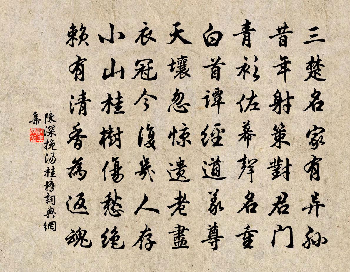 詩詞名句歷史字典書法欣賞書法字典國語詞典說文解字康熙字典古漢語字典標 題 作 者 詩 句 挽湯桂橋作者:陳深 朝代:宋代挽湯桂橋原文三楚名家有異孫,昔年射策對君門。青衫佐幕聲名重,白首譚經道義尊。天壤忽驚遺老盡,衣冠今復幾人存。小山桂樹傷愁絕,賴有清香為返魂。詩詞問答問:挽湯桂橋的作者是誰?答:陳深問:挽湯桂橋寫於哪個朝代?答:宋代陳深挽湯桂橋書法欣賞挽湯桂橋書法作品詩詞推薦山居胡仲弓〔宋代〕山扉風自掩,地僻少將迎。奇字挑燈看,新吟擊缽成。鳳花開自落,螢草腐還生。靜聽鄰琴響,疑調慢角聲。別俞君任通判三首陳造〔宋代〕房陵書望毗陵,書計舍六十書余。今我書從遠役,羨君方逸居。逸勞不足道,會合嗟愈疎。向來江南北,二年能幾早行賈島〔唐代〕早起赴前程,鄰雞尚未鳴。主人燈下別,羸馬暗中行。蹋石新霜滑,穿林宿鳥驚。遠山鍾動後,曙色漸分明。朝中措周必大〔宋代〕九重深念朔庭空。良弼夢時中。擢第難遵常制,築岩直繼高風。明年東府,金釵珠履,列鼎鳴鐘。良醞儻分焦革,漁家傲歐陽修〔宋代〕正月新陽生翠琯。花苞柳線春猶淺。簾幕千重方半卷。池冰泮。東風吹水琉璃軟。漸好憑闌醒醉眼。隴梅暗落芳英邸食責庖者華岳〔宋代〕陋邸已無味,庖人更不材。盦炊全做粥,燒鯗半成灰。添醋酸綿齒,研椒辣木腮。何時聳堂臠,香霧靄樽罍。送歐伯起范仲淹〔宋代〕天與神交忽解攜,一溪風月更同誰。自慚蕭灑如猿鶴,卻向周郎怨別離。再病書懷呈仲良楊萬里〔宋代〕功名銷盡向來心,詩酒從今也不禁。夜雨遣人歸思動,不知湘水幾篙深。和鄉侯燈夕六首劉克莊〔宋代〕榾柮通紅未辟寒,病身無異著囚山。俊游與眾聊同樂,歡事於儂了不關。一霎蓮華開陸地,十分桂影洗瀛寰。朝家取涼二絕洪咨夔〔宋代〕六月冷官還解熱,解衣盤礴坐蒼苔。微風只在松梢頂,著意招呼不下來。正月二十五日過真溪見桃花程公許〔宋代〕桃花簇簇有人家,寂歷炊煙晚照斜。滿眼芳春無處著,一機新錦濯煙霞。依韻和唐彥猷華亭十詠顧亭林梅堯臣〔宋代〕鄉林空林木,不見古人居。猶尋古人跡,更與古人疏。昔為賢豪里,今作魑魅墟。湖邊夜秋月,光彩波上余。哭舍弟二首李中〔唐代〕鴻雁離群後,成行憶日存。誰知歸故里,只得奠吟魂。蟲蠹書盈篋,人稀草擁門。從茲長慟後,獨自奉晨昏。浮生和劉後村梅花百詠方蒙仲〔宋代〕此花清絕畏人知,間許吟人咽入脾。咽去居然佳句少,誰雲臭腐可神奇。和同年春日韻五首袁說友〔宋代〕一川晴草競春光,綠抹紅勻日日忙。榼酒莫辭花下醉,相將堤上柳花黃。牽牛花舒岳祥〔宋代〕卉中深碧斯為最,繡蝶紅蜻宿近枝。巧補疏籬陰漠漠,善緣高竹實纍纍。滿承秋露瑤杯瑩,半斂朝陽翠袖欹。入藥送靈應上人賈島〔唐代〕遍參尊宿遊方久,名岳奇峰問此公。五月半間看瀑布,青城山裏白雲中。即事言懷翁卷〔宋代〕賦得拙疎性,合令縱蹤賒。相親惟野客,所論是詩家。聽雨眠僧屋,看雲立釣槎。秋來有新句,多半為黃花。蘇武慢(湖州趙守席上作)侯置〔宋代〕暗雨收梅,晴波搖柳,萬頃水精宮冷。橋森畫棟,岸列紅樓,兩岸翠簾交映。天上行舟,鑒中開戶,人在蕊珠仙境送誠齋二首袁說友〔宋代〕誰作朝陽一鳳鳴,公朝今復嘆斯人。抗章寧奪三軍帥,去國尤輕一葉身。政以青蒲姑夕駐,更聞白簡為前陳。只今名句推薦松雪飄寒,嶺雲吹凍,紅破數椒春淺。周密《獻仙音·吊雪香亭梅》 不畏浮雲遮望眼,只緣身在最高層王安石《登飛來峰》 想見廣寒宮殿,正雲梳風掠。辛棄疾《好事近·中秋席上和王路鈐》 卻是有,年年塞雁,歸來曾見開時。晁沖之《漢宮春·梅》 師嚴然後道尊,道尊然後民知敬學。戴聖《禮記·學記》 君不密則失臣,臣不密則失身,幾事不密則害成。是以君子慎密而不出也。佚名《易傳·繫辭傳上·第八章》 好人之所惡,惡人之所好,是謂拂人之性,災必逮夫身。曾子《大學·第十一章》 靖安宅里當窗柳,望驛台前撲地花。白居易《望驛台》 紅樓隔雨相望冷,珠箔飄燈獨自歸。李商隱《春雨》 泠泠七弦上,靜聽松風寒。劉長卿《聽彈琴》
