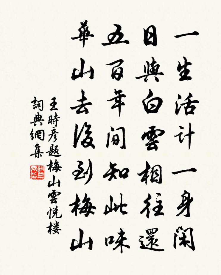 詩詞名句歷史字典書法欣賞書法字典國語詞典說文解字康熙字典古漢語字典標 題 作 者 詩 句 題梅山雲悅樓作者:王時彥 朝代:宋代題梅山雲悅樓原文一生活計一身閒,日與白雲相往還。五百年間知此味,華山去後到梅山。詩詞問答問:題梅山雲悅樓的作者是誰?答:王時彥問:題梅山雲悅樓寫於哪個朝代?答:宋代王時彥題梅山雲悅樓書法欣賞題梅山雲悅樓書法作品詩詞推薦八詠樓方岳〔宋代〕郡古低臨水,城荒早閉門。岸沙分路細,江南帶雲昏。山豈緣詩瘦,樓應厭市喧。前朝碑尚在,半已蝕苔痕。夏花明韋應物〔唐代〕夏條綠已密,朱萼綴明鮮。炎炎日正午,灼灼火俱燃。翻風適自亂,照水復成妍。歸視窗間字,熒煌滿眼前。謝邢少連送葡萄豆蔻栽張栻〔宋代〕留取園中數畝賒,擬栽靈藥謝紛華。兒童今日知翁喜,移得君家豆蔻花。次韻劉養源見寄高斯得〔宋代〕咨余暮齒依蒲柳,見君無門慚九九。小臣久去孔鸞庭,太史曾供牛馬走。忽聞妖彗出不虞,天子驚惶下手書。孤忠如夢令(春晚)劉南翁〔宋代〕沒計斷春歸路。借問春歸何處。鶯燕也含愁,總對落花無語。春去。春去。門掩一庭疏雨。頌古八首釋師一〔宋代〕三喚須知意不輕,平生肝膽一時傾。負吾負汝還知否,縱有丹青畫不成。靈岩呂源〔宋代〕憶別老君洞,今逾二十年。重來持漢節,又復冒蠻煙。風物總仍舊,霜髯徒自憐。不如歸去好,趣辦五湖船。減字木蘭花李綱〔宋代〕龜台金母。紺發芳容超敻古。絳節霓旌。青鳥傳言若可憑。瑤池龍宴。零落碧桃香片片。八駿西巡。更有何人繼後送從侄端之東都李嘉祐〔唐代〕虜近人行少,憐君獨出城。故關逢落葉,寒日逐徂征。聞笛添歸思,看山愜野情。皇華今絕少,龍名頁也相迎。庸齋薛微之里居時與仆為莫逆交亂後寓洛西時王洋〔宋代〕玉潤冰清久著名,長安一見眼增明。笑談已了關中事,慷慨還成灞上行。桑落酒邊還適意,渭城歌里莫傷情。寄身贈夢英大師郭從義〔宋代〕雲水僧來說我師,換鵝書札轉高奇。揮毫傳下千年字,貞石曾留幾處碑。混俗市廛人莫測,和光蹤跡鶴應知。蓮花寄荊幕孫郎中齊己〔唐代〕珠履風流憶富春,三千鵷鷺讓精神。詩工鑿破清求妙,道論研通白見真。四座共推操檄健,一家誰信買書貧。別來詠地藏殿牡丹一莖五花鍾離景伯〔宋代〕春風榮萬木,此卉異常葩。海角逢三月,僧房見五花。馨香驚俗眼,燦爛照高牙。公子休追賞,如來會上夸。送孫子祥赴新昌主簿樓鑰〔宋代〕高士不為簿,子嚴論獨殊。不遭何不可,而況主簿乎。夫君豈其裔,南明筮仕初。要知官無卑,祿可代耕鋤。正須題白沙驛張至龍〔宋代〕霧裹峰頭薄似巾,路逢水後誤行人。山泉釀酒力偏重,石銚煎茶味最真。燕不傳家猶教子,梅才有肉便生仁。枕邊謾題吳龍翰〔宋代〕放曠疏林下,清風吹鬢毛。傍梅讀周易,對酒歌離騷。詩思秋雲淡,古懷明月高。五湖天地別,煙水綠平蒿。江城子 為祖母夫人八十之壽魏初〔元代〕如兒花額粉香勻。點妝新。看來真。八十風流,都屬太平人。長日篆煙琴一曲,瓶水暖,麝梅薰。酒烘仙頰暈微醺五城道中李益〔唐代〕金鐃隨玉節,落日河邊路。沙鳴後騎來,雁起前軍度。五城鳴斥堠,三秦新召募。天寒白登道,塞濁陰山霧。仍聞寄題寶應無斁鳧舄堂二首二晁補之〔宋代〕弟才方浚發,兄老更疏迂。君自軒軒鶴,吾今泛泛鳧。何方折腰具,能作列仙儒。鈞是亡羊事,清樽稍可娛。紅窗月·燕歸花謝納蘭性德〔清代〕燕歸花謝,早因循、又過清明。是一般風景,兩樣心情。猶記碧桃影里、誓三生。烏絲闌紙嬌紅篆,歷歷春星。道名句推薦謫仙何處,無人伴我白螺杯。黃庭堅《水調歌頭·遊覽》 漢甲連胡兵,沙塵暗雲海。李白《經亂離後天恩流夜郎憶舊遊書懷贈江夏韋太守良宰》 佇聽寒聲,雲深無雁影。周邦彥《關河令·秋陰時晴漸向暝》 君家玉女從小見,聞道如今畫不成。黃庭堅《謝張仲謀端午送巧作》 風回雲斷雨初晴,返照湖邊暖復明。白居易《南湖早春》 丈夫非無淚,不灑離別間。陸龜蒙《別離》 強中自有強中手,用詐還逢識詐人。羅貫中《三國演義·第十七回》 宿醉離愁慢髻鬟,六銖衣薄惹輕寒,慵紅悶翠掩青鸞韓偓《浣溪沙·宿醉離愁慢髻鬟》 琴瑟在御,莫不靜好。佚名《女曰雞鳴》 守身不敢妄為,恐貽羞於父母王永彬《圍爐夜話·第三四則》