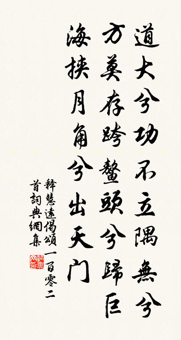 詩詞名句歷史字典書法欣賞書法字典國語詞典說文解字康熙字典古漢語字典標 題 作 者 詩 句 偈頌一百零二首作者:釋慧遠 朝代:宋代偈頌一百零二首原文道大兮功不立,隅無兮方莫存。跨鰲頭兮歸巨海,挾月角兮出天門。詩詞問答問:偈頌一百零二首的作者是誰?答:釋慧遠問:偈頌一百零二首寫於哪個朝代?答:宋代釋慧遠偈頌一百零二首書法欣賞偈頌一百零二首書法作品詩詞推薦仙子洞中有懷劉阮曹唐〔唐代〕不將清瑟理霓裳,塵夢那知鶴夢長。洞裡有天春寂寂,人間無路月茫茫。玉沙瑤草連溪碧,流水桃花滿澗香。曉露別月華嚴陳師道〔宋代〕寓世生同里,隨方去有情。來為百年別,不惜片時程。齋鉢須勤供,經鍾莫倦鳴。當來第三會,此界郤逢迎。京城寓懷張祜〔唐代〕三十年持一釣竿,偶隨書薦入長安。由來不是求名者,唯待春風看牡丹。送營田判官鄭侍御赴上都劉長卿〔唐代〕上國三千里,西還及歲芳。故山經亂在,春日送歸長。曉奏趨雙闕,秋成報萬箱。幸論開濟力,已實海陵倉。雲間月梅堯臣〔宋代〕明明雲間月,皎皎莫可指。雄烏與牡兔,萬歲不生子。三旬後乃合,徒用成甲癸。焉見下土物,長養各私己。蛇蠍四月十六夜月蝕仇遠〔宋代〕盛服拜清夜,中庭朝太陰。凡來仰天者,俱有愛君心。目斷山河影,耳聞鐘磬音。還光俄頃易,涕泗漫沾襟。詩蔡琰〔魏晉〕長笛聲奏苦。建國劉夫人輓歌詞葛立方〔宋代〕孌彼閨房秀,魚軒侈大家。鳩巢奠苹藻,翟茀絢笄珈。覺海聊依筏,言筌謝算沙。平生功用在,無疾問毗耶。四德題僧影堂張祜〔唐代〕寒葉墜清霜,空簾著燼香。生前既無事,何事更悲傷。壽成惠聖慈佑太皇太后閣春帖子衛涇〔宋代〕一德坤元厚,三朝母道尊。含飴供樂事,戲彩見重孫。贈儒僧空谷二首江立信〔宋代〕三十年前的秀才,而今面目現如來。元知三教本無異,走入千山喚不回。僧衲西風囊有錦,禪心明月鏡無台。我聞詠玉朱灣〔唐代〕歌玉屢招疑,終朝省復思。既哀黃鳥興,還復白圭詩。請益先求友,將行必擇師。誰知不鳴者,獨下董生帷。同諸友城南張園賞梅十首邵雍〔宋代〕東風一夜折梅枝,舞蝶游峰都不知。插了滿頭仍漬酒,任他人道拙於時。採桑子王吉昌〔元代〕慧光剔透茅心鄙,絕慮忘情。形靜神清。捧出圓空一點明。驅雲掃霧神機勝,出入縱橫。實相難明。揮斥光華耀八王主簿以湘潭檢旱詩卷為示用其廣惠寺蠲放韻趙蕃〔宋代〕隴畝循行不憚難,是知漢詔本從寬。講求利病非無補,老矣病能策治安。曉聞長樂鐘聲戴叔倫〔唐代〕漢苑鐘聲早,秦郊曙色分。霜凌萬戶徹,風散一城聞。已啟蓬萊殿,初朝鴛鷺群。虛心方應物,大扣欲乾雲。近雜詠谷王安石〔宋代〕可憐台上谷,轉目已陰繁。不解詩人意,何為樂彼園。古意劉駕〔唐代〕蒲帆出浦去,但見浦邊樹。不如馬行郎,馬跡猶在路。大舟不相載,買宅令委住。莫道留金多,本非愛郎富。答元八宗簡同游曲江後明日見贈白居易〔唐代〕長安千萬人,出門各有營。唯我與夫子,信馬悠悠行。行到曲江頭,反照草樹明。南山好顏色,病客有心情。水禽寄題太和宰趙嘉言勤民二圖題通濟渡船圖楊萬里〔宋代〕歲歲桃花水到時,野航客子命如絲。趙侯小試濟川手,雪浪翻天不濺伊。名句推薦綠葉紫裹,丹莖白蒂。宋玉《高唐賦》 把酒祝東風,且共從容。歐陽修《浪淘沙·把酒祝東風》 撥雲尋古道,倚石聽流泉。李白《尋雍尊師隱居》 天仙碧玉瓊瑤,點點揚花,片片鵝毛。薛昂夫《蟾宮曲·雪》 淒淒歲暮風,翳翳經日雪。陶淵明《癸卯歲十二月中作與從弟敬遠》 孤眠鸞帳里,枉勞魂夢,夜夜飛揚。佚名《鳳歸雲·閨怨》 歲夜高堂列明燭,美酒一杯聲一曲。李頎《聽安萬善吹觱篥歌》 把酒送君天上去,瓊玉琚玉佩軝鴻列。嚴羽《滿江紅·送廖叔仁赴闕》 矮紙斜行閒作草,晴窗細乳戲分茶。陸游《臨安春雨初霽》 無執滯心,才是通方士;有做作氣,便非本色人。王永彬《圍爐夜話·第八六則》