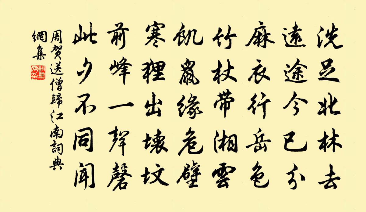 詩詞名句歷史字典書法欣賞書法字典國語詞典說文解字康熙字典古漢語字典標 題 作 者 詩 句 送僧歸江南作者:周賀 朝代:唐代送僧歸江南原文洗足北林去,遠途今已分。麻1/1衣行岳色,竹杖帶湘雲。飢鼠緣危壁,寒狸出壞墳。前峰一聲磬,此夕不同聞。詩詞問答問:送僧歸江南的作者是誰?答:周賀問:送僧歸江南寫於哪個朝代?答:唐代問:送僧歸江南是什麼體裁?答:五律周賀送僧歸江南書法欣賞送僧歸江南書法作品注釋全唐詩:卷503-35詩詞推薦六和塔寺館三宿和秀江亭詩牌韻程公許〔宋代〕鯨呿鰲擲三神山,幻境起滅指顧間。東西帆穡來復去,得似上方僧獨間。看山看水知多少,詩債償殊未字了,膠膠答鄱陽客藥名詩張籍〔唐代〕江皋歲暮相逢地,黃葉霜前半夏枝。子夜吟詩向松桂,心中萬事喜君知。和馮亞寄進士孫磻魏野〔宋代〕閒思生白髮,懶更把菱花。久別何州住,相尋恐路差。獨飛傷寒雁,會宿羨林鴉。猶得君為友,時過老母家。題紫溪驛黃公度〔宋代〕離家一月斷家書,家在閩山深處居。路入江南隔分水,山猶不見況吾廬。南齋竹三絕蘇轍〔宋代〕里中佳客舊孫陳,我自疏慵不見人。目倦細書長掩卷,心游法界四無鄰。偈頌一百零二首釋紹曇〔宋代〕不擬寒山落韻詩,未傳盧老潑禪衣。腳頭活取通宵路,來透庭前劃草機。紇那曲二首劉禹錫〔唐代〕楊柳郁青青,竹枝無限情。周郎一回顧,聽唱紇那聲。踏曲興無窮,調同詞不同。願郎千萬壽,長作主人翁。書懷陸游〔宋代〕西風蕭瑟晚吹衣,又見亭皋木葉飛。已是中年頻作惡,更堪秋日送將歸。黃塵顏鬢無人識,青史功名與願違。強把游羅漢至開先寺項安世〔宋代〕半世懷吾願,今年得此辰。朝廷用和議,疆場有閒人。地噴雙龍沫,雲藏五老身。天寒林影薄,斜日照衣巾。題何氏宅園亭王安石〔宋代〕荷葉參差卷,榴花次第開。但令心有賞,歲月任渠催。問內賀鑄〔宋代〕庚伏壓蒸暑,細君弄鹹縷。烏綈百結裘,茹繭加彌補。勞問汝何為,經營特先期。婦工乃我職,一日安敢墮。嘗聞明慶寺詩江總〔隋代〕十五詩書日。六十軒冕年。名山極歷覽。勝地殊留連。幽厓聳絕壁。洞穴瀉飛泉。金河知證果。石室乃安禪。夜梵江上別石郎中周敦頤〔宋代〕落葉蟬聲古渡頭,渡頭人擁欲行舟。另離情似長江水,遠亦隨公日夜流。立春帖子太上皇后閣周必大〔宋代〕閬苑紅初露,瑤池碧半涵。春生從太極,化洽本周南。丘成之司理明遠閣二首周必大〔宋代〕家傳秘籍慕班斿,有子當追嗣與彪。好事一瓻如許借,樓前百榼果為丘。移居丘葵〔宋代〕田家一路到村南,儘是農人野叟談。鳥過江來平入樹,牛沿堤去倒行潭。蜻蜓影下波紋皺,{左禾右罷}稏穗中秋次韻汪以南教授美康使君新政因及賤跡四首方回〔宋代〕吾州今歲得儒臣,坐鎮浮澆力萬鈞。月榭風台尋古蹟,煙畦雨隴勞遺民。長庚往往詩無敵,子美云云筆有神。老懶軾以去歲春夏,侍立邇英,而秋冬之交,子由蘇軾〔宋代〕微生偶脫風波地,晚歲猶存鐵石心。定似香山老居士,世緣終淺道根深。愁詩李廷璧〔唐代〕到來難遣去難留,著骨黏心萬事休。潘岳愁絲生鬢里,婕妤悲色上眉頭。長途詩盡空騎馬,遠雁聲初獨倚樓。更有次韻曹好謙負春曹緯〔宋代〕作計尋芳不屬貧,可憐風物自良辰。飛花有意能留客,啼鳥多情解喚人。涉世乍驚翻捭薄,論交多語白頭新。十年名句推薦沾衣欲濕杏花雨,吹面不寒楊柳風。志南《絕句》 明月青山夜,高天白露秋。李嶠《同賦山居七夕》 飛花兩岸照船紅,百里榆堤半日風。陳與義《襄邑道中》 庭樹不知人去盡,春來還發舊時花。岑參《山房春事二首》 善改過者,未禁其事,先明其理袁黃《了凡四訓·改過之法》 一郡官閒唯副使,一年冷節是清明。王禹偁《清明日獨酌》 犯刑若履虎,不畏落爪牙。李白《秦女休行》 一一書來報故人,我欲因之壯心魄。李白《赤壁歌送別》 無冥冥之志者,無昭昭之明;無惛惛之事者,無赫赫之功。荀子《荀子·勸學》 但屈指西風幾時來,又不道流年暗中偷換。蘇軾《洞仙歌·冰肌玉骨》