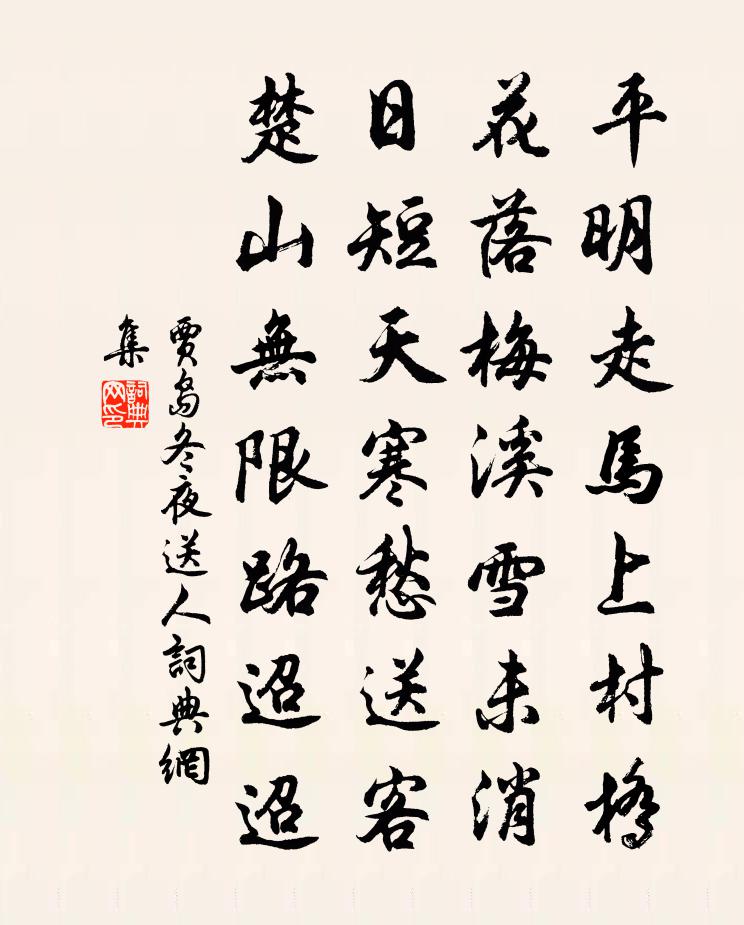 詩詞名句歷史字典書法欣賞書法字典國語詞典說文解字康熙字典古漢語字典標 題 作 者 詩 句 冬夜送人作者:賈島 朝代:唐代冬夜送人原文平明走馬上村橋,花落梅溪雪未消。日短天寒愁送客,楚山無限路迢迢。詩詞問答問:冬夜送人的作者是誰?答:賈島問:冬夜送人寫於哪個朝代?答:唐代問:冬夜送人是什麼體裁?答:七絕問:賈島的名句有哪些?答:賈島名句大全賈島冬夜送人書法欣賞冬夜送人書法作品譯文和注釋譯文天色剛明,我們騎馬送你到村口橋頭。大雪連下幾日積雪未消,枝頭的梅花花瓣隨風飄落,隨著水流而去。冬日晝短夜長,天寒地凍。在這黎明時分你離去,心中萬般不捨啊。那綿延無際的楚山,想著路途遙遠,沿途險阻,不得不為你擔心。注釋平明:猶黎明。天剛亮的時候。走馬:騎馬疾走;馳逐。標籤:送別詩詞推薦落梅風貫雲石〔元代〕新秋至,人乍別,順長江水流殘月。悠悠畫船東去也!這思量起頭兒一夜。送賈訥倅眉二首蘇軾〔宋代〕當年入蜀嘆空回,未見峨眉肯再來。童子遙知頌襦袴,使君先已洗樽罍。(李大夫,眉之賢守也。)鹿頭北望應逢鸚鵡洲送王九游江左孟浩然〔唐代〕昔登江上黃鶴樓,遙愛江中鸚鵡洲。洲勢逶迤繞碧流,鴛鴦鸂鶒滿灘頭。灘頭日落沙磧長,金沙熠熠動光飆。舟人卜運算元·席上送王彥猷周紫芝〔宋代〕江北上歸舟,再見江南岸。江北江南幾度秋,夢裡朱顏換。人是嶺頭雲,聚散天誰管。君似孤云何處歸,我似離群別毛永嘉徐陵〔南北朝〕願子厲風規,歸來振羽儀。嗟余今老病,此別空長離。白馬君來哭,黃泉我詎知。徒勞脫寶劍,空掛隴頭枝。送紫岩張先生北伐岳飛〔宋代〕號令風霆迅,天聲動北陬。長驅渡河洛,直搗向燕幽。馬蹀閼氏血,旗梟克汗頭。歸來報明主,恢復舊神州。送梓州高參軍還京盧照鄰〔唐代〕京洛風塵遠,褒斜煙露深。北游君似智,南飛我異禽。 別路琴聲斷,秋山猿鳥吟。一乖青岩酌,空佇白雲心。夜飛鵲·河橋送人處周邦彥〔宋代〕河橋送人處,良夜何其?斜月遠墮餘輝。銅盤燭淚已流盡,霏霏涼露沾衣。相將散離會,探風前津鼓,樹杪參旗。送宗判官歸滑台序任華〔唐代〕大丈夫其誰不有四方誌?則仆與宗袞二年之間,會而離,離而會,經途所亘,凡三萬里。何以言之?去年春會於京送友游吳越杜荀鶴〔唐代〕去越從吳過,吳疆與越連。有園多種橘,無水不生蓮。夜市橋邊火,春風寺外船。此中偏重客,君去必經年。劍客齊己〔唐代〕拔劍繞殘樽,歌終便出門。西風滿天雪,何處報人恩。勇死尋常事,輕讎不足論。翻嫌易水上,細碎動離魂。秦箏歌,送外甥蕭正歸京岑參〔唐代〕汝不聞秦箏聲最苦,五色纏弦十三柱。怨調慢聲如欲語,一曲未終日移午。紅亭水木不知暑,忽彈黃鐘和白紵。清送劉昱李頎〔唐代〕八月寒葦花,秋江浪頭白。北風吹五兩,誰是潯陽客。鸕鶿山頭微雨晴,揚州郭里暮潮生。行人夜宿金陵渚,試聽贈別王十七管記高適〔唐代〕故交吾未測,薄宦空年歲。晚節蹤曩賢,雄詞冠當世。堂中皆食客,門外多酒債。產業曾未言,衣裘與人敝。飄颻送友人遊河東項斯〔唐代〕停車曉燭前,一語幾潸然。路去干戈日,鄉遙饑饉年。湖波晴見雁,槐驛晚無蟬。莫縱經時住,東南書信偏。送張寺丞覲知富順監司馬光〔宋代〕漢家五尺道,置吏撫南夷。欲使文翁教,兼令孟獲知。盤饈蒟醬實,歌雜竹枝辭。取酒須勤醉,鄉關不可思。和陸明府贈將軍重出塞陳子昂〔唐代〕忽聞天上將,關塞重橫行。始返樓蘭國,還向朔方城。黃金裝戰馬,白羽集神兵。星月開天陣,山川列地營。晚風上西平·送杜叔高辛棄疾〔宋代〕恨如新,新恨了,又重新。看天上、多少浮雲。江南好景,落花時節又逢君。夜來風雨,春歸似欲留人。尊如海,送魏萬之京李頎〔唐代〕朝聞遊子唱離歌,昨夜微霜初渡河。鴻雁不堪愁里聽,雲山況是客中過。關城樹色催寒近,御苑砧聲向晚多。(樹送七兄赴揚州帥幕陸游〔宋代〕初報邊烽照石頭,旋聞胡馬集瓜州。諸公誰聽芻蕘策,吾輩空懷畎畝憂。急雪打窗心共碎,危樓望遠涕俱流。豈知名句推薦錦帶吳鉤,征思橫雁水。吳文英《荔枝香近·送人游南徐》 坐蔭從容煩暑退,清心恍惚微香觸。陸容《滿江紅·詠竹》 訪戴歸來,尋梅懶去,獨釣無聊。薛昂夫《蟾宮曲·雪》 今年對花最匆匆,相逢似有恨,依依愁悴。周邦彥《花犯·小石梅花》 無花無酒過清明,興味蕭然似野僧。王禹偁《清明》 榮寵有初,鮮有終者;吉凶無常,智者少禍。來俊臣《羅織經·固榮卷第六》 寒蟬鳴處,回首斜陽暮。趙彥端《點絳唇·途中逢管倅》 少年射虎名豪,等閒赤羽千夫膳元好問《水龍吟·從商帥國器獵於南陽同仲澤鼎玉賦此》 目妄視則淫,耳妄聽則惑,口妄言則亂。劉安及其門客《淮南子·主術訓》 萬里想龍沙,泣孤臣吳越張元乾《石州慢·己酉秋吳興舟中作》