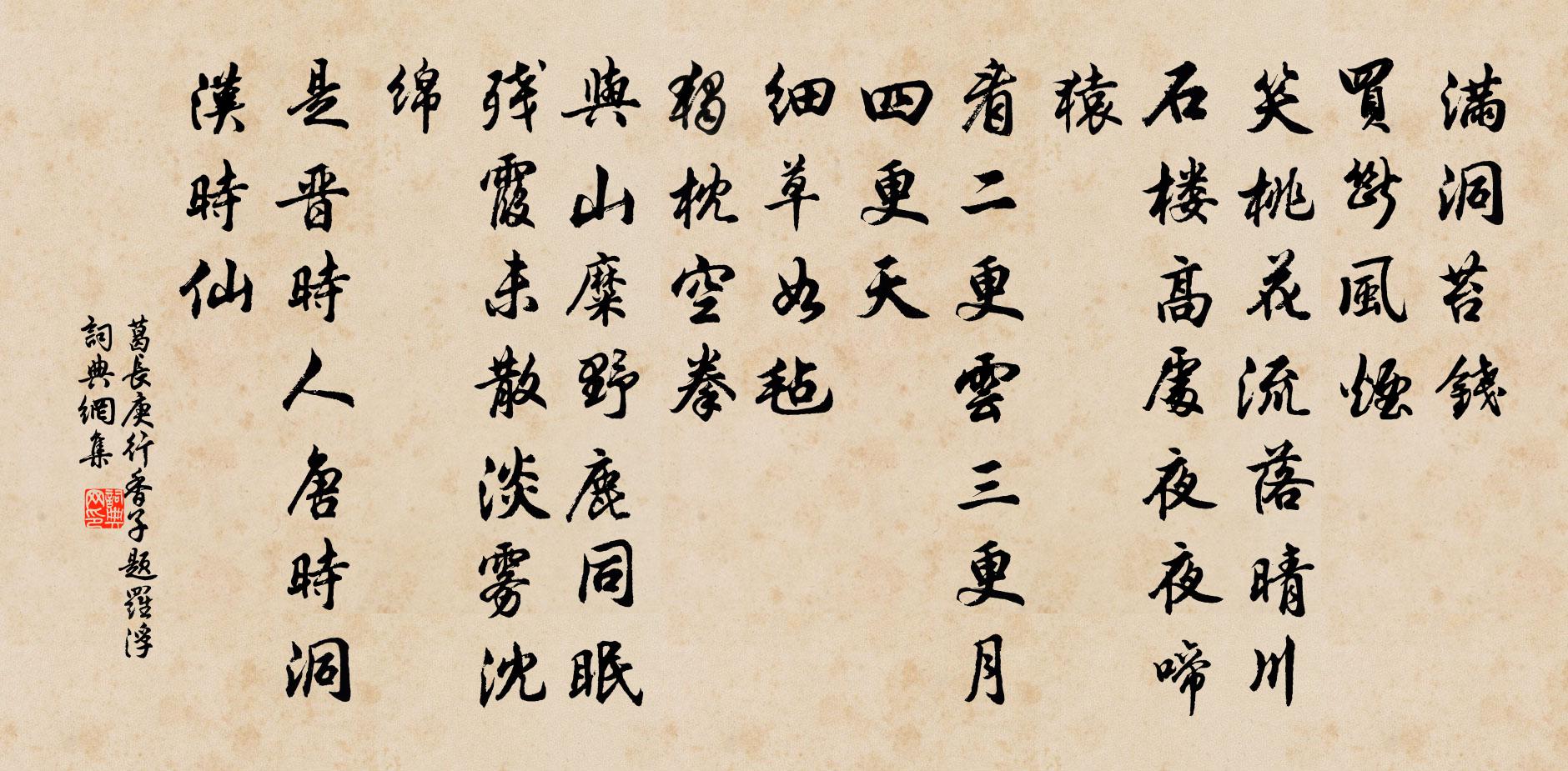 “滿洞苔錢,買斷風煙 。笑桃花流落晴川。”滿洞蒼苔 ,可見歷時已久,人跡罕至 。“ 買斷”即買盡。苔雖形如錢,只能點綴風煙。但它代表了一種清貧自賞自然超俗的情趣。“買斷風煙”即占盡風煙,獨得自然景致之勝。古洞蒼苔,高人逸士獨來獨往,片片桃花隨溶溶川水流出,向人間傳送出一絲洞天的訊息。世外人並不知道此處別有桃源仙境,故“笑”之,笑桃花多情,笑世人無識 。“ 石樓高處,夜夜啼猿。看二更雲,三更月,四更天。”據《 嘉靖惠州府志 》卷五《地理志 》載,羅浮山“ 上山十里,有大小石樓。二樓相去五里 ,其狀如樓。有石門,俯視滄海,夜半見日出”,可見其高。夜深人靜 ,萬籟俱寂,唯有空山聲聲猿啼 ,使人警省。此時此地,修道之人,靜坐默想 ,獨觀雲月 ,擁抱宇宙 ,體悟宇宙奧秘,直觀生命真諦,自得其樂,意靜神旺。這幾句將道家山中生活的自然環境與辭別塵世,靜處修煉而至內心聰慧的生活情趣勾畫了出來。所謂“二更雲,三更月,四更天 ”,實際上寫的是消除塵念的修煉過程。開始猶存世念,如行雲蔽月 ,繼而虛室生白,表里空一,終而至人無己,湛然空明,如片雲除盡,空中唯皎皎孤輪。