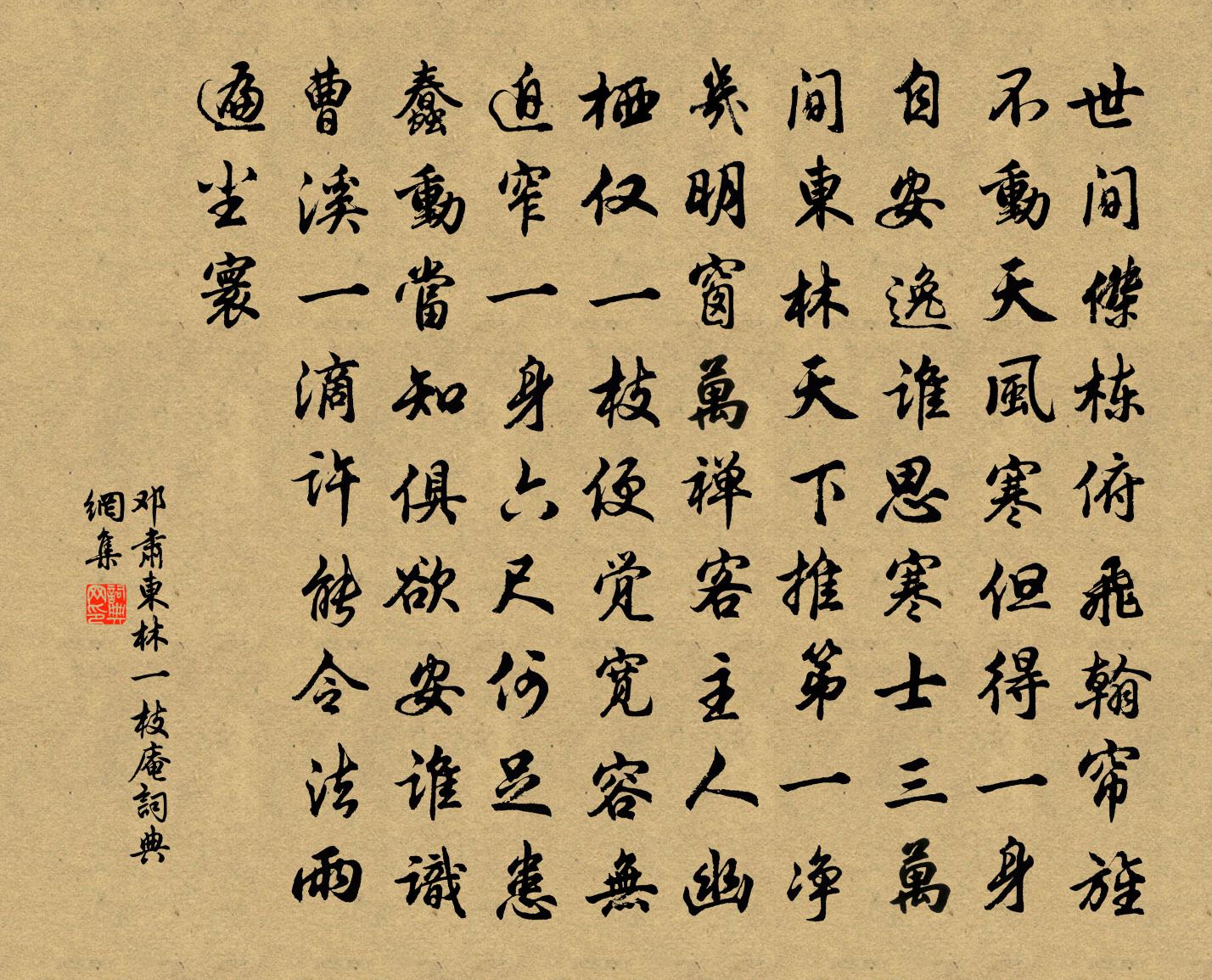 詩詞名句歷史字典書法欣賞書法字典國語詞典說文解字康熙字典古漢語字典標 題 作 者 詩 句 東林一枝庵作者:鄧肅 朝代:宋代東林一枝庵原文世間傑棟俯飛翰,簾旌不動天風寒。但得一身自安逸,誰思寒士三萬間。東林天下推第一,淨幾明窗萬禪客。主人幽棲僅一枝,便覺寬容無迫窄。一身六尺何足患,蠢動當知俱欲安。誰識曹溪一滴許,能令法雨遍塵寰。詩詞問答問:東林一枝庵的作者是誰?答:鄧肅問:東林一枝庵寫於哪個朝代?答:宋代鄧肅東林一枝庵書法欣賞東林一枝庵書法作品詩詞推薦和仲固春日村居即事十二絕胡寅〔宋代〕正眼如君了了明,未嘗沉醉本來醒。自將周易規兒輩,白馬空傳一藏經。秋分日憶用濟紫靜儀〔清代〕遇節思吾子,吟詩對夕曛。燕將明日去,秋向此時分。 逆旅空彈鋏,生涯只賣文。歸帆宜早掛,莫待雪紛紛。 雜曲歌辭楊白花柳宗元〔唐代〕楊白花,風吹度江水。坐令宮樹無顏色,搖盪春光千萬里。茫茫曉日下長秋,哀歌未斷城鴉起。新秋有感李中〔唐代〕門巷涼秋至,高梧一葉驚。漸添衾簟爽,頓覺夢魂清。暗促蓮開艷,乍催蟬發聲。雨降炎氣減,竹引冷煙生。戍客點絳唇陳允平〔宋代〕眉葉顰愁,淚痕紅透蘭襟潤。雁聲將近。須帶平安信。獨倚江樓,落葉風成陣。情懷悶。蝶隨蜂趁。滿地黃花恨。聞叔易隱居被詔晁說之〔宋代〕東海一生垂釣客,石渠萬卷校書郎。丈人風味今如此,鶴到揚州興更長。趣饒伯輿來期趙汝騰〔宋代〕忽得高賢訊,篝燈讀數回。苦辭白鹿講,盍為紫陽來。水毀祠無恙,堂新教有開。須君速戾止,倡道淑英材。送王孟同館黃岩見王簡卿侍郎陳謙〔宋代〕吾子勇出鄉,賣文供啜菽。誰指石頭路,路滑去能速。大溪拍天流,返壑僅盈掬。神化闕功能,善世眩兼獨。寶瑟自江州司馬授忠州刺史仰荷聖澤聊書鄙誠白居易〔唐代〕炎瘴拋身遠,泥塗索腳難。網初鱗撥剌,籠久翅摧殘。雷電頒時令,陽和變歲寒。遺簪承舊念,剖竹授新官。鄉覺寄陸子靜先生朱桴〔宋代〕此理於人無間然,昏明何事異天淵。自從斷卻閒牽引,俯引周旋只事天。示兒二首謝枋得〔宋代〕門戶興衰不自由,樂天知命我無憂。大兒安得孔文舉,生子何如孫仲謀。天上麒麟元有數,人間豚犬不須愁。養男題濂溪書院董嗣杲〔宋代〕遠徑溪流水自圓,光風霽月渺無邊。窗前生意休除草,堂上清風獨愛蓮。萬古共知歸有極,一塵不染見先天。未知約同舍蜀人王德修三首陳傅良〔宋代〕疇昔夢遡江,巴陵至瞿唐。兩崖束秋旻,中有一帶蒼。安流進分寸,怒去千丈強。求君竟不得,望之涕淋浪。往日臨江仙(宿僧舍)毛滂〔宋代〕古寺長廊清夜美,風松煙檜蕭然。石闌乾外上疏簾。過雲閒窈窕,斜月靜嬋娟。獨自徘徊無個事,瑤琴試奏流泉。詠史二首·其一李商隱〔唐代〕北湖南埭水漫漫,一片降旗百尺竿。三百年間同曉夢,鐘山何處有龍盤。送韓都護還邊盧綸〔唐代〕好勇知名早,爭雄上將間。戰多春入塞,獵慣夜登山。陣合龍蛇動,軍移草木閒。今來部曲盡,白首過蕭關。送康判官往新安賦得江路西南永(一作劉長卿詩)皇甫冉〔唐代〕不向新安去,那知江路長。猿聲比廬霍,水色勝瀟湘。驛樹收殘雨,漁家帶夕陽。何須愁旅泊,使者有輝光。對雪和子厚弟四首王之道〔宋代〕瑤林我家風,銀色佛世界。冷冷一川水,淙玉漱寒瀨。敲冰往得魚,撥凍自挑菜。山居果如此,冷暖在交態。漁家傲(夏月)黃裳〔宋代〕汗漫金華寒委地。火雲散盡奇峰勢。紈扇團圓休與比。猶可喜。恩情不怕涼飆至。夢冷魂高何處寄。琉璃砌上籠人簡寂觀作孫邁〔宋代〕松接朝天路,鍾聞賈客船。醮壇秋有月,丹井古無泉。名句推薦四十三年,望中猶記,烽火揚州路。辛棄疾《永遇樂·京口北固亭懷古》 無參驗而必之者,愚也;弗能必而據之者,誣也。韓非及後人《韓非子·顯學》 人有短,切莫揭。人有私,切莫說。李毓秀《弟子規·泛愛眾》 東城漸覺風光好。宋祁《玉樓春·春景》 重重蕊葉相憐,似青帔艷妝神仙侶。曹勛《夾竹桃花·詠題》 曉風不散愁千點,宿雨還添淚一痕。曹雪芹《詠白海棠》 要人知重勤學,怕人知事莫做。馮夢龍《警世通言·卷三十三》 人無禮則不生,事無禮則不成,國家無禮則不寧。荀子《荀子·修身》 苕之華,其葉青青。佚名《苕之華》 移風易俗,莫善於樂。孔子及其弟子《孝經·廣要道》