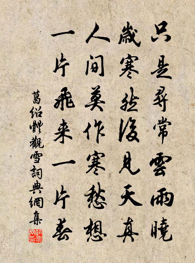 詩詞名句歷史字典書法欣賞書法字典國語詞典說文解字康熙字典古漢語字典標 題 作 者 詩 句 觀雪作者:葛紹體 朝代:宋代觀雪原文只是尋常雲雨曉,歲寒然後見天真。人間莫作寒愁想,一片飛來一片春。詩詞問答問:觀雪的作者是誰?答:葛紹體問:觀雪寫於哪個朝代?答:宋代葛紹體觀雪書法欣賞觀雪書法作品詩詞推薦憶強甫劉克莊〔宋代〕臨歧約共屠蘇酒,及飲屠蘇汝未歸。縱使舉頭瞻日近,可堪返顧見雲飛。索長安米難淹久,回剡溪船果是非。別後遠齋和示疏字韻四詩復用韻並呈子肅趙蕃〔宋代〕春風吹雨密還疏,門掩荒山數畝居。換米但須居士屩,入都寧倚子公書。安貧自足容高枕,處事時應念覆車。所恨故相少師李公輓詩李彌遜〔宋代〕天意康時難,賢生蓋世雄。風流晉人上,事業舜歌中。許國回天力,懷君貫日忠。平生英爽氣,凜凜未成空。送日侍者游兩府兼柬丁仲容先生王冕〔元代〕知君汗漫饒清興,東府西州路不多。牛斗正臨吳分野,城池還帶舊山河。春風揚子江頭去,夜月茅山石畔過。若見郴江百詠並序茶山寺阮閱〔宋代〕莽草寒蘆事不經,八峰深在亂雲層。只因一句鵝湖讖,直至於今有此稱。征婦怨效張籍釋善珍〔宋代〕前年番兵來,郎戰淮河西。官軍來上功,不待郎書題。淮河在何許,妾身那得去。生死不相待,白骨應解語。天寒贈僧葛慶龍〔宋代〕七軸蓮經供茗瓢,一龕鄉佛性松寮。舶香亦帶魚龍氣,自采枝頭柏子燒。興元府園亭雜詠棋軒文同〔宋代〕北城雲最高,上復有喬木。垂蘿密如帳,中乃營小屋。時引方外人,百憂銷一局。頌古八首釋深〔宋代〕一人背手抽金鏃,一人反身控角弓。南北東西競頭看,果然一雁落寒空。出真州文天祥〔宋代〕秦庭痛哭血成川,翻訝中行背可鞭。南北共知忠義苦,平生只少兩淮緣。蕭何張耒〔宋代〕蕭公俯仰系安危,功業君王心獨知。猶道邵平能緩頰,君臣從古固多疑。論語絕句一百首張九成〔宋代〕善勝不於常勝得,無方始向有方求。故知欲使人無訟,莫使情於聽處留。遣興三首文同〔宋代〕運陰不肯解,山霧嘗霏霏。積潤日已滋,厭浥沾人衣。展轉厭早起,隔窗問晴暉。幸聞太陽出,身體輕欲飛。阻風鍾家村觀岸傍物花二首楊萬里〔宋代〕水蟲才出綠波來,細看爬沙上石崖。化作蜻蜓忽飛去,幾時飛去卻飛回。鼓腹無所思朝起暮歸眠湫明詩也以詩定韻為十滕岑〔宋代〕立夏少半月,穀雨是今朝。梅子酸著齒,麥穗長半腰。天運不暫停,又將轉斗杓。無復冬裘御,重取夏扇搖。木芙蓉李春伯〔宋代〕甚疑牡丹業,但病皮骨老。不宜入水看,只可隔水眺。入谷馬上文同〔宋代〕群山護秦隴,轉去轉幽深。嵐氣重壓眼,秋光清徹心。憑鞍吟絕壁,解帶坐高林。愛此岩泉好,臨流浣俗襟。惜奴嬌佚名〔宋代〕夸帝里。萬靈鹹集,永衛紫陌青樓,富臻既庶矣。四海昇平,文武功勳蓋世。賴聖主,興賢佐,恁致理。氣緒凝和贈盧績白居易〔唐代〕餘杭縣裡盧明府,虛白亭中白舍人。今日相逢頭似雪,一杯相勸送殘春。送嚴侍御充東畿觀察判官劉長卿〔唐代〕洛陽征戰後,君去問凋殘。雲月臨南至,風霜向北寒。故園經亂久,古木隔林看。誰訪江城客,年年守一官。名句推薦流水落花春去也,天上人間。李煜《浪淘沙令·簾外雨潺潺》 選賢於野,則治身業弘;求士子朝,則飾智風起。沈約《宋書·列傳·卷五十五》 山頭堆白雪,風裡卷黃沙。楊守禮《三月巡邊曉發夏城》 春已歸來,看美人頭上,裊裊春幡。辛棄疾《漢宮春·立春日》 誰問旗亭,美酒斗十千。賀鑄《行路難·縛虎手》 虎狼也有父子之情。馮夢龍《喻世明言·卷二十一》 還作一段相思,冷波葉舞愁紅,送人雙槳。吳文英《解蹀躞·醉雲又兼醒雨》 無計奈情何,且醉金杯酒。晏幾道《生查子·輕勻兩臉花》 君子惜名,小人愛身。來俊臣《羅織經·保身卷第七》 有善始者實繁,能克終者蓋寡吳兢《貞觀政要·卷一·論君道》