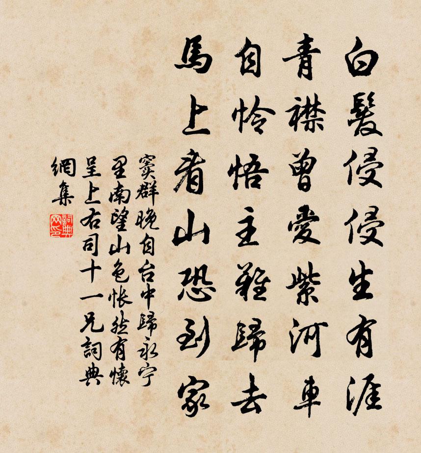 詩詞名句歷史字典書法欣賞書法字典國語詞典說文解字康熙字典古漢語字典標 題 作 者 詩 句 晚自台中歸永寧里南望山色悵然有懷呈上右司十一兄作者:竇群 朝代:唐代原文白髮侵侵生有涯,青襟曾愛紫河車。自憐悟主難歸去,馬上看山恐到家。詩詞問答問:《晚自台中歸永寧里南望山色悵然有懷呈上右司十一兄》的作者是誰?答:竇群問:該詩寫於哪個朝代?答:唐代書法欣賞晚自台中歸永寧里南望山色悵然有懷呈上右司十一兄書法作品詩詞推薦漫興 其三王冕〔元代〕風花片片落瑤台,江北江南春未回。老子胸中自瀟灑,故鄉何處卻徘徊。海雲挾雨連天黑,江鸛如人近屋來。景物偈頌八十五首釋妙倫〔宋代〕飽叔眼下安眉,趙哥口邊著耳。驀然狹路相逢,兩個是甚面嘴。和張簿寧國山門六題漣漪洞梅堯臣〔宋代〕流泉決決出洞底,自有細浪非風吹。山花逐水到山下,漏泄人間春未知。詠梅五十首呈史尚書釋紹嵩〔宋代〕露裛幽花冷自香,此花盡更有商量。肌膚冰雪薰沉水,疏影寒光照野塘。偶作白居易〔唐代〕紅杏初生葉,青梅已綴枝。闌珊花落後,寂寞酒醒時。坐悶低眉久,行慵舉足遲。少年君莫怪,頭白自應知。渡浙江陳陶〔唐代〕適越一輕艘,凌兢截鷺濤。曙光金海近,晴雪玉峰高。靜寇思投筆,傷時欲釣鰲。壯心殊未展,登涉漫勞勞。聞笛晁公溯〔宋代〕落日臥郿塢,忽聞吹笛聲。天清孤鶴唳,江淨蟄龍鳴。谷響風時下,山高月未生。誰能永今夕,呼酒與同傾。張十八員外以新詩二十五首見寄郡樓月下吟玩…寄微之白居易〔唐代〕秦城南省清秋夜,江郡東樓明月時。去我三千六百里,得君二十五篇詩。陽春曲調高難和,淡水交情老始知。坐到題長江賈島〔唐代〕言心俱好靜,廨署落暉空。歸吏封宵鑰,行蛇入古桐。長江頻雨後,明月眾星中。若任遷人去,西溪與剡通。酬康州韋侍御同年許渾〔唐代〕桂楫美人歌木蘭,西風裊裊露漙漙。夜長曲盡意不盡,月在清湘洲渚寒。夏遊招隱寺暴雨晚晴李正封〔唐代〕竹柏風雨過,蕭疏台殿涼。石渠寫奔溜,金剎照頹陽。鶴飛岩煙碧,鹿鳴澗草香。山僧引清梵,幡蓋繞迴廊。文宣王及其弟子贊宋高宗〔宋代〕式是壤伯,昭乎聖徒。執經請益,載道若無。詩書規矩,學問楷模。得時而駕,領袖諸儒。壽周提刑二首吳泳〔宋代〕分得濂溪一派清,皇皇仁義不貪名。金華學道行持到,禹穴題輿去就輕。一節以趨何簡易,十年不調轉光明。匡時已亥雜詩 4龔自珍〔清代〕此去東山又北山,鏡中強半尚紅顏。白雲出處從無例,獨往人間竟獨還。宛丘二詠蘇轍〔宋代〕旱湖堤上柳空多,倚岸輕舟奈汝何。秋雨連渠添積潤,春風吹凍忽生波。蟲魚便爾來無數,鳧雁猶疑未肯過。持詫題賺蘭亭圖劉克莊〔宋代〕山陰繭紙見者希,辨才傳之於永師。行年八十手不釋,棲之樑上鬼莫窺。虬須天子欲得之,威以禍福僧詭辭。智勇浣溪沙(李參政壁賦浣溪沙三首再次韻謝之)魏了翁〔宋代〕一日嘉名萬口傳。都憑新樂播芳鮮。非關呈瑞作人妍。地褊不妨金步穩,境幽生怕鼓聲填。餘尊相與重留連。句釋從垣〔宋代〕□踏浪□知浪險,蝶翻花宅惜花空。中秋月成彥雄〔唐代〕王母妝成鏡未收,倚欄人在水精樓。笙歌莫占清光盡,留與溪翁一釣舟。念奴嬌仲殊〔宋代〕水楓葉下,乍湖光清淺。涼生商素。西帝宸游羅翠蓋,擁出三千宮女。絳采嬌春,鉛華掩晝,占斷鴛鴦浦。歌聲搖名句推薦事非宜,勿輕諾。苟輕諾,進退錯。李毓秀《弟子規·信》 自恨枝無葉,莫怨太陽偏。佚名《增廣賢文·上集》 君行四月草萋萋,柳花桃花半委泥。納蘭性德《送蓀友》 知足之心,可用之以處境,不可用之以讀書。王永彬《圍爐夜話·第一五九則》 不知何歲月,得與爾同歸?韋承慶《南中詠雁詩》 今日暫同芳菊酒,明朝應作斷蓬飛。王之渙《九日送別》 子規啼,不如歸,道是春歸人未歸。關漢卿《大德歌·春》 懷舊空吟聞笛賦,到鄉翻似爛柯人。劉禹錫《酬樂天揚州初逢席上見贈》 雲物不殊鄉國異,教兒且覆掌中杯。杜甫《小至》 孟夏草木長,繞屋樹扶疏。陶淵明《讀山海經·其一》