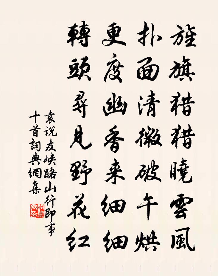 詩詞名句歷史字典書法欣賞書法字典國語詞典說文解字康熙字典古漢語字典標 題 作 者 詩 句 峽路山行即事十首作者:袁說友 朝代:宋代峽路山行即事十首原文旌旗獵獵曉雲風,撲面清微破午烘。更度幽香來細細,轉頭尋見野花紅。詩詞問答問:峽路山行即事十首的作者是誰?答:袁說友問:峽路山行即事十首寫於哪個朝代?答:宋代袁說友峽路山行即事十首書法欣賞峽路山行即事十首書法作品詩詞推薦和麟老韻五絕王炎〔宋代〕詩清雖為竹庵編,禪妙元從佛眼傳。用處縱橫能殺活,匣藏不肯試龍泉。蕪湖董嗣杲〔宋代〕規規安利慾,擾擾競光陰。男邑瀕江尾,商家截市心。炎涼難洗盪,風月易招尋。見說圩田熟,欣逢節序臨。沁園春(壽趟倅)姚勉〔宋代〕道骨仙風,海上騎鯨,端是後身。把銀河天巧,鍾為文采,劍津寶氣,融作精神。壺玉儲冰,掌金擎露,胸次全無和虞智父登清谿閣許志仁〔宋代〕葉脫林梢處處秋,壯懷易感更登樓。日伴鍾阜煙凝碧,霜落秦淮水慢流。人似沖宣思故國,詩如杜老到夔州。十年阮郎歸史達祖〔宋代〕龍香吹袖白藤鞭。帽檐沖柳煙。一春幾度畫橋邊。東風聽管弦。花活計,酒因緣。從人嘲少年。真須吟就綠楊篇。答山驛夢白居易〔唐代〕入君旅夢來千里,閉我幽魂欲二年。莫忘平生行坐處,後堂階下竹叢前。春遊李新〔宋代〕寂寂茂陵春,文園病後情。黃蜂腰欲斷,細柳眼初明。麗服駢游女,余酣失老兵。殘粧深院落,相對任卿卿。次韻趙公直賞心亭醵會古風周必大〔宋代〕晉人夸新亭,假日輒高會。中間伯仁輩,未免楚囚對。江山猶古昔,人物已曖昧。東郊今保厘,翠華記行在。佳麗雪後梅邊方岳〔宋代〕半身蒼蘚雪槎枒,直到頂頭才數花。看尺玉林山上下,還須渠是當行家。和張時可景靈宮即事及暫歸南湖二詩何澹〔宋代〕南湖風月想經行,隱興常多薄宦情。輦轂只今煩佐治,僮奴休復事歡迎。人如仲舉輿增重,客為相如座盡傾。咫尺奉和聖制過溫湯鄭義真〔唐代〕洛川方駐蹕,豐野暫停鑾。湯泉恆獨涌,溫谷豈知寒。漏鼓依岩畔,相風出樹端。嶺煙遙聚草,山月迥臨鞍。日用上巳日阻雨和王沖之韻王之道〔宋代〕袚除聊復對江亭,樽酒相從一笑傾。那得引時仍此樂,況逢難弟與難兄。潺潺暮雨檐間溜,滑滑春泥柳外聲。好在挽吳茂新侍郎三首劉克莊〔宋代〕□□乘驄馬,安能作噤烏。去因攻潞國,來又薦君謨。□□延英疏,丹青洛社圖。嗚呼傳不朽,猶足警奸諛。失調名佚名〔宋代〕巧畫遠山眉。朱槿花二首張俞〔宋代〕風雨無人弄晚芳,野橋千樹斗紅房。朝榮暮落成何事,可笑紛華不久長。賈秋壑圃黃庚〔宋代〕不學蒼龍臥浙東,驚飈吟佩墮青璁。既無良策安江左,空有名園似洛中,危棧連雲晴亦雨,飛樓近海夜生風。人間春晚雜興陸游〔宋代〕青梅薦煮酒,綠樹變鳴禽。處世已如客,傷春無復心。焚香惟默坐,曳杖亦幽尋。一日悠然過,深慚惜寸陰。漢廣佚名〔先秦〕南有喬木,不可休思;漢有游女,不可求思。漢之廣矣,不可泳思;江之永矣,不可方思。翹翹錯薪,言刈其楚;萬安道中書事德三首楊萬里〔宋代〕攜家滿路蹈春華,兒女欣欣不憶家。騎吏也忘行役苦,一人人插一枝花。詩王粲〔魏晉〕列車息眾駕。相伴綠水湄。幽蘭吐芳烈。芙蓉發紅暉。百鳥何繽翻。振翼羣相追。投網引潛鯉。強弩下高飛。白日名句推薦何人解賞西湖好,佳景無時。歐陽修《採桑子·何人解賞西湖好》 別日南鴻才北去,今朝北雁又南飛。魚玄機《閨怨》 欲渡黃河冰塞川,將登太行雪滿山。李白《行路難·其一》 一尺深紅勝麴塵,天生舊物不如新。溫庭筠《南歌子詞二首 / 新添聲楊柳枝詞》 今日大風寒,寒風摧樹木,嚴霜結庭蘭佚名《孔雀東南飛並序/古詩為焦仲卿妻作》 一曲陽關,斷腸聲盡,獨自憑蘭橈柳永《少年游·參差煙樹灞陵橋》 朝見馬嶺黃沙合,夕望龍城陣雲起。盧思道《從軍行》 鵲辭穿線月,花入曝衣樓。李賀《七夕》 良冶之子,必學為裘;良弓之子,必學為箕戴聖《禮記·學記》 歲暮鋤犁傍空室,呼兒登山收橡實。張籍《野老歌 / 山農詞》