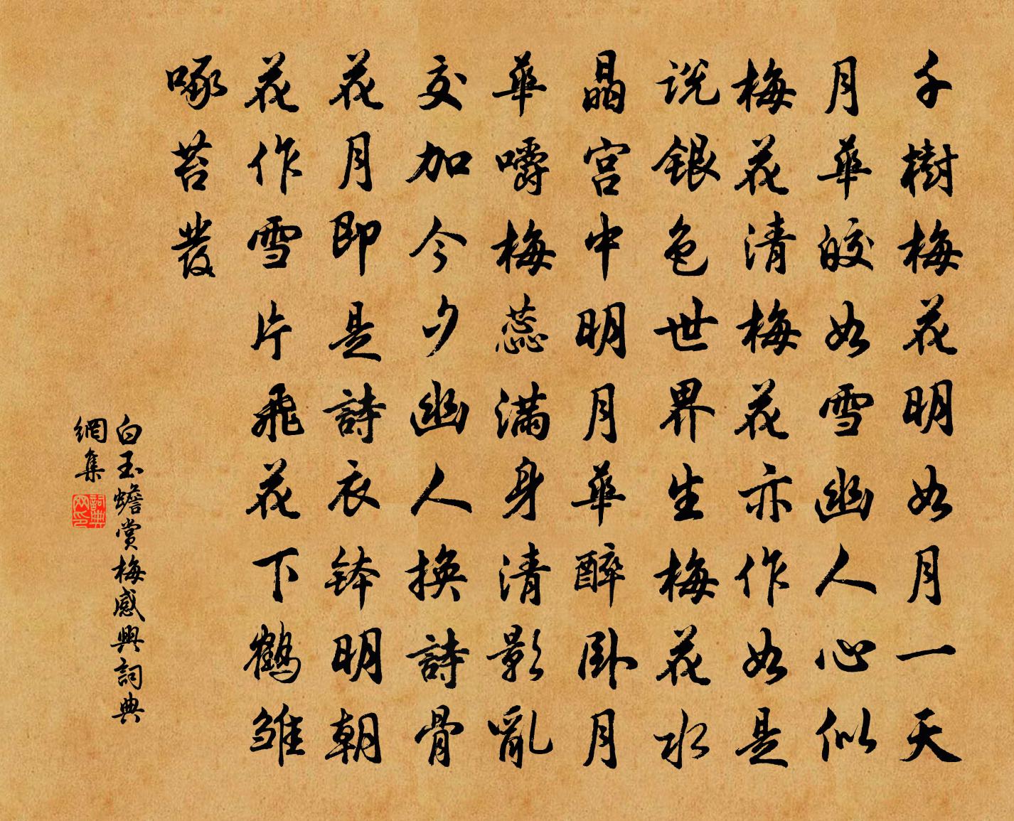 詩詞名句歷史字典書法欣賞書法字典國語詞典說文解字康熙字典古漢語字典標 題 作 者 詩 句 賞梅感興作者:白玉蟾 朝代:宋代賞梅感興原文千樹梅花明如月,一天月華皎如雪。幽人心似梅花清,梅花亦作如是說。銀色世界生梅花,水晶宮中明月華。醉臥月華嚼梅蕊,滿身清影亂交加。今夕幽人換詩骨,花月即是詩衣缽。明朝花作雪片飛,花下鶴雛啄苔發。詩詞問答問:賞梅感興的作者是誰?答:白玉蟾問:賞梅感興寫於哪個朝代?答:宋代問:賞梅感興是什麼體裁?答:七古白玉蟾賞梅感興書法欣賞賞梅感興書法作品詩詞推薦和危府教劉過〔宋代〕行腳諸方履歷深,似禪和子寄叢從。試拈朝報一轉語,以道觀之無損心。送河間晁寺丞文天祥〔宋代〕公孫富文墨,名字世多知。談笑取高第,弦歌當此時。臨河薪石費,近塞繭絲移。緩急當愁此,看君有所為。酬僧吳融〔唐代〕吾師既續惠休才,況值高秋萬象開。吟處遠峰橫落照,定中黃葉下青苔。雙林不見金蘭久,丹楚空翻組繡來。聞說公園宋祁〔宋代〕幽興足端倪,危橋便見溪。浪輕魚喜擲,山近鳥工啼。弱葦披風漵,涼蔬甲雨畦。使君來已屢,林下自成蹊。送呂時可監丞朝假歸里胡仲弓〔宋代〕局面新更著數寬,如何國手要投閒。逆知後日清流禍,厭作中朝時樣官。兄弟真情求去易,君臣大義學來難。玉音南湖春泛有客自北至說友人岑元…敘相思之志以寄焉皎然〔唐代〕故人隔楚水,日夕望芳洲。春草思眇眇,征雲暮悠悠。心期無形影,跡曠成阻修。有客江上至,知君佐雄州。鏗鏘落梅王之望〔宋代〕春意枝間忽暗驚,乘風作陣去縱橫。蒼苔可忍欺香骨,粉蝶無端亂舞英。有恨應羞霜月照,鍾情猶賴晚風輕。夢回出塞李新〔宋代〕城頭落日黃雲起,斷草飛蓬滿千里。紅塵一騎踏高回,半夜驅兵渡遼水。馬蹄行盡關山月,燕然山下沙如雪。負戈湖州歌九十八首 其七十汪元量〔宋代〕皇帝初開第一筵,天顏問勞思綿綿。大元皇后同茶飯,宴罷歸來月滿天。南湖書齋張鎡〔宋代〕雨深愁入樹花飄,盡際翻晴現帝霄。目力壯時蒼岫長,心情閒處戲魚跳。秋雲總是詩家物,夜市今連里陌橋。船子偈十三首釋法泰〔宋代〕幽鳥語如篁,柳垂金線長。少林傳底事,對面不囊藏。水龍吟·甲辰歲壽韓南辛棄疾〔宋代〕渡江天馬南來,幾人真是經綸手。長安父老,新亭風景,可憐依舊。夷甫諸人,神州沉陸,幾曾回首。算平戎萬里長思仙馬鈺〔元代〕壘浮圖。壘浮圖。悟徹浮生惡假軀。回頭認本初。莫踟躕。莫躊躕。急急修完無價珠。功成蓬島居。芙蓉月趙以夫〔宋代〕黃葉酒舞碧空,酒臨水處、酒照眼紅苞酒齊吐。柔情媚態,佇立西風如訴。遙想仙家城闕,十萬綠衣童女。雲飄緲和朱元晦九曲櫂歌歐陽光祖〔宋代〕玉女峰臨二曲流,刳心學道幾春秋。東風不信心如鐵,卻放石楠花滿頭。七十翁吟七言十絕方回〔宋代〕周家八百年天下,文武焉知有赧王。老壽彭公亦余骨,始知生死是興亡。田舍即事十首劉克莊〔宋代〕事國嘗陳力,明農晚乞骸。擊鮮兒勿費,執醬老難偕。僅可從沮溺,安能望賜回。幾曾識奇字,門外客休來。次韻何茂恭詠玉簪三絕喻良能〔宋代〕未開黃鈿紫冠小,誰與幽人作好秋。一笑相看兩不厭,翠雲堆里玉搔頭。送僧造普同塔釋行機〔宋代〕珊珊玉骨本玲瓏,掛角羚羊不見蹤。特地作亭圖甚麽,為憐松竹引清風。壬戌二月十九日都巡李叔永躬按酒課於會田市曾豐〔宋代〕主人未叱麴車回,客子涎流口欲開。阮籍已收青眼去,陶潛休望白衣來。名句推薦吳洲如見月,千里幸相思。李白《送張舍人之江東》 風力雖尚勁,然徒步則汗出浹背。袁宏道《滿井遊記》 和戎詔下十五年,將軍不戰空臨邊。陸游《關山月》 落月滿屋樑,猶疑照顏色。杜甫《夢李白二首·其一》 休別有魚處,莫戀淺灘頭。佚名《增廣賢文·上集》 一片段預告飛減卻春,風飄萬點正愁人。杜甫《曲江二首》 風急桃花也似愁,點點飛紅雨。如晦《楚天遙過清江引·有意送春歸》 冬宜密雪,有碎玉聲。王禹偁《黃岡竹樓記》 百花頭上開,冰雪寒中見。辛棄疾《生查子·重葉梅》 今日雲景好,水綠秋山明。李白《九日》