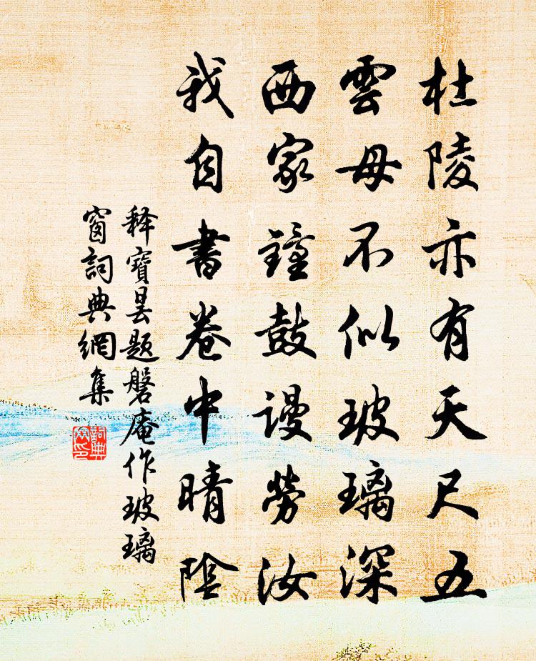 詩詞名句歷史字典書法欣賞書法字典國語詞典說文解字康熙字典古漢語字典標 題 作 者 詩 句 題磐庵作玻璃窗作者:釋寶曇 朝代:宋代題磐庵作玻璃窗原文杜陵亦有天尺五,雲母不似玻璃深。西家鐘鼓謾勞汝,我自書卷中晴陰。詩詞問答問:題磐庵作玻璃窗的作者是誰?答:釋寶曇問:題磐庵作玻璃窗寫於哪個朝代?答:宋代釋寶曇題磐庵作玻璃窗書法欣賞題磐庵作玻璃窗書法作品詩詞推薦芳蘭李世民〔唐代〕春暉開紫苑,淑景媚蘭場。映庭含淺色,凝露泫浮光。日麗參差影,風傳輕重香。會須君子折,佩里作芬芳。四和二首劉克莊〔宋代〕朱門畫鼓舞宮靴,應笑狂歌似采和。露坐一生無步障,春遊是處有行窩。紹興讜議誰當續,元祐全人本不多。辦取鷓鴣天(鵝湖歸病起作)辛棄疾〔宋代〕著意尋春懶便回。何如信步兩三杯。山才好處行還倦,詩未成時雨早催。攜竹杖,更芒鞋。朱朱粉粉野蒿開。誰家田家屋上壺梅堯臣〔宋代〕修蔓屋頭綴,大壺檐外重。霜乾葉猶苦,風斷根未移。收掛煙突近,開充酒具遲。賤生無所用,會有千金時。梅花 其四王冕〔元代〕昔年曾踏西湖路,巢居閣上春無數。雪晴月白影精神,瑪瑙坡前第三樹。虬枝屈夷交碧苔,疏花暖送珍珠胎。初疑會長沙十二縣宰真德秀〔宋代〕從來守令與斯民,都是同胞一樣親。豈有脂膏供爾祿,不思痛癢切吾身。此邦祗似唐時古,我輩當如漢吏循。今夕和仲弟十絕劉克莊〔宋代〕弟兄雖幸忝朱輪,各是人間五十人。只合共娛千歲母,可能少補二州民。路居士山水歌王洋〔宋代〕人年八十百慮昏,丈人耳目方聰明。他人到此筋力疲,丈人勝如年少時。老中強健閒中忙,經卷丹爐肘後方。金書夜泛西湖示桑甥世昌陸游〔宋代〕嗟我客上都,忽已見暮春。騎馬出闇門,眯眼吹紅塵。西湖商賈區,山僧多市人;誰令污泉石,只合加冠巾。黃冠馬丁謂〔宋代〕蹀躞追風足,權奇汗血軀。沙丘逢駿骨,澣海得名駒。天驥千金直,龍媒萬里途。王良如在銜,下駟敢前驅。李寅之招飲同登九江城方回〔宋代〕恭惟天所賦,知命良獨難。度索侈琛玩,蒸乳甘珍餐。小迷積巨悔,近逸生遐患。寡疾骨健壽,少營神閒安。山園小梅林逋〔宋代〕眾芳搖落獨喧妍,占盡風情向小園。疏影橫斜水清淺,暗香浮動月黃昏。霜禽欲下先偷眼,粉蝶如知合斷魂。幸有次韻杜無逸西園獨坐九絕句傅察〔宋代〕身游闤闠間,心在孤雲杪。譬如登泰山,頗覺天下小。廬陵於兩池中作船亭名臥蘆取山谷滿船月臥蘆陳文蔚〔宋代〕路人芳池柳岸行,宛然野渡一舟橫。祗緣胸次規模別,便有江湖氣象生。雲影恍疑帆影度,嘯歌中有棹歌聲。人生月洞書屋王鎡〔宋代〕自詠自書粘壁上,何須古畫與名碑。隔牆風落閒花片,日日飛來入硯池。潼關使院懷王七季友岑參〔唐代〕王生今才子,時輩鹹所仰。何當見顏色,終日勞夢想。驅車到關下,欲往阻河廣。滿日徒春華,思君罷心賞。開門次士特韻寄德久牧之李處權〔宋代〕家山鑿龍似修眉,中有伊川寒更綠。吾廬亦復遠城市,舍下清流環幾曲。四時幽人共吟醉,飲若長鯨杯要覆。三年效阮公詩江淹〔南北朝〕華樹曜北林。芬芳空自宣。秋至白雲起。蟪號庭前。中心有所思。虛堂獨浩然。安坐詠琴瑟。逍遙可永年。詠豫章蕉葉素扇鞏豐〔宋代〕寶月乘鸞空復情,頗嫌攜重愛攜輕。犀皮赤柄終傷俗,細骨洪蕉竟入清。格調不殊蒲處士,工夫全藉楮先生。文饒種梅史文卿〔宋代〕呼僮耕雲種瑤樹,斗掛青冥下風露。隔林野鶴不知寒,為我飛來復飛去。名句推薦天與短因緣,聚散常容易。晏幾道《生查子·狂花頃刻香》 黃昏寒立更披襟,露浥清香悅道心。司空圖《白菊雜書四首》 煙籠寒水月籠沙,夜泊秦淮近酒家。杜牧《泊秦淮》 波面澄霞,蘭艇采香去。高觀國《祝英台近·荷花》 問渠那得清如許?為有源頭活水來。朱熹《觀書有感二首·其一》 飛錫離鄉久,寧親喜臘初。錢起《送外甥懷素上人歸鄉侍奉》 銅壺漏報天將曉,惆悵佳期又一年。羅隱《七夕》 河西幕中多故人,故人別來三五春。岑參《涼州館中與諸判官夜集》 蕪然蕙草暮,颯爾涼風吹。李白《秋思》 信宿漁人還泛泛,清秋燕子故飛飛。杜甫《秋興八首》